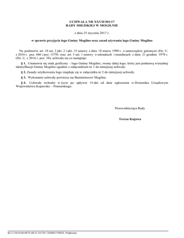 UCHWAŁA NR XXVII/301/17 RADY MIEJSKIEJ W MOGILNIE z dnia 25 stycznia 2017 r. w sprawie przyjęcia logo Gminy Mogilno oraz zasad używania logo Gminy Mogilno Na podstawie art. 18 ust. 2 pkt. 2 i pkt. 15 ustawy z dnia 18 marca 1990 r. o samorządzie gminnym (Dz. U. z 2016 r. poz. 446 i poz. 1579) oraz art. 3 ust. 1 ustawy o odznakach i mundurach z dnia 21 grudnia 1978 r. (Dz. U. z 2016 r. poz. 38), uchwala się co następuje: § 1. Ustanawia się znak graficzny – logo Gminy Mogilno, zwany dalej logo, który jest podstawą wizualnej identyfikacji Gminy Mogilno zgodnie z załącznikiem nr 1 do niniejszej uchwały. § 2. Zasady użytkowania logo znajduje się w załączniku nr 2 do niniejszej uchwały. § 3. Wykonanie uchwały powierza się Burmistrzowi Mogilna. § 4. Uchwała wchodzi w życie po upływie 14 dni od dnia ogłoszenia w Dzienniku Urzędowym Województwa Kujawsko – Pomorskiego. Przewodnicząca Rady Teresa Kujawa Id: C13616A0-0679-4E1C-8A7D-7AD062736024. Podpisany Załącznik Nr 1 do Uchwały Nr XXVII/301/17 Rady Miejskiej w Mogilnie z dnia 25 stycznia 2017 r. Id: C13616A0-0679-4E1C-8A7D-7AD062736024. Podpisany Załącznik Nr 2 do Uchwały Nr XXVII/301/17 Rady Miejskiej w Mogilnie z dnia 25 stycznia 2017 r. Zasady używania logo Gminy Mogilno 1. Logo Gminy Mogilno używają organy i jednostki organizacyjne Gminy Mogilno. 2. Logo mogą używać także inne osoby, w tym przedsiębiorcy i inne jednostki organizacyjne po wcześniejszym uzyskaniu pisemnej zgody Burmistrza Mogilna. 3. Logo może być używane tylko zgodnie ze wzorem graficznym określonym w uchwale. 4. Burmistrz Mogilna może udzielić zgodę na używanie logo w szczególności na wydawnictwach i drukach reklamowych, promocyjnych, stronach internetowych, winietach gazet i czasopism, budynkach, ubiorach, urządzeniach przedmiotach – jeżeli służą promocji Gminy Mogilno. 5. Zabrania się używania logo do działalności sprzecznej z prawem, zasadami współżycia społecznego lub dobrymi obyczajami. 6. Logo może być używane w sposób estetyczny zapewniający poszanowanie jego wizerunku. 7. Warunkiem uzyskania zgody jest złożenie wniosku wraz z opisem sposobu używania logo oraz projektem graficznym sposobu umieszczenia wizerunku logo. 8. Burmistrz Mogilna może cofnąć zgodę na używanie logo, jeżeli logo używane jest niezgodnie z niniejszymi warunkami oraz wskazaniami określonymi przez Burmistrza Mogilna. Burmistrz Mogilna prowadzi rejestr podmiotów używających logo. Id: C13616A0-0679-4E1C-8A7D-7AD062736024. Podpisany UZASADNIENIE DO UCHWAŁY Nr XXVII/301/17 RADY MIEJSKIEJ W MOGILNIE z dnia 25 stycznia 2017 r. w sprawie przyjęcia logo Gminy Mogilno oraz zasad używania logo Gminy Mogilno Na podstawie art. 3 ustawy z dnia 21 grudnia 1978 r. o odznakach mundurach, jednostki samorządu terytorialnego mogą ustanowić, w drodze uchwały organu stanowiącego danej jednostki, własne herby, flagi, emblematy oraz insygnia i inne symbole. Zgodnie z tym przepisem do wyłącznej własności rady gminy należy podejmowanie uchwał w sprawach herbu i innych symboli. Naczelny Sąd Administracyjny w wyroku z dnia 14 lutego 2001 r. sygn. Akt S.A./ Sz. 13499/99 przyznał jednostką samorządu terytorialnego prawo do posługiwania się własnym logo, podkreślając jednocześnie, podejmowanie uchwał w tym przedmiocie stanowi uprawnienia rady, które powinno być realizowane zgodnie z procedurą określoną w przepisach ustawy o odznakach i mundurach oraz ustawy o samorządzie gminnym. Zgodnie z ww. ustawą wzory symboli podlegają opiniowaniu przez Komisję Heraldyczną działającą przy Ministrze Administracji i Cyfryzacji. Zgodnie z wyrokiem WSA z 9 czerwca 2011 r. sygn. Akt IV SA/Po 233/11, jeżeli uchwała organu gminy dotyczy takich kategorii, które nie mają nic wspólnego z heraldyką, leksykologiom, czy tradycją historyczną, to opinia Komisji Heraldycznej nie jest wymagana. Zaproponowany projekt logo Gminy Mogilno jest wyłącznie identyfikującym znakiem graficznym, którego natura jest pokrewna z heraldyką z uwagi na cechy takie jak: lapidarność, wyrazistość, komunikatywność i przyswajalność. Logo nie jest jednak tworzone ani w oparciu o zasady sztuki heraldycznej ani leksykologii, a tym samym nie podlega ocenie Komisji Heraldycznej. Ustanowienie znaku graficznego – logo gminy Mogilno jest jednym z podstawowych elementów promocji Gminy. Id: C13616A0-0679-4E1C-8A7D-7AD062736024. Podpisany