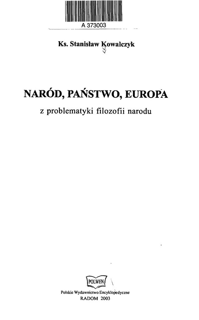 A 373003 Ks. Stanisław Kowalczyk NARÓD, PAŃSTWO, EUROPA z problematyki filozofii narodu Polskie Wydawnictwo Encyklopedyczne RADOM 2003 SPIS RZECZY Wstęp 7 R. I. Eksplikacja kategorii narodu i pojęć pokrewnych 13 1. Typy określeń narodu 13 2. Naród a narodowość, rasa, ojczyzna, nacjonalizm 27 R. II. Struktura ontologiczna narodu 39 1. Elementy przedmiotowe narodu 40 2. Elementy podmiotowe narodu 45 3. Proces formowania się świadomości narodowej 52 4. Charakterystyczne cechy polskości 62 R. III. Problem genezy narodów 73 1. Różnorodność genezy narodów 73 2. Naród a rodzina, ród, szczep, lud 79 3. Rola kultury i religii w powstawaniu narodów 85 4. Rola państwa i elit w genezie narodów 90 R. IV. Naród a państwo 97 1. Państwo narodowe a państwo wieloetniczne 97 2. Teoria nadrzędności państwa wobec narodu 102 3. Teoria nadrzędności narodu wobec państwa 108 4. Komplementarność narodu i państwa 114 R. V. Prawa narodu i obowiązki wobec niego 117 1. Prawa narodów (zasada samostanowienia) 117 2. Obowiązek patriotyzmu 126 3. Deformacja patriotyzmu - skrajny nacjonalizm R. VI. Kolektywistyczno-totalitarne koncepcje narodu 1. Faszyzm i hitlerowski rasizm 149 2. Naród w interpretacji marksizmu R. VII. Liberalizm a kategoria narodu 1. Liberalizm klasyczny 136 149 160 v . 171 171 2. Kosmopolityzm współczesnego neoliberalizmu 181 R. VIII. Rola narodów w procesach integracji Europy i globalizacji 191 1. Idea i proces integracji europejskiej 191 2. Proces globalizacji i jego dylematy etyczno-spoleczne 197 3. Zasady integracji narodów i państw 210 4. Modele integracji europejskiej: Europa ojczyzn czy Stany Zjednoczone Europy? Zakończenie 220 235 Bibliografia 239 Indeks 251