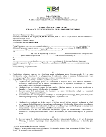 ZAŁĄCZNIK NR 1 DO REGULAMINU ŚWIADCZENIA USŁUG W RAMACH FUNKCJONOWANIA BIURA COWORKINGOWEGO UMOWA ŚWIADCZENIA USŁUG W RAMACH FUNKCJONOWANIA BIURA COWORKINGOWEGO Zawarta w Rzeszowie w dniu..........................pomiędzy: Stowarzyszeniem B-4, ul. Zagłoby 7b, 35-304 Rzeszów, NIP: 813-16-44-630, KRS 894, REGON 690427764 reprezentowanym przez: Beatę Sołtys – Prezes Zarządu zwanym dalej Stowarzyszenie B-4 I Panią/Panem ……………………. zamieszkałym: …………………………………………. prowadzącą/ym działalność gospodarczą pod nazwą ………, z siedzibą ……………………, wpisaną do CEIDG, PESEL: ……………….. NIP…………………., REGON…………………….* lub ………………………….Sp. z o.o. w organizacji z siedzibą …………., która to spółka została zawiązana dnia ………….. pod numerem Repertorium …………………… w Kancelarii Notarialnej w ………………….., ul………………………..,* lub …………………………..z siedzibą………………………, wpisaną do Krajowego Rejestru Sądowego prowadzonego przez Sąd…………. ….. Wydział……, pod numerem KRS………………, reprezentowaną przez………………….* zwaną/ym dalej „Użytkownikiem” 1. 2. §1 Przedmiotem niniejszej umowy jest określenie zasad świadczenia przez Stowarzyszenie B-4 na rzecz Użytkownika usług określonych w „Regulaminie Świadczenia usług w ramach funkcjonowania biura coworkingowego”, stanowiącego integralną część postanowień niniejszej umowy. Na podstawie niniejszej umowy i w trakcie jej obowiązywania: a) Użytkownikowi przysługuje prawo do korzystania z Miejsca pracy oraz zaplecza kuchenno – sanitarnego znajdującego się w Biurze coworkingowym; w wymiarze określonym w Cenniku i wybranym przez Użytkownika abonamencie b) Użytkownikowi przysługuje prawo do korzystania z Miejsca spotkań; w wymiarze określonym w Cenniku i wybranym przez Użytkownika abonamencie * c) Stowarzyszenie B-4 zobowiązuje się świadczyć na rzecz Użytkownika usługi, na warunkach określonych w Regulaminie i Cenniku d) Stowarzyszenie B-4 zobowiązuje się świadczyć na rzecz Użytkownika usługę „Przesyłanie na życzenie odebranej korespondencji na adres wskazany przez Użytkownika”** §2 1. Użytkownik zobowiązuje się do korzystania z Miejsca pracy i Miejsca spotkań* wyłącznie w celach prowadzenia obsługi biurowej, związanej z prowadzoną przez Użytkownika działalnością gospodarczą. 2. Użytkownik przyjmuje do wiadomości, że z Biura coworkingowego oraz Strefy pracy korzystają także inne podmioty i nie wnosi co do tego jakichkolwiek zastrzeżeń. 3. Stowarzyszenie B-4 nie ma obowiązku uzyskiwania zgody ani informowania Użytkownika o zawieraniu z innymi podmiotami umów, których przedmiotem jest Biuro coworkingowe, w tym Strefa pracy. §3 1. Stowarzyszenie B-4 będzie świadczyć na rzecz Użytkownika usługi określone w § 1 ust. 1 niniejszej Umowy, w ramach wybranego przez Użytkownika abonamentu określonego w Cenniku jako „……….”. * skreślić w przypadku abonamentu „Pół dnia” ** Dotyczy w przypadku zamówienia usługi przez Użytkownika, który wybrał abonament „Pół dnia” lub „1 Dzień”. W pozostałym przypadku skreślić 2. Z tytułu świadczenia przez Stowarzyszenie B-4 usług określonych w niniejszej Umowie, Stowarzyszeniu B-4 przysługuje wynagrodzenie określone w obowiązującym na dzień świadczenia usług Cenniku. 3. Wynagrodzenie o którym mowa w ust. 2, płatne będzie za dany okres rozliczeniowy z góry, na podstawie faktury VAT wystawionej przez Stowarzyszenie B-4, na rachunek bankowy w niej wskazany, w terminie 7 dni od daty jej wystawienia. 4. Rozwiązanie niniejszej umowy przez Użytkownika (bez względu na przyczynę) lub rozwiązanie niniejszej umowy przez Stowarzyszenie B-4 z przyczyn określonych w §5 ust. 3 niniejszej Umowy nie może stanowić podstawy żądania obniżenia należnego Stowarzyszeniu B-4 wynagrodzenia za dany okres rozliczeniowy. 5. Użytkownik upoważnia Stowarzyszenie B-4 do wystawiania faktur VAT bez jego podpisu. 6. Użytkownik upoważnia Stowarzyszenie B-4 do przesyłania faktur VAT drogą elektroniczną na adres…… §4 1. Użytkownik nie może dokonywać jakichkolwiek zmian w przedmiocie umowy ani czynić na niego jakichkolwiek nakładów. 2. Wszelkie uszkodzenia lub zniszczenie jakiegokolwiek mienia znajdującego się w Biurze coworkingowym, musi być niezwłocznie zgłoszone Stowarzyszeniu B-4. 3. Użytkownikowi nie przysługuje prawo podnajmu, użyczenia lub oddania w dzierżawę osobie trzeciej Miejsca pracy lub Miejsca spotkań bez uprzedniej zgody Stowarzyszenia B-4, wyrażonej przez Stowarzyszenie B-4 w formie pisemnej pod rygorem nieważności. 4. Użytkownik nie może bez uprzedniej zgody Stowarzyszenia B-4, wyrażonej przez Stowarzyszenie B-4 w formie pisemnej pod rygorem nieważności, przenieść praw i obowiązków wynikających z niniejszej umowy, na osobę trzecią. 5. Użytkownik odpowiada za działania zaproszonych przez niego gości jak za własne i ponosi w tym zakresie pełną odpowiedzialność. §5 1. Umowa zostaje zawarta na czas nieokreślony. 2. Każdej ze stron przysługuje prawo do rozwiązania niniejszej Umowy z zachowaniem 1-tygodniowego okresu wypowiedzenia. 3. Stowarzyszenie B-4 ma prawo do rozwiązania niniejszej umowy bez zachowania okresu wypowiedzenia w przypadku rażącego naruszenia jej postanowień przez Użytkownika, w szczególności, gdy: a) Użytkownik odda przedmiot najmu w podnajem, użyczy lub odda w dzierżawę osobie trzeciej bez uprzedniej pisemnej zgody Wynajmującego; b) Użytkownik opóźnia się z zapłata należnego Stowarzyszeniu B-4 wynagrodzenia; c) Użytkownik narusza postanowienia Regulaminu 4. Rozwiązanie niniejszej umowy w wyniku wypowiedzenia złożonego przez Użytkownika lub w trybie określonym w ust. 3