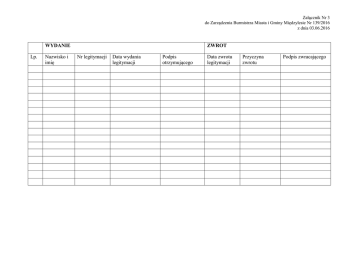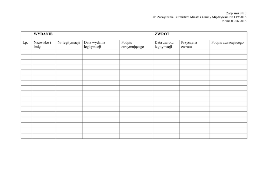 Załącznik Nr 3 do Zarządzenia Burmistrza Miasta i Gminy Międzylesie Nr 139/2016 z dnia 03.06.2016 WYDANIE Lp. Nazwisko i imię ZWROT Nr legitymacji Data wydania legitymacji Podpis otrzymującego Data zwrotu legitymacji Przyczyna zwrotu Podpis zwracającego