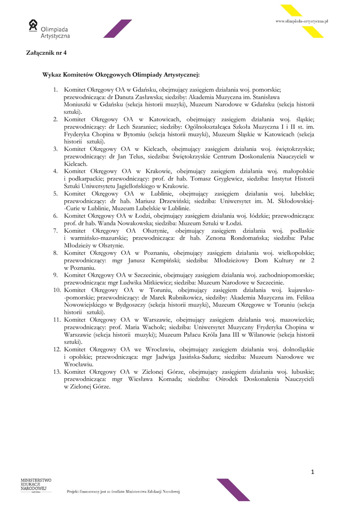 Załącznik nr 4 Wykaz Komitetów Okręgowych Olimpiady Artystycznej: 1. Komitet Okręgowy OA w Gdańsku, obejmujący zasięgiem działania woj. pomorskie; przewodnicząca: dr Danuta Zasławska; siedziby: Akademia Muzyczna im. Stanisława Moniuszki w Gdańsku (sekcja historii muzyki), Muzeum Narodowe w Gdańsku (sekcja historii sztuki). 2. Komitet Okręgowy OA w Katowicach, obejmujący zasięgiem działania woj. śląskie; przewodniczący: dr Lech Szaraniec; siedziby: Ogólnokształcąca Szkoła Muzyczna I i II st. im. Fryderyka Chopina w Bytomiu (sekcja historii muzyki), Muzeum Śląskie w Katowicach (sekcja historii sztuki). 3. Komitet Okręgowy OA w Kielcach, obejmujący zasięgiem działania woj. świętokrzyskie; przewodniczący: dr Jan Telus, siedziba: Świętokrzyskie Centrum Doskonalenia Nauczycieli w Kielcach. 4. Komitet Okręgowy OA w Krakowie, obejmujący zasięgiem działania woj. małopolskie i podkarpackie; przewodniczący: prof. dr hab. Tomasz Gryglewicz, siedziba: Instytut Historii Sztuki Uniwersytetu Jagiellońskiego w Krakowie. 5. Komitet Okręgowy OA w Lublinie, obejmujący zasięgiem działania woj. lubelskie; przewodniczący: dr hab. Mariusz Drzewiński; siedziba: Uniwersytet im. M. Skłodowskiej-Curie w Lublinie, Muzeum Lubelskie w Lublinie. 6. Komitet Okręgowy OA w Łodzi, obejmujący zasięgiem działania woj. łódzkie; przewodnicząca: prof. dr hab. Wanda Nowakowska; siedziba: Muzeum Sztuki w Łodzi. 7. Komitet Okręgowy OA Olsztynie, obejmujący zasięgiem działania woj. podlaskie i warmińsko-mazurskie; przewodnicząca: dr hab. Zenona Rondomańska; siedziba: Pałac Młodzieży w Olsztynie. 8. Komitet Okręgowy OA w Poznaniu, obejmujący zasięgiem działania woj. wielkopolskie; przewodniczący: mgr Janusz Kempiński; siedziba: Młodzieżowy Dom Kultury nr 2 w Poznaniu. 9. Komitet Okręgowy OA w Szczecinie, obejmujący zasięgiem działania woj. zachodniopomorskie; przewodnicząca: mgr Ludwika Mitkiewicz; siedziba: Muzeum Narodowe w Szczecinie. 10. Komitet Okręgowy OA w Toruniu, obejmujący zasięgiem działania woj. kujawsko-pomorskie; przewodniczący: dr Marek Rubnikowicz, siedziby: Akademia Muzyczna im. Feliksa Nowowiejskiego w Bydgoszczy (sekcja historii muzyki), Muzeum Okręgowe w Toruniu (sekcja historii sztuki). 11. Komitet Okręgowy OA w Warszawie, obejmujący zasięgiem działania woj. mazowieckie; przewodniczący: prof. Maria Wacholc; siedziba: Uniwersytet Muzyczny Fryderyka Chopina w Warszawie (sekcja historii muzyki); Muzeum Pałacu Króla Jana III w Wilanowie (sekcja historii sztuki). 12. Komitet Okręgowy OA we Wrocławiu, obejmujący zasięgiem działania woj. dolnośląskie i opolskie; przewodnicząca: mgr Jadwiga Jasińska-Sadura; siedziba: Muzeum Narodowe we Wrocławiu. 13. Komitet Okręgowy OA w Zielonej Górze, obejmujący zasięgiem działania woj. lubuskie; przewodnicząca: mgr Wiesława Komada; siedziba: Ośrodek Doskonalenia Nauczycieli w Zielonej Górze. 1
