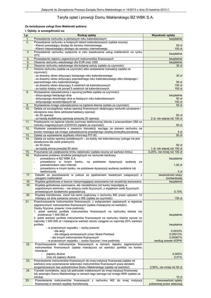 Załącznik do Zarządzenia Prezesa Zarządu Domu Maklerskiego nr 14/2013 z dnia 23 kwietnia 2013 r. Taryfa opłat i prowizji Domu Maklerskiego BZ WBK S.A. Za świadczone usługi Dom Maklerski pobiera: I. Opłaty, w szczególności za: Lp. 1. 2. 3. 4. 5. 6. 7. 8. 9. 10. 11. 12. 13. 14. 15. 16. 17. 18. 19. 20. 21. 22. 23. 24. 25. Rodzaj opłaty Prowadzenie rachunku w pierwszym roku kalendarzowym Prowadzenie rachunku w kolejnych latach kalendarzowych (opłata roczna): - Klienci posiadający dostęp do serwisu internetowego - Klienci nieposiadający dostępu do serwisu internetowego Prowadzenie rachunku wyłącznie w celu świadczenia usług maklerskich na rynku OTC Prowadzenie rejestru zagranicznych instrumentów finansowych Otwarcie rachunku walutowego dla EUR oraz USD Otwarcie rachunku walutowego dla kolejnej waluty (opłata za czynność) Historia rachunku (opłata za czynność) albo zestawienie transakcji (opłata za czynność): - za dowolny okres dotyczący bieżącego roku kalendarzowego - za dowolny okres dotyczący poprzedniego roku kalendarzowego albo bieżącego i poprzedniego roku kalendarzowego - za dowolny okres dotyczący 5 ostatnich lat kalendarzowych - za każdy kolejny rok ponad 5 ostatnich lat kalendarzowych Wystawienie zaświadczenia z wyceną portfela (opłata za czynność): - dotyczącego bieżącego dnia - dotyczącego dowolnego dnia w bieżącym roku kalendarzowym - dotyczącego wcześniejszych lat Wystawienie innego zaświadczenia na żądanie klienta (opłata za czynność) Opłata za szczegółowy wykaz operacji finansowych obejmujący rachunki uznawane i obciążane oraz dane adresata/nadawcy operacji: - do 20 operacji - za każdą dodatkową operację powyżej 20 operacji Przekazanie na żądanie klienta rozmowy telefonicznej klienta z pracownikiem DM na nośniku magnetycznym (CD/DVD) (opłata za czynność) Wysłanie zawiadomienia o zawarciu transakcji, wyciągu ze stanem rachunku na koniec miesiąca lub innego zaświadczenia przesłanego zwykłą przesyłką pocztową Opłata za wystawienie duplikatu informacji PIT-8C Opłata za wykaz operacji podatkowych – za każdy rok kalendarzowy (usługa nie jest świadczona dla osób prawnych): - do 50 stron - za każdą stronę powyżej 50 stron Przyznanie lub zwiększenie limitu należności (opłata roczna od wartości limitu) Wykonanie przelewu środków pieniężnych na rachunek bankowy: prowadzony w BZ WBK S.A. prowadzony w innym banku, na podstawie dyspozycji wydanej za pośrednictwem sieci Internet prowadzony w innym banku, na podstawie dyspozycji wydanej osobiście lub telefonicznie Odsetki za pozostawanie w zwłoce ze spełnieniem świadczeń związanych z usługami maklerskimi Wypłata gotówkowa w kwocie niewymagającej awizowania lub wcześniej awizowana Wypłata gotówkowa awizowana, ale nieodebrana (od kwoty niepodjętej w uzgodnionym terminie) – nie dotyczy osób fizycznych, z wyjątkiem osób fizycznych prowadzących działalność gospodarczą Wypłata transferowa, zwrot lub zwrot częściowy z rachunku IKE przed upływem 12 miesięcy od dnia zawarcia umowy o IKE (opłata za czynność) Przechowywanie instrumentów finansowych, z wyłączeniem zapisanych w rejestrze zagranicznych instrumentów finansowych (opłata miesięczna od wartości) Osoby fizyczne, prawne i inne podmioty: 1. jeżeli wartość portfela instrumentów finansowych na rachunku klienta nie przekracza 1 000 000 zł 2. jeżeli wartość portfela instrumentów finansowych na rachunku klienta wynosi co najmniej 1 000 000 zł i miesięczna wartość obrotu osiągnie co najmniej 20% wartości portfela - w przeciwnym wypadku – osoby prawne: - dla akcji - dla obligacji emitowanych przez Skarb Państwa - dla innych instrumentów finansowych - w przeciwnym wypadku – osoby fizyczne i inne podmioty Przechowywanie instrumentów finansowych w ramach rejestru zagranicznych instrumentów finansowych (opłata miesięczna od wartości portfela na koniec miesiąca): - papiery dłużne - inne niż papiery dłużne Przeniesienie instrumentów finansowych do innej instytucji finansowej (opłata od wartości) oraz przeniesienie własności instrumentów finansowych poza obrotem zorganizowanym bez pośrednictwa Domu Maklerskiego (opłata od wartości) Transfer kontraktów, opcji lub jednostek indeksowych do innej instytucji finansowej lub wewnątrz Domu Maklerskiego w ramach tego samego lub innego NKK (opłata za sztukę) Przeniesienie instrumentów finansowych z rachunku IKE do innej instytucji finansowej w ramach wypłaty transferowej Wysokość opłaty bezpłatnie 55 zł 100 zł bezpłatnie bezpłatnie bezpłatnie 30 zł 30 zł 50 zł 100 zł 100 zł bezpłatnie 50 zł 100 zł 50 zł 50 zł 2 zł, nie więcej niż 100 zł 50 zł 5 zł 50 zł 50 zł 1 zł, nie więcej niż 100 zł 0,20%, nie mniej niż 100 zł bezpłatnie 1,50 zł 5 zł dwukrotność stopy lombardowej bezpłatnie 0,15% 150 zł bezpłatnie bezpłatnie 0,0033% 0,00013% 0,00067% według stawek KDPW 0,005% 0,01% 0,50%, nie mniej niż 50 zł 10 zł równowartość opłaty pobieranej przez właściwą izbę rozrachunkową 26. 27. 28. 29. 30. 31. Przeniesienie własności instrumentów finansowych na podstawie postępowania spadkowego (opłata za czynność od każdego instrumentu finansowego) Zamiana akcji imiennych na akcje na okaziciela lub akcji na okaziciela na akcje imienne (opłata za czynność) Ustanowienie blokady na instrumentach finansowych z tytułu umów zawieranych przez klienta z osobami trzecimi (liczona od wartości przedmiotu blokady) Wystawienie świadectwa depozytowego z wyłączeniem świadectw wystawianych w związku z ogłoszonym wezwaniem (opłata za czynność) Wystawienie imiennego zaświadczenia o prawie uczestnictwa w Walnym Zgromadzeniu: - bez odbioru wystawionego zaświadczenia - odbiór osobisty lub dostarczenie wystawionego zaświadczenia listem do emitenta - dostarczenie wystawionego zaświadczenia kurierem do emitenta Zamknięcie pozycji w związku z w