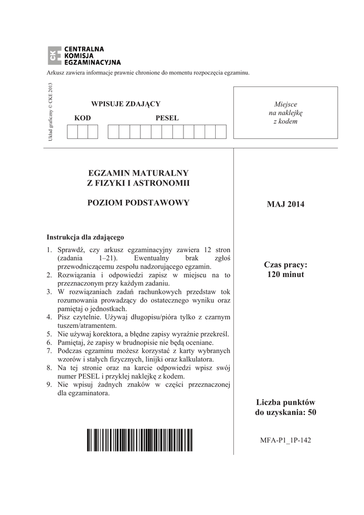 Ukáad graficzny © CKE 2013 Arkusz zawiera inform macje prawnie chronione do d momentu ro ozpoczĊcia eggzaminu. WPISUJE ZD DAJĄCY KOD PE ESEL Miejscee na naklejjkĊ z kodem m EG GZAMIN MATUR RALNY Z FIZYKI F I ASTRON NOMII PO OZIOM PO ODSTAW WOWY MAJ 20 014 Instru ukcja dla zd dającego 1. SprrawdĨ, czyy arkusz eggzaminacyjny zawieraa 12 stronn (zaadania 1–21). Ewentualnny brak k zgáoĞĞ przzewodnicząącemu zespooáu nadzorujjącego egzaamin. 2. Roozwiązania i odpowieedzi zapiszz w miejsscu na too przzeznaczonym m przy kaĪddym zadaniiu. 3. W rozwiązanniach zadaĔĔ rachunkoowych przeedstaw tokk rozzumowania prowadząccy do ostattecznego wyniku w orazz pam miĊtaj o jeddnostkach. 4. Pissz czytelniee. UĪywaj dáugopisu/p d pióra tylko z czarnym m tusszem/atrameentem. 5. Niee uĪywaj koorektora, a báĊdne b zapissy wyraĨniee przekreĞl. 6. Pam miĊtaj, Īe zapisy w bruudnopisie niie bĊdą ocen niane. 7. Poddczas egzam minu moĪeesz korzystaaü z karty wybranychh wzzorów i staáyych fizycznyych, linijki oraz kalkullatora. 8. Naa tej stroniie oraz na karcie odppowiedzi wpisz w swój num mer PESEL L i przyklej naklejkĊ z kodem. k 9. Niee wpisuj Īadnych Ī znnaków w czĊĞci przzeznaczonej dlaa egzaminattora. Czas pra acy: 120 min nut Liiczba pun nktów doo uzyskan nia: 50 M MFA-P1_1P P-142 Egzamin maturalny z fizyki i astronomii Poziom podstawowy 2 Zadania zamkniĊte W zadaniach od 1. do 10. wybierz jedną poprawną odpowiedĨ i zaznacz ją na karcie odpowiedzi. Zadanie 1. (1 pkt) PasaĪer siedzący w przedziale pociągu poruszającego siĊ z prĊdkoĞcią o wartoĞci 10 ୫ ୱ widzi przez 6 s pociąg jadący w przeciwną stronĊ. JeĞli dáugoĞü mijanego pociągu jest równa 150 m, to wartoĞü jego prĊdkoĞci wynosi A. v = 15 ୫ ୱ B. v = 20 ୫ ୱ C. v = 25 ୫ ୱ Zadanie 2. (1 pkt) Na sanki o masie 2 kg poruszające siĊ z prĊdkoĞcią o wartoĞci 6 D. v = 35 ୫ ୱ ୫ ୱ zaczĊáa dziaáaü staáa siáa hamująca, która zatrzymaáa te sanki w czasie 4 s. WartoĞü siáy hamującej wynosi okoáo A. 1,5 N. B. 3 N. C. 4 N. D. 6 N. Zadanie 3. (1 pkt) RozwaĪamy zaleĪnoĞü siáy tarcia od nastĊpujących czynników: siáy wzajemnego nacisku ciaá, rodzaju stykających siĊ ze sobą powierzchni, stopnia wygáadzenia powierzchni oraz wielkoĞci powierzchni styku. JeĞli zmieniamy tylko jeden z tych czterech czynników, to okazuje siĊ, Īe wartoĞü siáy tarcia nie zaleĪy od A. B. C. D. siáy nacisku ciaá. rodzaju stykających siĊ powierzchni. wielkoĞci powierzchni styku. stopnia wygáadzenia powierzchni. Zadanie 4. (1 pkt) Dwoje uczniów ogląda film, w którym zaáoga statku kosmicznego podczas bitwy w przestrzeni miĊdzyplanetarnej widzi wybuch innego statku i po chwili sáyszy odgáos wybuchu. Uczniowie uwaĪają, Īe nie jest to realne. Uczniowie A. B. C. D. mają racjĊ, poniewaĪ fale dĨwiĊkowe nie przenikają przez kadáub statku kosmicznego. mają racjĊ, poniewaĪ fale dĨwiĊkowe nie rozchodzą siĊ w próĪni. mają racjĊ, poniewaĪ w próĪni dĨwiĊk biegnie z prĊdkoĞcią równą prĊdkoĞci Ğwiatáa. nie mają racji, poniewaĪ odgáos wybuchu byáby rzeczywiĞcie sáyszalny. Zadanie 5. (1 pkt) Trzy zamkniĊte naczynia mają jednakową objĊtoĞü. W pierwszym znajduje siĊ 64 g tlenu, w drugim – 84 g azotu, a w trzecim – 8 g wodoru. Temperatury tych gazów są jednakowe. Masa jednego mola tlenu wynosi 32 g, azotu – 28 g i wodoru – 2 g. CiĞnienie gazu jest A. B. C. D. najwiĊksze w naczyniu z tlenem. najwiĊksze w naczyniu z azotem. najwiĊksze w naczyniu z wodorem. jednakowe we wszystkich naczyniach. Egzamin maturalny z fizyki i astronomii Poziom podstawowy 3 Zadanie 6. (1 pkt) Naáadowana cząstka wpada w próĪni w obszar jednorodnego pola prostopadle do linii tego pola. Cząstka w obszarze pola porusza siĊ po okrĊgu. Opisana sytuacja moĪe mieü miejsce w A. B. C. D. polu magnetycznym. polu grawitacyjnym. polu elektrostatycznym. kaĪdym z trzech pól wyĪej wymienionych. Zadanie 7. (1 pkt) Maáa kieszonkowa latarka zawiera punktowo Ğwiecącą diodĊ i wklĊsáe zwierciadáo kuliste o promieniu krzywizny 12 mm. Latarka Ğwieci równolegáą wiązką, gdy dioda znajduje siĊ A. B. C. D. w Ğrodku krzywizny zwierciadáa. 12 mm od Ğrodka krzywizny w kierunku od zwierciadáa. 6 mm od Ğrodka krzywizny w kierunku zwierciadáa. 6 mm od Ğrodka krzywizny w kierunku od zwierciadáa. Zadanie 8. (1 pkt) W obserwacji wnĊtrza samochodu czĊsto przeszkadza nam Ğwiatáo odbite od szyby. Aby zminimalizowaü ten efekt, obserwator moĪe uĪyü specjalnych filtrów, które wykorzystują zjawisko A. B. C. D. zaáamania Ğwiatáa. dyfrakcji Ğwiatáa. interferencji Ğwiatáa. polaryzacji Ğwiatáa. Zadanie 9. (1 pkt) Na powierzchniĊ szkáa o wspóáczynniku zaáamania 1,5 pada wiązka Ğwiatáa o czĊstotliwoĞci 6,9·1014 Hz. CzĊstotliwoĞü fali tego Ğwiatáa w szkle jest równa A. 4,6·1014 Hz. B. 6,9·1014 Hz. C. 10,35·1014 Hz. D. 13,8·1014 Hz. Zadanie 10. (1 pkt) Izotop polonu 210Po ulega rozpadowi z czasem poáowicznego zaniku równym 138 dni i przechodzi w stabilny izotop oáowiu 206Pb. Początkowo w próbce znajdowaá siĊ wyáącznie polon, a liczba jego jąder wynosiáa 1,2·1010. Po upáywie 414 dni w próbce bĊdzie A. B. C. D. 0,4·1010 jąder polonu i 0,8·1010 jąder oáowiu. 0,8·1010 jąder polonu i 0,4·1010 jąder oáowiu. 1,5·109 jąder polonu i 1,05·1010 jąder oáowiu. 1,05·1010 jąder polonu i 1,5·109 jąder oáowiu. Egzamin maturalny z fizyki i astronomii Poziom podstawowy 4 Zadania otwarte Rozwiązania zadaĔ o numerach od 11. do 21. naleĪy zapisaü w wyznaczonych miejscach pod treĞcią zadania. Zadanie 11. Winda (4 pkt) Winda jedzie 15 sekund z parteru na trzecie piĊtro bez zatrzymywania siĊ. Przez pierwsze 2 sekundy winda porusza siĊ ruchem jednostajnie przyspieszonym, potem – ruchem jednostajnym, a przez 2 ostatnie sekundy przed zatrzymaniem – ruchem jednostajnie ୫ opóĨnionym. WartoĞci p