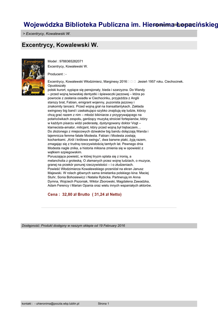 Utworzono : 08Łopacińskieg March 2017 Wojewódzka Biblioteka Publiczna im. Hieronima > Excentrycy, Kowalewski W. Excentrycy, Kowalewski W. Model : 9788365282071 Excentrycy, Kowalewski W. Producent : Excentrycy, Kowalewski Włodzimierz, Marginesy 2016��� Jesień 1957 roku. Ciechocinek. Opustoszały polski kurort, sypiące się pensjonaty, bieda i szarzyzna. Do Wandy – przed wojną lwowskiej dentystki i śpiewaczki jazzowej – która po powrocie z zesłania osiadła w Ciechocinku, przyjeżdża z Anglii starszy brat, Fabian, emigrant wojenny, puzonista jazzowy i znakomity tancerz. Przed wojną grał na transatlantykach. Zakłada swingowy big band i zaskakująco szybko znajdują się ludzie, którzy chcą grać razem z nim – młodzi bikiniarze z przygrywającego na potańcówkach zespołu, gardzący muzyką stroiciel fortepianów, który w każdym pisarzu widzi pederastę, dystyngowany doktor Vogt – klarnecista-amator, milicjant, który przed wojną był trębaczem… Do złożonego z miejscowych dziwaków big bandu dołączają Wanda i tajemnicza femme fatale Modesta. Fabian i Modesta zostają kochankami. „Król i królowa swingu”, dwa barwne ptaki, żyją razem, zmagając się z trudną rzeczywistością tamtych lat. Pewnego dnia Modesta nagle znika, a historia miłosna zmienia się w opowieść z wątkiem szpiegowskim. Poruszająca powieść, w której liryzm splata się z ironią, a melancholia z groteską. O złamanych przez wojnę ludziach, o muzyce, granej na przekór ponurej rzeczywistości – i o złudzeniach. Powieść Włodzimierza Kowalewskiego przeniósł na ekran Janusz Majewski. W rolach głównych sama śmietanka polskiego kina: Maciej Stuhr, Sonia Bohosiewicz i Natalia Rybicka. Partnerują im Anna Dymna, Wojciech Pszoniak, Wiktor Zborowski, Magdalena Zawadzka, Adam Ferency i Marian Opania oraz wielu innych wspaniałych aktorów. Cena : 32,80 zł Brutto ( 31,24 zł Netto) Dostępność: Produkt dostępny w naszym sklepie od 19 February 2016 kontakt : - [email protected] Strona 1
