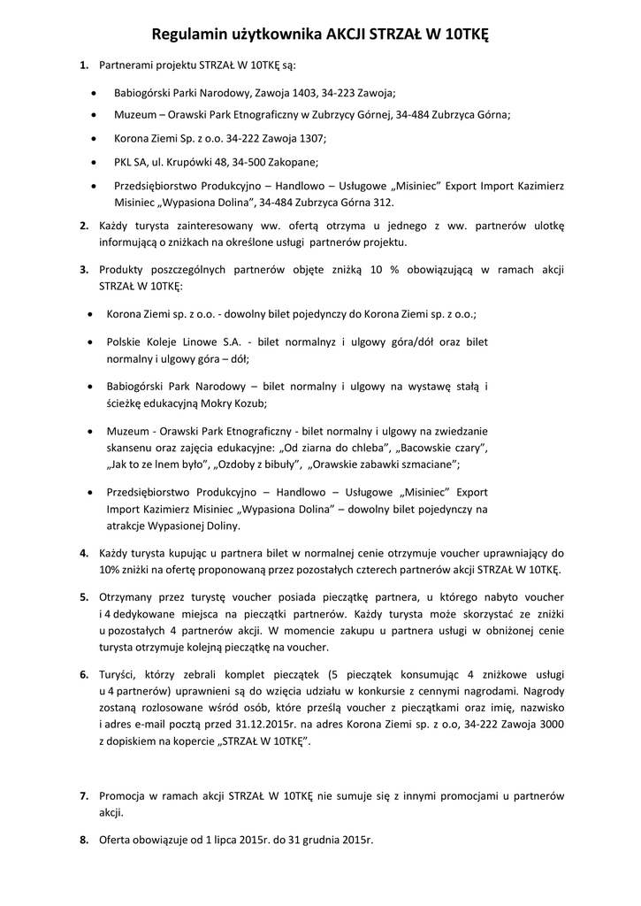 Regulamin użytkownika AKCJI STRZAŁ W 10TKĘ 1. Partnerami projektu STRZAŁ W 10TKĘ są: · Babiogórski Parki Narodowy, Zawoja 1403, 34-223 Zawoja; · Muzeum – Orawski Park Etnograficzny w Zubrzycy Górnej, 34-484 Zubrzyca Górna; · Korona Ziemi Sp. z o.o. 34-222 Zawoja 1307; · PKL SA, ul. Krupówki 48, 34-500 Zakopane; · Przedsiębiorstwo Produkcyjno – Handlowo – Usługowe „Misiniec” Export Import Kazimierz Misiniec „Wypasiona Dolina”, 34-484 Zubrzyca Górna 312. 2. Każdy turysta zainteresowany ww. ofertą otrzyma u jednego z ww. partnerów ulotkę informującą o zniżkach na określone usługi partnerów projektu. 3. Produkty poszczególnych partnerów objęte zniżką 10 % obowiązującą w ramach akcji STRZAŁ W 10TKĘ: · Korona Ziemi sp. z o.o. - dowolny bilet pojedynczy do Korona Ziemi sp. z o.o.; · Polskie Koleje Linowe S.A. - bilet normalnyz i ulgowy góra/dół oraz bilet normalny i ulgowy góra – dół; · Babiogórski Park Narodowy – bilet normalny i ulgowy na wystawę stałą i ścieżkę edukacyjną Mokry Kozub; · Muzeum - Orawski Park Etnograficzny - bilet normalny i ulgowy na zwiedzanie skansenu oraz zajęcia edukacyjne: „Od ziarna do chleba”, „Bacowskie czary”, „Jak to ze lnem było”, „Ozdoby z bibuły”, „Orawskie zabawki szmaciane”; · Przedsiębiorstwo Produkcyjno – Handlowo – Usługowe „Misiniec” Export Import Kazimierz Misiniec „Wypasiona Dolina” – dowolny bilet pojedynczy na atrakcje Wypasionej Doliny. 4. Każdy turysta kupując u partnera bilet w normalnej cenie otrzymuje voucher uprawniający do 10% zniżki na ofertę proponowaną przez pozostałych czterech partnerów akcji STRZAŁ W 10TKĘ. 5. Otrzymany przez turystę voucher posiada pieczątkę partnera, u którego nabyto voucher i 4 dedykowane miejsca na pieczątki partnerów. Każdy turysta może skorzystać ze zniżki u pozostałych 4 partnerów akcji. W momencie zakupu u partnera usługi w obniżonej cenie turysta otrzymuje kolejną pieczątkę na voucher. 6. Turyści, którzy zebrali komplet pieczątek (5 pieczątek konsumując 4 zniżkowe usługi u 4 partnerów) uprawnieni są do wzięcia udziału w konkursie z cennymi nagrodami. Nagrody zostaną rozlosowane wśród osób, które prześlą voucher z pieczątkami oraz imię, nazwisko i adres e-mail pocztą przed 31.12.2015r. na adres Korona Ziemi sp. z o.o, 34-222 Zawoja 3000 z dopiskiem na kopercie „STRZAŁ W 10TKĘ”. 7. Promocja w ramach akcji STRZAŁ W 10TKĘ nie sumuje się z innymi promocjami u partnerów akcji. 8. Oferta obowiązuje od 1 lipca 2015r. do 31 grudnia 2015r.