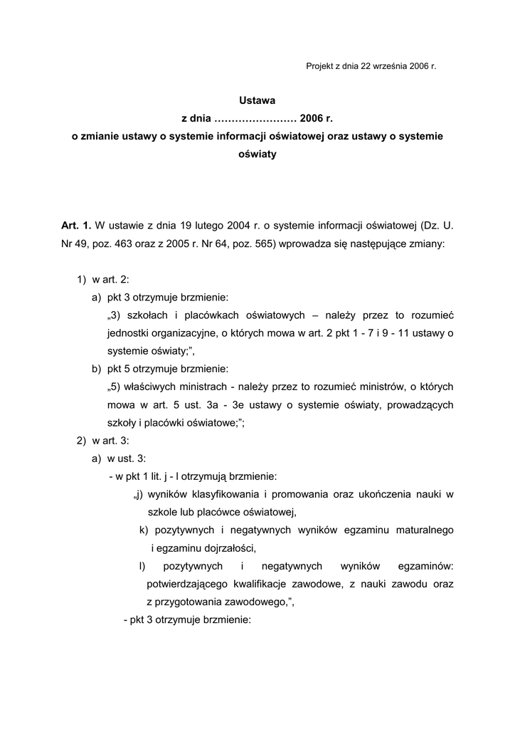 Projekt z dnia 22 września 2006 r. Ustawa z dnia …………………… 2006 r. o zmianie ustawy o systemie informacji oświatowej oraz ustawy o systemie oświaty Art. 1. W ustawie z dnia 19 lutego 2004 r. o systemie informacji oświatowej (Dz. U. Nr 49, poz. 463 oraz z 2005 r. Nr 64, poz. 565) wprowadza się następujące zmiany: 1) w art. 2: a) pkt 3 otrzymuje brzmienie: „3) szkołach i placówkach oświatowych – naleŜy przez to rozumieć jednostki organizacyjne, o których mowa w art. 2 pkt 1 - 7 i 9 - 11 ustawy o systemie oświaty;”, b) pkt 5 otrzymuje brzmienie: „5) właściwych ministrach - naleŜy przez to rozumieć ministrów, o których mowa w art. 5 ust. 3a - 3e ustawy o systemie oświaty, prowadzących szkoły i placówki oświatowe;”; 2) w art. 3: a) w ust. 3: - w pkt 1 lit. j - l otrzymują brzmienie: „j) wyników klasyfikowania i promowania oraz ukończenia nauki w szkole lub placówce oświatowej, k) pozytywnych i negatywnych wyników egzaminu maturalnego i egzaminu dojrzałości, l) pozytywnych i negatywnych wyników egzaminów: potwierdzającego kwalifikacje zawodowe, z nauki zawodu oraz z przygotowania zawodowego,”, - pkt 3 otrzymuje brzmienie: „3) liczbie uczniów, słuchaczy i wychowanków w dniu zakończenia poprzedniego roku szkolnego, z wyłączeniem wychowanków przedszkoli;”, b) w ust. 4 dodaje się pkt 4 w brzmieniu: „4) łącznej liczbie nauczycieli, o których mowa w art. 1 ust. 1 i 1a oraz ust. 2 pkt 1 Karty Nauczyciela, z którymi w danym roku kalendarzowym rozwiązano lub planowane jest rozwiązanie stosunku pracy albo których stosunek pracy wygasł lub wygaśnie, według przyczyn rozwiązania lub wygaśnięcia stosunku pracy.”, c) po ust. 4 dodaje się ust. 4a w brzmieniu: „4a. W zbiorach danych, o których mowa w ust. 4 pkt 1 lit. e, l i m oraz pkt 2 i 4, nie gromadzi się danych dotyczących nauczycieli, o których mowa w art. 2 Karty Nauczyciela.”; 3) w art. 4: a) ust. 2 otrzymuje brzmienie: „2. Jednostki organizacyjne, o których mowa w art. 1 ust. 1 pkt 2 i ust. 1a Karty Nauczyciela, prowadzą bazy danych oświatowych obejmujące dotyczące ich zbiory danych, o których mowa w art. 3 ust. 4 pkt 1, 2 i 4.”, b) ust. 5 otrzymuje brzmienie: „5. Gminy prowadzą bazy danych oświatowych obejmujące dotyczące ich zbiory danych, o których mowa w art. 3 ust. 3 pkt 2 lit. c oraz w art. 3 ust. 5.”, c) po ust. 5 dodaje się ust. 5a i 5b w brzmieniu: „5a. Powiaty prowadzą bazy danych oświatowych obejmujące dotyczące ich zbiory danych, o których mowa w art. 3 ust. 3 pkt 2 lit. c. 5b. Samorządy województw prowadzą bazy danych oświatowych obejmujące dotyczące ich zbiory danych, o których mowa w art. 3 ust. 3 pkt 2 lit. c.”, d) w ust. 6 pkt 2 otrzymuje brzmienie: „2) zbiory danych, o których mowa w art. 3 ust. 4 pkt 1, 2 i 4, z baz danych oświatowych jednostek organizacyjnych, o których mowa w art. 1 ust. 1a Karty Nauczyciela;”, e) ust. 7 i 8 otrzymują brzmienie: 2 „7. Właściwi ministrowie prowadzą bazy danych oświatowych obejmujące: 1) zbiory danych z baz danych oświatowych: a) szkół i placówek oświatowych prowadzonych przez tych ministrów, b) szkół i placówek oświatowych, publicznych i niepublicznych, prowadzonych przez inne niŜ jednostki samorządu terytorialnego osoby prawne i osoby fizyczne, dla których są odpowiednio organem właściwym do wydania zezwolenia, o którym mowa w art. 58 ust. 3 ustawy o systemie oświaty, albo organem prowadzącym ewidencję, o której mowa w art. 82 ust. 1a ustawy o systemie oświaty; 2) zbiory danych z baz danych oświatowych niepublicznych zakładów kształcenia nauczycieli; 3) zbiory danych z baz danych oświatowych niepublicznych kolegiów pracowników słuŜb społecznych; 4) zbiory danych z baz danych oświatowych jednostek organizacyjnych, o których mowa w art. 1 ust. 1 pkt 2 Karty Nauczyciela; 5) zbiory danych, o których mowa w art. 3 ust. 4 pkt 1, 2 i 4, w stosunku do zatrudnionych na stanowiskach pedagogicznych pracowników urzędu wymagających obsługującego kwalifikacji właściwego ministra, specjalistycznej jednostki nadzoru i organów sprawujących nadzór pedagogiczny, o których mowa w art. 1 ust. 2 pkt 1 lit. c i e Karty Nauczyciela; 6) zbiory danych, o których mowa w art. 3 ust. 3 pkt 1 lit. a – h, k i l dotyczące absolwentów, oraz o których mowa w art. 3 ust. 3 pkt 3, w szkołach zlikwidowanych z końcem poprzedniego roku szkolnego, dla których minister był organem sprawującym nadzór pedagogiczny; 7) dotyczące ich zbiory danych, o których mowa w art. 3 ust. 3 pkt 2 lit. c. 8. Kuratorzy oświaty prowadzą bazy danych oświatowych obejmujące: 1) zbiory danych z baz danych oświatowych prowadzonych przez jednostki samorządu terytorialnego na terenie województwa; 2) zbiory danych z baz danych oświatowych niepublicznych placówek doskonalenia nauczycieli; 3) zbiory danych, o których mowa w art. 3 ust. 4, w stosunku do pracowników zatrudnionych w kuratorium oświaty; 3 4) zbiory danych, o których mowa w art. 3 ust. 3 pkt 1 lit. a – h, k i l dotyczące absolwentów, oraz o których mowa w art. 3 ust. 3 pkt 3, w szkołach zlikwidowanych z końcem poprzedniego roku szkolnego, dla których kurator oświaty był organem sprawującym nadzór pedagogiczny.”; 4) w art. 7 ust. 1 otrzymuje brzmienie: „1. Podmioty prowadzące bazy danych oświatowych obowiązane są do sprawdzenia kompletności, poprawności i zgodności ze stanem faktycznym danych gromadzonych przez nie w bazach danych oświatowych, z wyjątkiem danych, które zostały przekazane z innych baz danych oświatowych.”; 5) art. 8 otrzymuje brzmienie: „Art. 8. 1. Dane w bazach danych oświatowych są aktualizowane i przekazywane według stanu na dzień 31 marca i dzień 30 września kaŜdego roku, z zastrzeŜeniem ust. 2-4. 2. Dane, o których mowa w art. 3 ust. 5, są aktualizowane i przekazywane według stanu na dzień 31 marca. 3. Dane, o których
