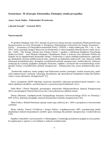 Scenariusze 3E (Energia, Ekonomika, Ekologia): studia przypadku Autor: Jacek Malko - Politechnika Wrocławska („Rynek Energii” – kwiecień 2012) Wprowadzenie W grudniu ubiegłego roku 2011 ukazała się pierwsza edycja nowego czasopisma Międzynarodowego Stowarzyszenia na rzecz Ekonomiki w Energetyce (International Association for Energy Economics – IAEE) – „Economics of Energy&Environmental Policy” (EEEP), z notką redakcyjną Vol. 1 Iss. 1, Jan. 2012. Nowy periodyk (mający ukazywać się dwukrotnie w roku) uzupełnia dotychczasowe tytuły zeszytów IAEE: „The Energy Journal oraz Energy Forum” i zgodnie z deklaracją Redaktora Naczelnego (Editor-in-Chief) – Jean Michela Glachanta i Redaktorów Paula L.Joskowa oraz Michaela Pollitta ma skupiać się na zagadnieniach ekonomiki energii i środowiska w ujęciu multidyscyplinarnym, zapewniając akademicki poziom publikowanych prac, opartych na badaniach naukowych, oraz stanowić źródło informacji komunikatywnej i dostępnej o problemach polityki energetycznej i środowiskowej. Edytorzy zachęcają do wymiany poglądów pomiędzy biznesem, rządami i uczonymi dla wszechstronnego wzbogacania wiedzy o kształtowaniu polityki energetyczno – klimatycznej oraz sztuce podejmowania decyzji. „Środowiska naukowe winny podjąć trud budowania mostów pomiędzy wiedzą teoretyczną, analizami empirycznymi i polityką, wskazując decydentom, jak spożytkować kompletną wiedzę dla definiowania i oceny alternatyw strategicznych” [1]. Nowe czasopismo EEEP imponuje zestawem autorskim; zakresem przedstawionych tematów i szerokim spektrum ośrodków, uczestniczących w prezentowanych badaniach. Są to: Fatih Birol i Pawel Olejarnik, prezentujący stanowisko Międzynarodowej Agencji Energetycznej (IEA), przypisującej Chinom kluczową rolę w przyszłościowej redukcji emisji; Denny Ellerman, współpracownik Europejskiego Instytutu Uniwersyteckiego (EUI) we Florencji i MIT (USA), dokonuje przeglądu czterech dziesięcioleci polityki energetycznej USA; Mark Finley z British Petroleum opisuje rynek ropy naftowej do r. 2030 z perspektywy inwestowania i polityki; Henry Jakoby, Francis O’Sullivan i Sergey Paltsev, współpracownicy MIT, przedstawiają skutki eksploatacji niekonwencjonalnych zasobów gazu ziemnego dla polityki energetycznej i środowiskowej USA; Stephen Littlechild z uniwersytetów w Birmingham i Cambridge przedstawia pogląd na nową politykę regulacyjną w oparciu o swe badania w zakresie modelowania; -1- David Newbery z Uniwersytetu Cambridge opisuje proces doskonalenia konkurencyjnego rynku energii elektrycznej w warunkach zaostrzonych rygorów emisyjnych; Peter Pearson i Roger Fouquet z Baskijskiego Ośrodka Zmian Klimatycznych (BC3) i Uniwersytetu Cardiff przedstawiają proces prognozowania mocy i energii dla celów oświetlania; Sir Nicholas Stern i James Rydge z London School of Economics opisują zasady nowej rewolucji energetycznej i przemysłowej w aspekcie międzynarodowych uzgodnień klimatycznych; Jean Tirole z Touluse School of Economics precyzuje pogląd na ekonomikę polityki w aspekcie globalnego ocieplenia i międzynarodowych rokowań w sprawie regulacji zmian klimatycznych. Editorial: Wprowadzenie do ekonomiki energetyki i polityki ochrony środowiska: wizja, zagadnienia i cele [1] Komunikat redakcyjny nowego czasopisma o zainteresowaniach sygnalizowanych tytułem periodyku (i nawiązującym do hasła 3E: Energetyka, Ekonomika i Ekologia) reprezentuje zarówno wysokie walory kompetencyjne jak i ugruntowaną pozycję w obszarze teorii i praktyki szeroko rozumianej energetyki. Grono edytorów stanowią Jean-Michel Glachant (European University Institute in Florence), Paul Joskov (Alfred P. Sloan Foundation i MIT – USA) oraz Michael Pollitt (Judge Business School, Univ. of Cambridge – UK) i oni też są autorami wprowadzenia do inauguracyjnego numeru Economics of Energy & Environmental Policy (EEEP) ze stycznia 2012 roku. Wizje działań określają krytyczną rolę sektora energii i wyzwania klimatyczne w horyzoncie czasowym roku 2050. Wymaga to rozstrzygnięcia dylematów: Po pierwsze: jakie inwestycje, infrastruktury, zasoby, innowacyjność technologiczna i struktury rynkowe są niezbędne dla zapewnienia energii dostatecznej, dostępnej i osiągalnej dla rosnącej liczby ludności świata. Po drugie: towarzyszący procesom rozwoju wzrost emisji gazów cieplarnianych, produkcja i transport ropy naftowej i gazu ziemnego oraz rozwój energetyki jądrowej mogą prowadzić do globalnego ekwilibrium ekonomiki i przemysłu, którego cechą jest nieprzyjazność dla środowiska i brak zrównoważenia procesów rozwoju. Zarówno zasoby dostarczanej i użytkowanej energii jak i zasoby środowiska są nieodnawialne i wzajemnie uzależnione. Kluczowymi zadaniami są pobudzenie stosowanych badań ekonomicznych na rzecz energetyki i środowiska oraz wspieranie bardziej doskonałych decyzji politycznych przez lepszą dostępność wyników badań i ich aplikacyjność. Cele EEEP zmierzają do upowszechnienia wiedzy w obszarze energetyki, ekonomiki i środowiska oraz dotarcie do środowisk naukowych (łącznie z badaczami spoza obszaru 3E), działających w przemyśle, organizacjach doradczych, administracji rządowej, organizacjach międzynarodowych i pozarządowych (NGOs). Czy Chiny poprowadzą świat w przyszłość czystej energii? [2] W r. 2009 Chiny stały się największym światowym konsumentem energii ale jeszcze wcześniej (w r. 2007) objęły globalne przywództwo w emisji CO2, odbierając USA palmę pierwszeństwa w obydwu tych konkurencjach. W nadchodzących latach można oczekiwać wzmocnienia pozycji Chin, mimo iż -2- zużycie energii i emisje na głowę mieszkańca nadal pozostają niższe niż w wielu krajach o rozwiniętej gospodarce. Ostatnie polityczne deklaracje w aspekcie globalnym nie zmieniły wzorca rozwojowego od ścieżki rozwoju niezrównoważonego na ścieżkę zrównoważe