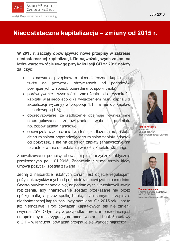 Luty 2016 Niedostateczna kapitalizacja – zmiany od 2015 r. W 2015 r. zaczęły obowiązywać nowe przepisy w zakresie niedostatecznej kapitalizacji. Do najważniejszych zmian, na które warto zwrócić uwagę przy kalkulacji CIT za 2015 należy zaliczyć: zastosowanie przepisów o niedostatecznej kapitalizacji także do pożyczek otrzymanych od podmiotów powiązanych w sposób pośredni (np. spółki babki); porównywanie wysokości zadłużenia do wysokości kapitału własnego spółki (z wyłączeniem m.in. kapitału z aktualizacji wyceny) w proporcji 1:1, a nie do kapitału zakładowego (1:3); doprecyzowanie, że zadłużenie obejmuje również inne nieuregulowane zobowiązania wobec podmiotu np. zobowiązania handlowe; obowiązek wyznaczania wartości zadłużenia na ostatni dzień miesiąca poprzedzającego miesiąc zapłaty odsetek od pożyczek, a nie na dzień ich zapłaty (analogicznie ma to zastosowanie do ustalania wartości kapitału własnego). Natalia Kotlarek Konsultant tel. 661 048 658 [email protected] Znowelizowane przepisy obowiązują dla pożyczek faktycznie przekazanych po 1.01.2015. Znaczenia nie ma termin kiedy umowa pożyczki została zawarta. Jedną z najbardziej istotnych zmian jest objęcie regulacjami pożyczek uzyskiwanych od podmiotów o powiązaniu pośrednim. Często bowiem zdarzało się, że podatnicy tak kształtowali swoje rozliczenia, aby finansowanie zostało przekazane nie przez spółkę matkę a przez spółkę babkę. Tym samym, przepisy o niedostatecznej kapitalizacji były pomijane. Od 2015 roku jest to już niemożliwe. Próg powiązań kapitałowych się nie zmienił i wynosi 25%. O tym czy w przypadku powiazań pośrednich jest on spełniony rozstrzyga się na podstawie art. 11 ust. 5b ustawy o CIT – w łańcuchu powiązań przyjmuje się wartość najniższą. Tomasz Napierała Partner, doradca podatkowy tel. 797 720 901 [email protected] Aspekt ten może być również szczególnie istotny w kontekście wątpliwości czy cash-pooling należy uznać za umowę pożyczki. Podatnicy często bowiem przystępowali do takiego systemu wraz z podmiotami powiązanymi pośrednio, eliminując tym samym ryzyko ewentualnego zakwestionowania przez organ podatkowy braku zastosowania przepisów o niedostatecznej kapitalizacji. W świetle nowelizacji przepisów i zmiany linii orzeczniczej na niekorzyść podatników, nieuwzględnianie tych regulacji do odsetek związanych z cash poolingiem może być ryzykowne. Znowelizowane przepisy umożliwiają podatnikom wybór między standardową metodą a metodą alternatywną (wynikającą z art. 15c CITU). Ta druga metoda pozwala zaliczać do kosztów podatkowych odsetki do wysokości poziomu, stanowiącego określony procent wartości podatkowej aktywów oraz zysku z działalności operacyjnej podatnika. Aby móc zacząć korzystać z metody alternatywnej konieczne jest zgłoszenie takiej chęci do urzędu skarbowego w terminie 30 dni od dnia zawarcia umowy pożyczki. Należy jednak pamiętać, że wybór metody alternatywnej obliguje podatnika do jej stosowania przez okres co najmniej 3 lat podatkowych w zakresie wszystkich pożyczek - nie tylko tych otrzymanych od podmiotów powiązanych. Dodatkowo, organy podatkowe wskazują, że metodą ta objęte są także pożyczki, które zostały przekazane przed 1 stycznia 2015 r. (np. interpretacja DIS w 5.11.2015, sygn. IBPB-13/4510-279/15/IŻ). W związku z powyższym, decyzja o wyborze metody powinna zostać poprzedzona przez podatnika dokładnymi analizami i kalkulacjami. Jeżeli są Państwo zainteresowani szczegółami dotyczącymi tej, jak i innych zmian podatkowych, zapraszamy do kontaktu. ABC Tax Sp. z o.o., Spółka doradztwa podatkowego www.abcgroupCE.com Poznań, ul. Paderewskiego 6/7 Łódź, Al. Kościuszki 103 Audit & Business Consulting Group tworzą: tel. +48 61 852 58 45, fax +48 61 853 50 20, e-mail: [email protected] ABC Tax Sp. z o.o. ABC Audit Sp. z o.o. ABC Accounting Sp. z o.o. Śron&Łakomecki Kancelaria Prawnicza s.c. Kapitał zakładowy 50.000 PLN Sąd Rejonowy Poznań Nowe Miasto i Wilda w Poznaniu, VIII Wydział Gospodarczy: 0000335640