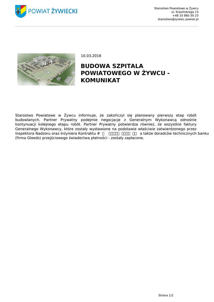 Starostwo Powiatowe w Żywcu ul. Krasińskiego 13 +48 33 860 50 23 [email protected] 10.03.2016 BUDOWA SZPITALA POWIATOWEGO W ŻYWCU KOMUNIKAT Starostwo Powiatowe w Żywcu informuje, że zakończył się planowany pierwszy etap robót budowlanych. Partner Prywatny podejmie negocjacje z Generalnym Wykonawcą odnośnie kontynuacji kolejnego etapu robót. Partner Prywatny potwierdza również, że wszystkie faktury Generalnego Wykonawcy, które zostały wystawione na podstawie właściwie zatwierdzonego przez Inspektora Nadzoru oraz Inżyniera Kontraktu #℣佐⌡⌀昀椀爀洀愀 䄀爀甀瀀⌡⍃倣℣ a także doradców technicznych banku (firma Gleeds) przejściowego świadectwa płatności - zostały zapłacone. Strona 1/1 Powered by TCPDF (www.tcpdf.org)
