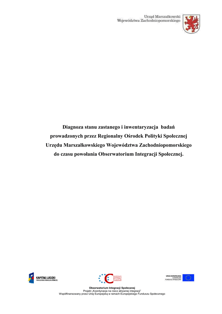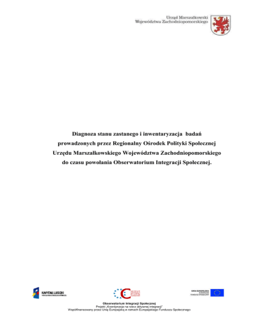Diagnoza stanu zastanego i inwentaryzacja badań prowadzonych przez Regionalny Ośrodek Polityki Społecznej Urzędu Marszałkowskiego Województwa Zachodniopomorskiego do czasu powołania Obserwatorium Integracji Społecznej. Obserwatorium Integracji Społecznej Projekt „Koordynacja na rzecz aktywnej integracji” Współfinansowany przez Unię Europejską w ramach Europejskiego Funduszu Społecznego Wstęp Regionalny Ośrodek Polityki Społecznej rozpoczął swoją działalność w roku 1999 jako samodzielne stanowiska w ramach Departamentu Zdrowia i Polityki Społecznej Urzędu Marszałkowskiego Województwa Zachodniopomorskiego. We wrześniu 2000 r. uzyskał on status Wydziału funkcjonującego w ramach tego samego Departamentu. Poczynając od stycznia 2001 roku usytuowanie ROPS w strukturze organizacyjnej Urzędu Marszałkowskiego ulegało zmianom. I tak: od stycznia 2001 r. do stycznia 2006 r. ROPS funkcjonował jako Wydział Polityki Społecznej w Departamencie Zdrowia i Polityki Społecznej; od stycznia 2006 r. do kwietnia 2007 r. po zmianie nazwy na Zachodniopomorski Regionalny Ośrodek Polityki Społecznej komórka ta funkcjonowała na prawach samodzielnego departamentu. Dnia 25 kwietnia 2007 roku Zachodniopomorski Regionalny Ośrodek Polityki Społecznej został przekształcony w Biuro Polityki Społecznej i włączony w struktury Wydziału Zdrowia i Polityki Społecznej. W tej formie organizacyjnej Biuro Polityki Społecznej działało do 26 czerwca 2008 roku, kiedy to ponownie otrzymało status Regionalnego Ośrodka Polityki Społecznej na prawach samodzielnego wydziału i w takim usytuowaniu organizacyjnym funkcjonuje do dzisiaj. Dnia 12 listopada 2009 na podstawie umowy (CRZL/WPS/1.16/12/09) zawartej pomiędzy Centrum Rozwoju Zasobów Ludzkich a Województwem Zachodniopomorskim r. w strukturze ROPS utworzone zostało Biuro Projektów Europejskiego Funduszu Społecznego w ramach którego powołano Zespół ds. Projektu Systemowego ROPS oraz Obserwatorium Integracji Społecznej (OIS). OIS zaprojektowane zostało jako jednostka analityczno – badawcza realizująca zadania projektu systemowego „Koordynacja na Rzecz Aktywnej Integracji” realizowanego w ramach Priorytetu I „Zatrudnienie i integracja społeczna”, działania 1.2 „Wsparcie systemowe instytucji pomocy i integracji społecznej” Programu Operacyjnego Kapitał Ludzki. Powstanie Biura Projektów Europejskiego Funduszu Społecznego wymusiło zmianę struktury organizacyjnej ROPS, który pozostaje w strukturze Urzędu Marszałkowskiego na prawach wydziału. Struktura ROPS na dzień dzisiejszy składa się z czterech biur. Są nimi: ROPS I – Biuro Pomocy i Integracji Społecznej ROPS II – Biuro Świadczeń rodzinnych ROPS III – Jednoosobowe stanowisko do spraw finansowych ROPS IV - Biuro Projektów Europejskiego Funduszu Społecznego 2 Opis i charakterystyka przeprowadzonych badań. Jednym z pierwszych zadań zapisanych w punkcie 2.2.2 „Koncepcji funkcjonalno – organizacyjnej OIS” jest zdiagnozowanie stanu zastanego oraz inwentaryzacja dotychczasowych badań przeprowadzonych przez Regionalny Ośrodek Polityki Społecznej samodzielnie lub we współpracy z innymi jednostkami badawczymi. W tym miejscu naleŜy podkreślić, Ŝe od początku istnienia ROPS w jej strukturze organizacyjnej nie istniała samodzielna komórka zajmująca się prowadzeniem badań. Wszystkie badania prowadzone były w ramach jednego stanowiska ds. analiz i diagnoz, na którym za całokształt prac badawczych odpowiadała tylko jedna osoba, co niewątpliwie rzutowało na ilość i zakres przeprowadzonych przez ROPS badań. Wyniki tych badań zostały przedstawione w postaci raportów i opracowań wymienionych poniŜej w kolejności ich powstawania. 1. „Bilans potrzeb Województwa Zachodniopomorskiego w zakresie pomocy społecznej”. Bilans ten naleŜy do zadań własnych samorządu województwa i sporządzany był co roku w latach 2000 – 2010. 2. Raport „Problemy społeczne w województwie zachodniopomorskim. Diagnozowanie, przeciwdziałanie i łagodzenie negatywnych skutków problemów społecznych w pomocy społecznej.” wykonany przez Uniwersyteckie Centrum Badań Społecznych Uniwersytetu Szczecińskiego na zlecenie Urzędu Marszałkowskiego Województwa Zachodniopomorskiego. (2003) 3. „Strategia województwa zachodniopomorskiego w zakresie polityki społecznej do roku 2015.” (2005) 4. Opracowanie „Wojewódzki program działań na rzecz osób niepełnosprawnych w latach 2007 – 2015”. (2007) 5. Opracowanie „Plan realizacji na 2008 r. Strategii województwa zachodniopomorskiego w zakresie polityki społecznej do roku 2015” (2007) 6. Raport z „Bilansu potrzeb województwa zachodniopomorskiego w zakresie pomocy społecznej na rok 2008”. (2008) 7. Raport „Mierzenie bezdomności i wykluczenia mieszkaniowego w Województwie Zachodniopomorskim w oparciu o Europejską Typologie Bezdomności i Wykluczenia 3 Mieszkaniowego ETHOS” wykonany dla Polskiej Strony o Bezdomności i Wykluczeniu Mieszkaniowym www.bezdomnosc.edu.pl (2008) 8. „Diagnoza stanu pomocy i integracji społecznej w województwie zachodniopomorskim” (2009) Krótka charakterystyka w/w raportów i opracowań. 1. „Bilans potrzeb Województwa Zachodniopomorskiego w zakresie pomocy społecznej”. Corocznie w latach 2000 – 2010. Sporządzanie bilansu potrzeb w zakresie pomocy społecznej naleŜy do zadań własnych samorządu województwa i jest realizowane zgodnie z art. 21 pkt 8 ustawy z dnia 12 marca 2004 r. o pomocy społecznej (tekst jednolity Dz.U. z 2008 r. Nr 115,poz. 728 ze zm.). Bilans stanowi źródło danych na temat szacowanych potrzeb (finansowych, kadrowych, instytucjonalnych, inwestycyjnych, itp.) niezbędnych do realizacji zadań pomocy społecznej przez gminy i powiaty, zarówno w zakresie zadań własnych, jak i zleconych przez administrację rządową. Na podstawie danych zebranych z ośrodków pomocy społecznej i