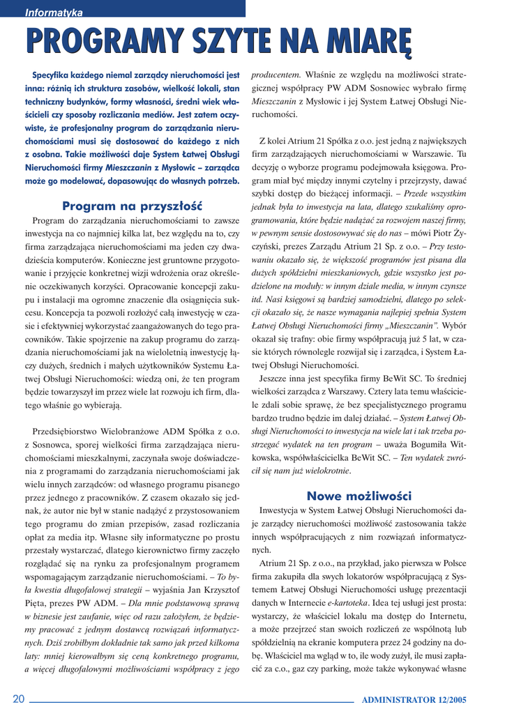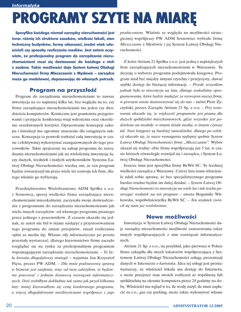 Informatyka PROGRAMY SZYTE NA MIARĘ Specyfika każdego niemal zarządcy nieruchomości jest producentem. Właśnie ze względu na możliwości strate- inna: różnią ich struktura zasobów, wielkość lokali, stan gicznej współpracy PW ADM Sosnowiec wybrało firmę techniczny budynków, formy własności, średni wiek wła- Mieszczanin z Mysłowic i jej System Łatwej Obsługi Nie- ścicieli czy sposoby rozliczania mediów. Jest zatem oczy- ruchomości. wiste, że profesjonalny program do zarządzania nieruchomościami musi się dostosować do każdego z nich Z kolei Atrium 21 Spółka z o.o. jest jedną z największych z osobna. Takie możliwości daje System Łatwej Obsługi firm zarządzających nieruchomościami w Warszawie. Tu Nieruchomości firmy Mieszczanin z Mysłowic – zarządca decyzję o wyborze programu podejmowała księgowa. Pro- może go modelować, dopasowując do własnych potrzeb. gram miał być między innymi czytelny i przejrzysty, dawać szybki dostęp do bieżącej informacji. – Przede wszystkim Program na przysz³oœæ Program do zarządzania nieruchomościami to zawsze jednak była to inwestycja na lata, dlatego szukaliśmy oprogramowania, które będzie nadążać za rozwojem naszej firmy, inwestycja na co najmniej kilka lat, bez względu na to, czy w pewnym sensie dostosowywać się do nas – mówi Piotr Ży- firma zarządzająca nieruchomościami ma jeden czy dwa- czyński, prezes Zarządu Atrium 21 Sp. z o.o. – Przy testo- dzieścia komputerów. Konieczne jest gruntowne przygoto- waniu okazało się, że większość programów jest pisana dla wanie i przyjęcie konkretnej wizji wdrożenia oraz określe- dużych spółdzielni mieszkaniowych, gdzie wszystko jest po- nie oczekiwanych korzyści. Opracowanie koncepcji zaku- dzielone na moduły: w innym dziale media, w innym czynsze pu i instalacji ma ogromne znaczenie dla osiągnięcia suk- itd. Nasi księgowi są bardziej samodzielni, dlatego po selek- cesu. Koncepcja ta pozwoli rozłożyć całą inwestycję w cza- cji okazało się, że nasze wymagania najlepiej spełnia System sie i efektywniej wykorzystać zaangażowanych do tego pra- Łatwej Obsługi Nieruchomości firmy „Mieszczanin”. Wybór cowników. Takie spojrzenie na zakup programu do zarzą- okazał się trafny: obie firmy współpracują już 5 lat, w cza- dzania nieruchomościami jak na wieloletnią inwestycję łą- sie których równolegle rozwijał się i zarządca, i System Ła- czy dużych, średnich i małych użytkowników Systemu Ła- twej Obsługi Nieruchomości. twej Obsługi Nieruchomości: wiedzą oni, że ten program Jeszcze inna jest specyfika firmy BeWit SC. To średniej będzie towarzyszył im przez wiele lat rozwoju ich firm, dla- wielkości zarządca z Warszawy. Cztery lata temu właścicie- tego właśnie go wybierają. le zdali sobie sprawę, że bez specjalistycznego programu bardzo trudno będzie im dalej działać. – System Łatwej Ob- Przedsiębiorstwo Wielobranżowe ADM Spółka z o.o. sługi Nieruchomości to inwestycja na wiele lat i tak trzeba po- z Sosnowca, sporej wielkości firma zarządzająca nieru- strzegać wydatek na ten program – uważa Bogumiła Wit- chomościami mieszkalnymi, zaczynała swoje doświadcze- kowska, współwłaścicielka BeWit SC. – Ten wydatek zwró- nia z programami do zarządzania nieruchomościami jak cił się nam już wielokrotnie. wielu innych zarządców: od własnego programu pisanego Nowe mo¿liwoœci przez jednego z pracowników. Z czasem okazało się jed- 20 nak, że autor nie był w stanie nadążyć z przystosowaniem Inwestycja w System Łatwej Obsługi Nieruchomości da- tego programu do zmian przepisów, zasad rozliczania je zarządcy nieruchomości możliwość zastosowania także opłat za media itp. Własne siły informatyczne po prostu innych współpracujących z nim rozwiązań informatycz- przestały wystarczać, dlatego kierownictwo firmy zaczęło nych. rozglądać się na rynku za profesjonalnym programem Atrium 21 Sp. z o.o., na przykład, jako pierwsza w Polsce wspomagającym zarządzanie nieruchomościami. – To by- firma zakupiła dla swych lokatorów współpracującą z Sys- ła kwestia długofalowej strategii – wyjaśnia Jan Krzysztof temem Łatwej Obsługi Nieruchomości usługę prezentacji Pięta, prezes PW ADM. – Dla mnie podstawową sprawą danych w Internecie e-kartoteka. Idea tej usługi jest prosta: w biznesie jest zaufanie, więc od razu założyłem, że będzie- wystarczy, że właściciel lokalu ma dostęp do Internetu, my pracować z jednym dostawcą rozwiązań informatycz- a może przejrzeć stan swoich rozliczeń ze wspólnotą lub nych. Dziś zrobiłbym dokładnie tak samo jak przed kilkoma spółdzielnią na ekranie komputera przez 24 godziny na do- laty: mniej kierowałbym się ceną konkretnego programu, bę. Właściciel ma wgląd w to, ile wody zużył, ile musi zapła- a więcej długofalowymi możliwościami współpracy z jego cić za c.o., gaz czy parking, może także wykonywać własne ADMINISTRATOR 12/2005 analizy i drukować sobie raporty, podyskutować na forum ze współlokatorami, przeczytać ogłoszenia administratora czy uchwały zarządu wspólnoty. Prezentowane dane są dostępne przez dowolną przeglądarkę internetową po wpisaniu specjalnego identyfikatora i hasła. Poprzez takie internetowe konto właściciel i zarządca mogą się również ze sobą komunikować jak przez pocztę elektroniczną, wysyłając do siebie wiadomości, zapytania i uwagi. Z punktu widzenia zarządcy e-kartoteka, oprócz oszczędności czasu i pracy, ma także inne zalety: firma nie musi posiadać żadnego serwera ze specjalistyczną bazą danych – informacje umieszczone są na serwerze firmy Mieszczanin, a zarządca ma do nich dostęp przez specjalny panel administracyjny w przeglądarce internetowej. – e-kartoteka to strzał w dziesiątkę – uważa prezes Zarządu Atrium 21 Sp. z o.o.. Takiego samego zdania jest