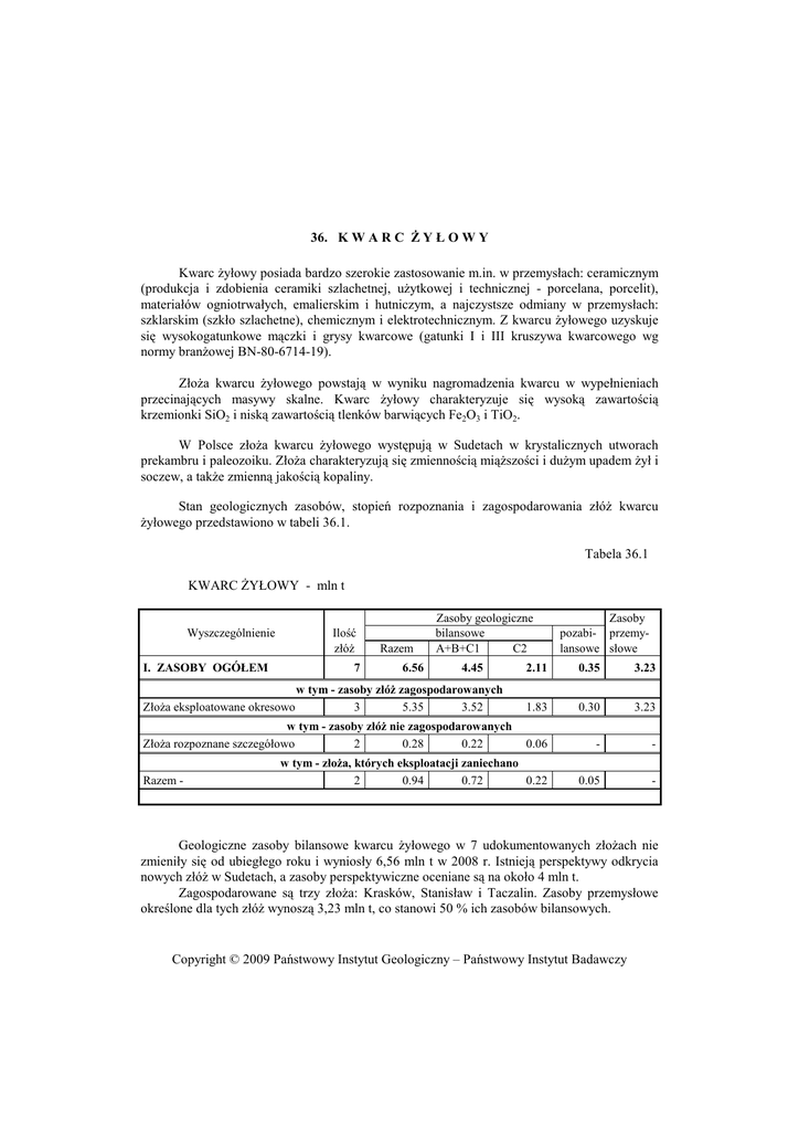 36. K W A R C ś Y Ł O W Y Kwarc Ŝyłowy posiada bardzo szerokie zastosowanie m.in. w przemysłach: ceramicznym (produkcja i zdobienia ceramiki szlachetnej, uŜytkowej i technicznej - porcelana, porcelit), materiałów ogniotrwałych, emalierskim i hutniczym, a najczystsze odmiany w przemysłach: szklarskim (szkło szlachetne), chemicznym i elektrotechnicznym. Z kwarcu Ŝyłowego uzyskuje się wysokogatunkowe mączki i grysy kwarcowe (gatunki I i III kruszywa kwarcowego wg normy branŜowej BN-80-6714-19). ZłoŜa kwarcu Ŝyłowego powstają w wyniku nagromadzenia kwarcu w wypełnieniach przecinających masywy skalne. Kwarc Ŝyłowy charakteryzuje się wysoką zawartością krzemionki SiO2 i niską zawartością tlenków barwiących Fe2O3 i TiO2. W Polsce złoŜa kwarcu Ŝyłowego występują w Sudetach w krystalicznych utworach prekambru i paleozoiku. ZłoŜa charakteryzują się zmiennością miąŜszości i duŜym upadem Ŝył i soczew, a takŜe zmienną jakością kopaliny. Stan geologicznych zasobów, stopień rozpoznania i zagospodarowania złóŜ kwarcu Ŝyłowego przedstawiono w tabeli 36.1. Tabela 36.1 KWARC śYŁOWY - mln t Wyszczególnienie Ilość złóŜ I. ZASOBY OGÓŁEM 7 Razem 4.45 0.35 3.23 1.83 0.30 3.23 0.06 - - w tym - złoŜa, których eksploatacji zaniechano 2 0.94 0.72 0.22 0.05 - w tym - zasoby złóŜ zagospodarowanych 3 5.35 3.52 w tym - zasoby złóŜ nie zagospodarowanych ZłoŜa rozpoznane szczegółowo 2 0.28 0.22 Razem - Zasoby pozabi- przemylansowe słowe 2.11 ZłoŜa eksploatowane okresowo 6.56 Zasoby geologiczne bilansowe A+B+C1 C2 Geologiczne zasoby bilansowe kwarcu Ŝyłowego w 7 udokumentowanych złoŜach nie zmieniły się od ubiegłego roku i wyniosły 6,56 mln t w 2008 r. Istnieją perspektywy odkrycia nowych złóŜ w Sudetach, a zasoby perspektywiczne oceniane są na około 4 mln t. Zagospodarowane są trzy złoŜa: Krasków, Stanisław i Taczalin. Zasoby przemysłowe określone dla tych złóŜ wynoszą 3,23 mln t, co stanowi 50 % ich zasobów bilansowych. Copyright © 2009 Państwowy Instytut Geologiczny – Państwowy Instytut Badawczy KWARC śYŁOWY 2 W 2008 r. nie było eksploatowane Ŝadne ze złóŜ kwarcu Ŝyłowego. Wstrzymano wydobycie ze złoŜa Krasków. Nadal wstrzymana jest eksploatacja w złoŜach Stanisław i Taczalin. Import kwarcu w 2008 r. utrzymał się na poziomie z poprzedniego roku i wyniósł 9,31 tys. t (72 % z Norwegii). Eksport kwarcu był znikomy i wyniósł 0,3 tys. t. Stopień rozpoznania zasobów i stan zagospodarowania, a takŜe wielkość wydobycia z poszczególnych złóŜ zestawiono w tabeli 36.2. Tabela 36.2 Wykaz złóŜ kwarcu Ŝyłowego - w tys. t Stan zag. złoŜa ZŁOśA UDOKUMENTOWANE złóŜ : 7; OGÓŁEM woj. DOLNOŚLĄSKIE złóŜ : 7 1 Jędrzychowice Z 2 Krasków T 3 Nowa Kamienica R 4 Sady (Białe Krowy) Z 5 Stanisław T 6 Taczalin T 7 WądroŜe Wielkie R Lp. Nazwa złoŜa Zasoby geologiczne przemybilansowe słowe 6 564 3 227 Wydobycie Powiat - 6 564 3 227 - tylko pzb. 1 501 102 942 3 339 500 179 1 501 1 349 378 - - Lubań, Zgorzelec Świdnica Jelenia Góra Wrocław Lwówek Śl.,Jelenia Góra Legnica Jawor Opracowała: Agnieszka Malon Copyright © 2009 Państwowy Instytut Geologiczny – Państwowy Instytut Badawczy