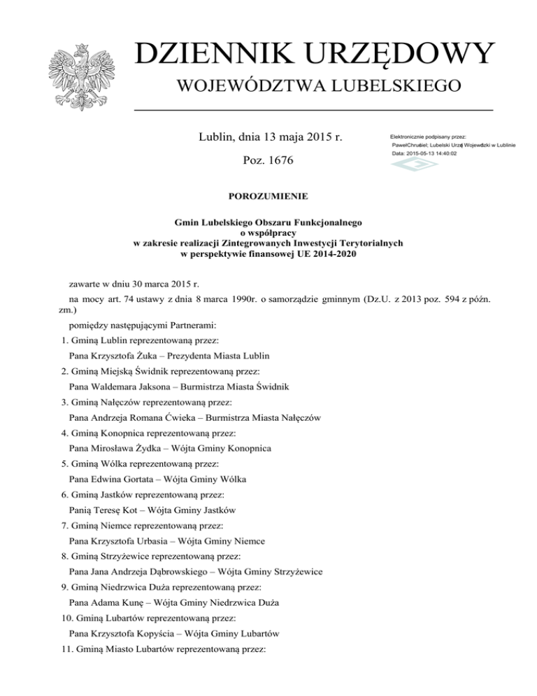 DZIENNIK URZĘDOWY WOJEWÓDZTWA LUBELSKIEGO Lublin, dnia 13 maja 2015 r. Elektronicznie podpisany przez: Paweł Chruściel; Lubelski Urząd Wojewódzki w Lublinie Poz. 1676 Data: 2015-05-13 14:40:02 POROZUMIENIE Gmin Lubelskiego Obszaru Funkcjonalnego o współpracy w zakresie realizacji Zintegrowanych Inwestycji Terytorialnych w perspektywie finansowej UE 2014-2020 zawarte w dniu 30 marca 2015 r. na mocy art. 74 ustawy z dnia 8 marca 1990r. o samorządzie gminnym (Dz.U. z 2013 poz. 594 z późn. zm.) pomiędzy następującymi Partnerami: 1. Gminą Lublin reprezentowaną przez: Pana Krzysztofa Żuka – Prezydenta Miasta Lublin 2. Gminą Miejską Świdnik reprezentowaną przez: Pana Waldemara Jaksona – Burmistrza Miasta Świdnik 3. Gminą Nałęczów reprezentowaną przez: Pana Andrzeja Romana Ćwieka – Burmistrza Miasta Nałęczów 4. Gminą Konopnica reprezentowaną przez: Pana Mirosława Żydka – Wójta Gminy Konopnica 5. Gminą Wólka reprezentowaną przez: Pana Edwina Gortata – Wójta Gminy Wólka 6. Gminą Jastków reprezentowaną przez: Panią Teresę Kot – Wójta Gminy Jastków 7. Gminą Niemce reprezentowaną przez: Pana Krzysztofa Urbasia – Wójta Gminy Niemce 8. Gminą Strzyżewice reprezentowaną przez: Pana Jana Andrzeja Dąbrowskiego – Wójta Gminy Strzyżewice 9. Gminą Niedrzwica Duża reprezentowaną przez: Pana Adama Kunę – Wójta Gminy Niedrzwica Duża 10. Gminą Lubartów reprezentowaną przez: Pana Krzysztofa Kopyścia – Wójta Gminy Lubartów 11. Gminą Miasto Lubartów reprezentowaną przez: Dziennik Urzędowy Województwa Lubelskiego –2– Poz. 1676 Pana Janusza Bodziackiego – Burmistrza Miasta Lubartów 12. Gminą Głusk reprezentowaną przez: Pana Jacka Anasiewicza – Wójta Gminy Głusk 13. Gminą Mełgiew reprezentowaną przez: Pana Ryszarda Podlodowskiego – Wójta Gminy Mełgiew 14. Gminą Piaski, reprezentowaną przez: Pana Michała Cholewę – Burmistrza Miasta Piaski 15. Gminą Jabłonna reprezentowaną przez: Panią Magdaleną Sałek – Wójta Gminy Jabłonna 16. Gminą Spiczyn reprezentowaną przez: Panią Dorotę Szczęsną – Wójta Gminy Spiczyn zwanymi dalej łącznie Stronami. Preambuła W trosce o pomyślny rozwój Lubelskiego Obszaru Funkcjonalnego, kierując się chęcią integracji działań mających na celu zapewnienie Lubelskiemu Obszarowi Funkcjonalnemu konkurencyjności i dynamicznego rozwoju, zacieśniania współpracy samorządowej oraz mając na uwadze możliwości związane z wykorzystaniem instrumentów uruchamianych w ramach nowej perspektywy finansowej Unii Europejskiej na lata 2014-2020, ukierunkowanych na zwiększenie zaangażowania miast i ich obszarów funkcjonalnych w zarządzanie środkami strukturalnymi UE oraz kierując się zapisami Rozporządzenia Ogólnego a także możliwościami, jakie stworzyła Komisja Europejska w perspektywie 2014 – 2020 w ramach Zintegrowanych Inwestycji Terytorialnych służących wspomaganiu zrównoważonego rozwoju obszarów miejskich, uwzględniając unormowania ustawy wdrożeniowej oraz wytycznych Ministerstwa Infrastruktury i Rozwoju Regionalnego w sprawie funkcjonowania Zintegrowanych Inwestycji Terytorialnych w Polsce nawiązując do zapisów Umowy partnerstwa z dnia 23 maja 2014r., Strony porozumienia postanawiają co następuje: § 1. Postanowienia ogólne 1. Porozumienie określa zasady współpracy Stron porozumienia przy programowaniu, wdrażaniu, koordynacji, finansowaniu, ewaluacji oraz rozliczaniu Zintegrowanych Inwestycji Terytorialnych Lubelskiego Obszaru Funkcjonalnego. 2. Zasięg terytorialny określony niniejszym porozumieniem obejmuje obszar Lubelskiego Obszaru Funkcjonalnego, w skład którego wchodzą sygnatariusze porozumienia. 3. Użyte w porozumieniu określenia oznaczają: 1) LOF – Lubelski Obszar Funkcjonalny obejmujący swoim zasięgiem 16 jednostek samorządu terytorialnego, które będą realizowały ZIT - Strony niniejszego porozumienia; 2) ZIT – Zintegrowane Inwestycje Terytorialne, narzędzie służące zintegrowanym działaniom na rzecz zrównoważonego rozwoju obszarów miejskich w rozumieniu art. 36 Rozporządzenia Ogólnego; 3) Rozporządzenie Ogólne – rozporządzenie Parlamentu Europejskiego i Rady (UE) Nr 1303/2013 z dnia 17 grudnia 2013 r. ustanawiające wspólne przepisy dotyczące Europejskiego Funduszu Rozwoju Regionalnego, Europejskiego Funduszu Społecznego, Funduszu Spójności, Europejskiego Funduszu Rolnego na rzecz Rozwoju Obszarów Wiejskich oraz Europejskiego Funduszu Morskiego i Rybackiego oraz ustanawiające przepisy ogólne dotyczące Europejskiego Funduszu Rozwoju Regionalnego, Europejskiego Funduszu Społecznego, Funduszu Spójności, Europejskiego Funduszu Rolnego na rzecz Rozwoju Obszarów Wiejskich oraz Europejskiego Funduszu Morskiego i Rybackiego oraz uchylające rozporządzenie Rady (WE) nr 1083/2006; 4) ZIT LOF – Zintegrowane Inwestycje Terytorialne Lubelskiego Obszaru Funkcjonalnego realizowane w ramach niniejszego porozumienia; Dziennik Urzędowy Województwa Lubelskiego –3– Poz. 1676 5) Strategia ZIT – dokument strategiczny będący analizą potrzeb, barier oraz potencjałów Obszaru Metropolitalnego, o którym mowa w art. 7 ust. 1 Rozporządzenia EFRR; 6) Rozporządzenie EFRR – rozporządzenie Parlamentu Europejskiego i Rady (UE) nr 1301/2013 z dnia 17 grudnia 2013 r. w sprawie Europejskiego Funduszu Rozwoju Regionalnego i przepisów szczególnych dotyczących celu „Inwestycje na rzecz wzrostu i zatrudnienia” oraz w sprawie uchylenia rozporządzenia (WE) nr 1080/2006; 7) Ustawa Wdrożeniowa – Ustawa z dnia 11 lipca 2014 r. o zasadach realizacji programów w zakresie polityki spójności finansowanych w perspektywie finansowej 2014-2020 (Dz. U. poz. 1146); 8) RPO WL 2014-2020 – Regionalny Program Operacyjny dla Województwa Lubelskiego na lata 2014-2020; 9) IZ RPO WL – Instytucja Zarządzająca RPO WL 2014-2020, 10) IP – Instytucja Pośrednicząca, o której mowa w art. 2 p