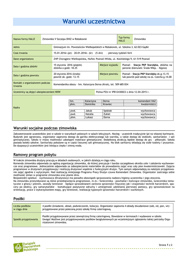 Warunki uczestnictwa Nazwa formy HALiZ Typ formy HALiZ Zimowisko V Szczepu DHiZ w Robakowie Zimowisko Adres Gimnazjum im. Powstańców Wielkopolskich w Robakowie, ul. Szkolna 3, 62-023 Gądki Czas trwania 15.01.2016r.(pt) – 20.01.2016r. (śr) Dane organizatora ZHP Chorągiew Wielkopolska, Hufiec Poznań-Wilda, ul. Kosińskiego 9, 61-519 Poznań Data i godzina zbiórki 15 stycznia 2016 (piątek) zbiórka o godz: 18.25 Miejsce wyjazdu Poznań – Stacja PKP Starołęka, zbiórka na peronie (kierunek: Środa Wlkp. - Kępno) Data i godzina powrotu 20 stycznia 2016 (środa) powrót ok. godz: 13.15 Miejsce powrotu Poznań - Stacja PKP Starołęka ok.g.13.15 lub powrót pod szkołę na os. Czecha g.14.00 Kontakt z organizatorem podczas trwania Komendantka obozu – hm. Katarzyna Dorna (Kruk), tel. 509 685 834 (5 dni) Uczestnicy są objęci ubezpieczeniem NNW – pierwszy tydzień ferii Polisa PZU nr IPB12430023 z dnia 12.04.2015 r. hm. phm. Katarzyna Dominika Dorna Krawiec komendant HAZ kwatermistrz pwd. pwd. phm. Jakub Natalia Łukasz Sędziak Żukiel Dorna wychowawca wychowawca wychowawca Kadra Warunki socjalne podczas zimowiska Zakwaterowanie uczestników jest w szkole w warunkach polowych w salach lekcyjnych. Nocleg - uczestnik tradycyjnie śpi na własnej karimacie. Budynek jest ogrzewany, organizator zapewnia dostęp do garnka elektrycznego lub warnika, a także dostęp do stołówki, sanitariatów i sali gimnastycznej. Szkoła w miarę możliwości udostępni materace gimnastyczne. Dodatkową atrakcją będzie dostęp do gry – piłkarzyki. Szkoła posiada boisko szkolne. Sanitariaty położone są w części bocznej sali gimnastycznej. Na blok sanitarny składają się stałe toalety i prysznice. Do dyspozycji uczestników jest bieżąca ciepła i zimną woda. Ramowy program pobytu W trakcie zimowiska drużyny pracują w składach osobowych, w jakich działają w ciągu roku. Komenda zimowiska odpowiada za ogólną organizację zimowiska, do której precyzuje i bardzo szczegółowo określa cele i założenia wychowawcze oraz programowe. Jednocześnie odpowiada za zabezpieczenie materiałów do prowadzenia zajęć oraz cały pion kwatermistrzowski. Zajęcia programowe w drużynach przygotowują i realizują drużynowi wspólnie z funkcyjnymi drużyn. Tym samym odpowiadają za należyte przygotowanie zajęć zgodnie z wytycznymi. Nad realizacją niniejszego Programu Pracy Drużyn czuwa Komendant Zimowiska. Organizator zastrzega sobie możliwość zmian w programie zimowiska oraz planie dnia. Bezpośredni opiekun – wychowawca (Drużynowy) ma ponadto obowiązek sprawowania nadzoru higieny uczestnika i jego otocznia. Na zimowisku przewidywane są różne przedsięwzięcia programowe, m.in.: Świeczniska - powitalne i kończące zimowisko, świeczniska tematyczne z gitarą i piórem, zawody terenowe – będące sprawdzianem zarówno sprawności fizycznej jak i znajomości technik harcerskich, spacery po okolicy, gry samarytańskie – kształtujące pozytywne odruchy i umiejętność udzielania pierwszej pomocy, gry sprawnościowe na orientację, prace z wykorzystaniem mapy, gry terenowe, realizację typowych sprawności harcerskich i zuchowych. Posiłki Liczba posiłków w ciągu dnia 4 posiłki (śniadanie, obiad, podwieczorek, kolacja). Organizator zapewnia 4 obiady dwudaniowe (sob, nd, pon, wt) – przygotowane przez poleconą przez szkołę firmę cateringową. Sposób przygotowania Posiłki przygotowywane przez zewnętrzną firmę cateringową. Dowożone w termosach i wydawane w szkole. Uwaga! Możliwe jest przygotowywanie posiłków bezglutenowych po wcześniejszym zgłoszeniu takiej potrzeby Organizatorowi zimowiska. Strona 1 z 2 Wykaz niezbędnego wyposażenia uczestnika Śpiwór i karimata , kubek i sztućce harcerski oraz spodnie/spódnica do munduru i zapas baterii na zimowisko dne leki (z informacją o sposobie dawkowania) na legitymacja szkolna – WAŻNE! (duży, mały) oraz przybory toaletowe Wygodne obuwie (pełne obuwie ciepłe, trampki, laczki) Odzież (bielizna, ciepłe bluzy, koszulki, spodnie, dres do spania) Odpłatność za uczestnictwo Koszt zimowiska wynosi 200 zł. Wpłaty TYLKO na KONTO do 15.12.2015 (wtorek). Proszę o dotrzymanie w/w terminu. UWAGA! Odpłatność po 15.12.br, a przed upływem 20.12.br wynosi 220 zł. Po 20.12.br uczestnik nie będzie zakwalifikowany. Dane do przelewu: 13 1090 1359 0000 0000 3501 8492 Hufiec ZHP Poznań-Wilda. 61-519 Poznań, ul. Kosińskiego 9. W tytule proszę wpisać: „Zimowisko Robakowo 2016” – imię i nazwisko dziecka. Nie przyjmujemy wpłat gotówkowych. Wymagana jest jednorazowa wpłata CAŁEJ kwoty. UWAGA!!! FAKTURY VAT będą wystawiane w przeciągu 7 dni od daty wpłynięcia wpłaty na konto hufca. Faktury wystawiamy do wpłat na konto na osobę / firmę, która dokonała wpłaty. Jeśli dane na fakturze mają być inne niż te z konta z którego dokonywana będzie płatność to przed dokonaniem płatności należy dostarczyć pismo do komendy hufca z prośbą o zmianę tych danych, w innym przypadku zmiany nie zostaną uwzględnione. Przypominam o konieczności zapoznania się i podpisania warunków uczestnictwa, zapoznania się z regulaminem uczestnika, oraz koniecznością dostarczenia „Kart uczestnika” takich jak na obóz (zatem należy je wcześniej pobrać u drużynowych) – i tak samo wypełnianych (czyli przez rodzica, wychowawcę, lekarza) jest to konieczne by móc uczestniczyć w zimowisku. Warunki rezygnacji z uczestnictwa W przypadku rezygnacji do 14.01.2016 organizator przewiduje zwrot części środków z pominięciem już poniesionych kosztów organizacyjnych. W przypadku rezygnacji na zimowisku organizator nie przewiduje zwrotu żadnych kosztów. Dodatkowe informacje 1. Informujemy, że każdy uczestnik zimowiska będzie zapoznany z regulaminami zimowiska (w tym z regulaminem uczestnika), a następnie w obecności opiekuna – wychowawcy (Drużynowego) oraz Organizatora zimowiska będzi