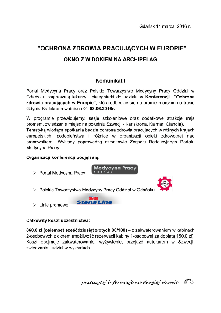 Gdańsk 14 marca 2016 r. "OCHRONA ZDROWIA PRACUJĄCYCH W EUROPIE" OKNO Z WIDOKIEM NA ARCHIPELAG Komunikat I Portal Medycyna Pracy oraz Polskie Towarzystwo Medycyny Pracy Oddział w Gdańsku zapraszają lekarzy i pielęgniarki do udziału w Konferencji "Ochrona zdrowia pracujących w Europie", która odbędzie się na promie morskim na trasie Gdynia-Karlskrona w dniach 01-03.06.2016r. W programie przewidujemy: sesje szkoleniowe oraz dodatkowe atrakcje (rejs promem, zwiedzanie miejsc na południu Szwecji - Karlskrona, Kalmar, Olandia). Tematyką wiodącą spotkania będzie ochrona zdrowia pracujących w różnych krajach europejskich, podobieństwa i różnice w organizacji opieki zdrowotnej nad pracownikami. Wykłady poprowadzą członkowie Zespołu Redakcyjnego Portalu Medycyna Pracy. Organizacji konferencji podjęli się: Portal Medycyna Pracy Polskie Towarzystwo Medycyny Pracy Oddział w Gdańsku Linie promowe Całkowity koszt uczestnictwa: 860,0 zł (osiemset sześćdziesiąt złotych 00/100) – z zakwaterowaniem w kabinach 2-osobowych z oknem (możliwość rezerwacji kabiny 1-osobowej za dopłatą 150,0 zł) Koszt obejmuje zakwaterowanie, wyżywienie, przejazd autokarem w Szwecji, zwiedzanie i udział w wykładach. przeczytaj informacje na drugiej stronie W związku z powyższym bardzo prosimy o: dokonanie do dnia 08.04.2016 roku wpłaty w wysokości: 860,0 złotych (lub 1010,0 złotych za kabinę 1-osobową) na konto bankowe: 73 8147 0002 0005 0685 2000 0050 Portal Medycyna Pracy - SoftMedica, Czersk ul. Tucholska 4 tytuł przelewu: „Szwecja, imię i nazwisko uczestnika/ów” Wpłaty za uczestnictwo przyjmowane są wyłącznie przelewem na wskazane konto, wpłaty dokonane bez wpisu w tytule przelewu hasła „Szwecja” i imienia z nazwiskiem będą odsyłane na rachunek nadawcy. Zgłoszenia uczestnictwa należy dokonać ostatecznie do dnia 08.04.2016 r.. (akceptowane są kompletnie i czytelnie wypełnione druki kart zgłoszenia) Karty zgłoszenia należy przesyłać wyłącznie drogą e-mailową na adres; [email protected] lub faksem (058) 340 59 01. Ilość miejsc ograniczona - decyduje kolejność zgłoszeń i wpłat (dysponujemy miejscami tylko w dwóch autokarach). Dodatkowych informacji udziela: Pani mgr Ewa Reglińska pod numerem tel.: 58 340-59-24 lub adresem mailowym [email protected] Liczę na Państwa uczestnictwo w szkoleniu i wspólne spędzenie czasu. z poważaniem Przewodniczący PTMP Oddział w Gdańsku dr n. med. Jacek Parszuto