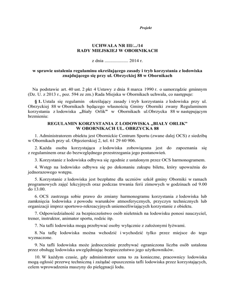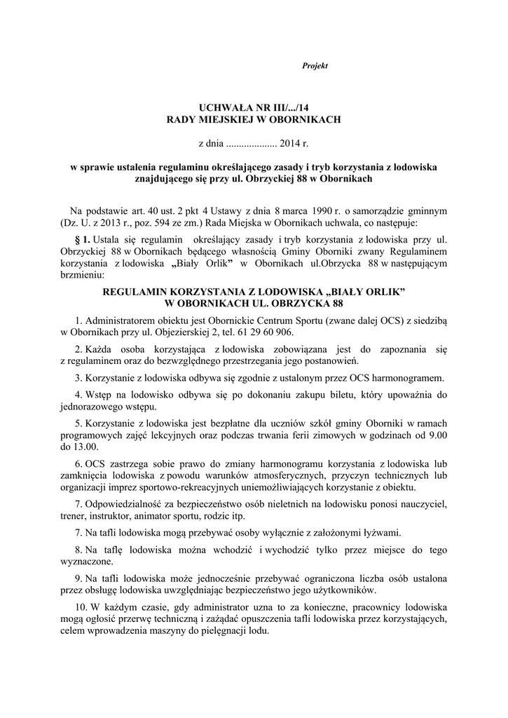 Projekt UCHWAŁA NR III/.../14 RADY MIEJSKIEJ W OBORNIKACH z dnia .................... 2014 r. w sprawie ustalenia regulaminu określającego zasady i tryb korzystania z lodowiska znajdującego się przy ul. Obrzyckiej 88 w Obornikach Na podstawie art. 40 ust. 2 pkt 4 Ustawy z dnia 8 marca 1990 r. o samorządzie gminnym (Dz. U. z 2013 r., poz. 594 ze zm.) Rada Miejska w Obornikach uchwala, co następuje: § 1. Ustala się regulamin określający zasady i tryb korzystania z lodowiska przy ul. Obrzyckiej 88 w Obornikach będącego własnością Gminy Oborniki zwany Regulaminem korzystania z lodowiska „Biały Orlik” w Obornikach ul.Obrzycka 88 w następującym brzmieniu: REGULAMIN KORZYSTANIA Z LODOWISKA „BIAŁY ORLIK” W OBORNIKACH UL. OBRZYCKA 88 1. Administratorem obiektu jest Obornickie Centrum Sportu (zwane dalej OCS) z siedzibą w Obornikach przy ul. Objezierskiej 2, tel. 61 29 60 906. 2. Każda osoba korzystająca z lodowiska zobowiązana jest do zapoznania się z regulaminem oraz do bezwzględnego przestrzegania jego postanowień. 3. Korzystanie z lodowiska odbywa się zgodnie z ustalonym przez OCS harmonogramem. 4. Wstęp na lodowisko odbywa się po dokonaniu zakupu biletu, który upoważnia do jednorazowego wstępu. 5. Korzystanie z lodowiska jest bezpłatne dla uczniów szkół gminy Oborniki w ramach programowych zajęć lekcyjnych oraz podczas trwania ferii zimowych w godzinach od 9.00 do 13.00. 6. OCS zastrzega sobie prawo do zmiany harmonogramu korzystania z lodowiska lub zamknięcia lodowiska z powodu warunków atmosferycznych, przyczyn technicznych lub organizacji imprez sportowo-rekreacyjnych uniemożliwiających korzystanie z obiektu. 7. Odpowiedzialność za bezpieczeństwo osób nieletnich na lodowisku ponosi nauczyciel, trener, instruktor, animator sportu, rodzic itp. 7. Na tafli lodowiska mogą przebywać osoby wyłącznie z założonymi łyżwami. 8. Na taflę lodowiska można wchodzić i wychodzić tylko przez miejsce do tego wyznaczone. 9. Na tafli lodowiska może jednocześnie przebywać ograniczona liczba osób ustalona przez obsługę lodowiska uwzględniając bezpieczeństwo jego użytkowników. 10. W każdym czasie, gdy administrator uzna to za konieczne, pracownicy lodowiska mogą ogłosić przerwę techniczną i zażądać opuszczenia tafli lodowiska przez korzystających, celem wprowadzenia maszyny do pielęgnacji lodu. 11. Wszystkich użytkowników obiektu obowiązuje ścisłe przestrzeganie przepisów BHP i ppoż. 12. Zaleca się jazdę w kaskach, nakolannikach i innych elementach ochronnych. 13. OCS nie ponosi odpowiedzialności za wypadki powstałe podczas korzystania z lodowiska. 14. Na lodowisku obowiązuje prawostronny ruch. 15. Podczas przebywania na lodowisku zabrania się: 1) organizowania niebezpiecznych zabaw, jazdy pod prąd, potrącania i podcinania; 2) jazdy z dziećmi na rękach; 3) wnoszenia na lodowisko broni, petard, materiałów łatwopalnych, szklanych opakowań, innych niebezpiecznych przedmiotów; 4) rzucania śnieżkami; 5) siadania na bandach lodowiska; 6) chodzenia po tafli lodowiska w obuwiu bez łyżew; 7) palenia tytoniu i spożywania alkoholu; 8) niszczenia sprzętu i urządzeń. 16. Osoby korzystające z lodowiska zobowiązane są do bezwzględnego podporządkowania się zaleceniom obsługi lodowiska. Niestosowanie się do postanowień regulaminu oraz zaleceń obsługi może skutkować usunięciem z terenu lodowiska. 17. Istnieje możliwość wypożyczenia łyżew. 18. Wypożyczenia łyżew można dokonać za okazaniem ważnego dokumentu tożsamości ze zdjęciem. 19. Zabrania się przekazywania innym osobom wypożyczonego sprzętu. 20. Wypożyczający ponosi pełną odpowiedzialność finansową za wypożyczony sprzęt. 21. Na łyżwach można przebywać tylko na tafli lodowiska oraz w miejscach wyłożonych gumową wykładziną. 22. Wypożyczenie łyżew oraz ich ostrzenie odbywa się na podstawie obowiązującego cennika. 23. OCS nie ponosi odpowiedzialności za pozostawione przedmioty i rzeczy wartościowe, osobiste. 24. Osoby naruszające porządek publiczny lub przepisy niniejszego regulaminu zostaną usunięte z terenu lodowiska niezależnie od ewentualnego skierowania sprawy na drogę postępowania sądowego 25. Telefony alarmowe: 1) Pogotowie ratunkowe: 2) Policja: 999; 997; 3) Centrum powiadamiania ratunkowego: 112. § 2. Wykonanie uchwały powierza się Burmistrzowi Obornik. § 3. Uchwała wchodzi w życie po upływie 14 dni od dnia ogłoszenia w Dzienniku Urzędowym Województwa Wielkopolskiego. UZASADNIENIE Zgodnie z art. 40 ust. 2 ustawy z dnia 8 marca 1990 r. o samorządzie gminnym, Rada Miejska może wydać akt prawa miejscowego w zakresie m.in. zasad i trybu korzystania z gminnych obiektów i urządzeń użyteczności publicznej. Akt ten ustanawia Rada Miejska w Obornikach w formie uchwały. Biorąc pod uwagę to, że lodowisko „Biały Orlik” w Obornikach ul. Obrzycka 88 jest obiektem użyteczności publicznej zasadne jest podjęcie uchwały ustanawiającej regulamin korzystania z tego lodowiska.