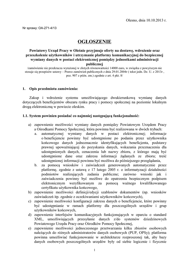 Olesno, dnia 10.10.2013 r. Nr sprawy: OA-271-4/13 OGŁOSZENIE Powiatowy Urząd Pracy w Oleśnie przyjmuje oferty na dostawę, wdrożenie oraz przeszkolenie użytkowników i utrzymanie platformy komunikacyjnej do bezpiecznej wymiany danych w postaci elektronicznej pomiędzy jednostkami administracji publicznej /zamówienie nie przekracza wyrażonej w złotych równowartości 14000 euro, w związku z powyższym nie stosuje się przepisów ustawy – Prawo zamówień publicznych z dnia 29.01.2004r ( tekst jedn. Dz. U. z 2013r , poz. 907 z późn. zm.) zgodnie z art. 4 pkt. 8/ 1. Opis przedmiotu zamówienia: Zakup i wdrożenie systemu umożliwiającego dwukierunkową wymianę danych dotyczących beneficjentów obszaru rynku pracy i pomocy społecznej na poziomie lokalnym drogą elektroniczną w powiecie oleskim. 1.1. System powinien posiadać co najmniej następującą funkcjonalność: a) zapewnienie możliwości wymiany danych pomiędzy Powiatowym Urzędem Pracy a Ośrodkami Pomocy Społecznej, która powinna być realizowana w dwóch trybach: a. automatycznej wymiany danych w postaci elektronicznej; informacje o beneficjencie powinny być udostępnione po podaniu przez użytkownika końcowego danych jednoznacznie identyfikujących beneficjenta, podstawy prawnej upoważniającej do pozyskania danych, wskazania przeznaczenia dla udostępnionych danych, oznaczenia lub nazwy zbioru, z którego mają być udostępnione dane oraz zakresu informacji żądanych ze zbioru; treść udostępnionej informacji powinna być możliwa do późniejszego przeglądania, b. za pomocą wniosków i zaświadczeń generowanych automatycznie przez platformę, zgodnie z ustawą z 17 lutego 2005 r. o informatyzacji działalności podmiotów realizujących zadania publiczne; zarówno wnioski jak i zaświadczenia powinny być możliwe do opatrzenia bezpiecznym podpisem elektronicznym weryfikowanym za pomocą ważnego kwalifikowanego certyfikatu użytkownika końcowego, b) zapewnienie możliwości definicji/edycji szablonów dokumentów (np. wniosków zaświadczeń itp. zgodnie z oczekiwaniami użytkowników końcowych), c) zapewnienie możliwości konfiguracji zakresu danych o beneficjencie, które powinny być udostępnianie w ramach platformy dla poszczególnych urzędów i grup użytkowników końcowych, d) zapewnienie interfejsów komunikacyjnych funkcjonujących w oparciu o standard XML, umożliwiających przesyłanie danych z/do systemów dziedzinowych Powiatowego Urzędu Pracy oraz Ośrodków Pomocy Społecznej, e) zapewnienie możliwości jednoczesnego przetwarzania kilku zbiorów osobowych należących do różnych administratorów danych osobowych (PUP, OPSy); platforma powinna umożliwiać funkcjonowanie w architekturze rozproszonej tak, aby bazy danych osobowych poszczególnych urzędów były od siebie logicznie i fizycznie 1 odseparowane oraz były możliwe do fizycznego przetrzymywania w obrębie odpowiednich urzędów będących administratorami danych osobowych lub podmiotami przez nie upoważnionymi do przetwarzania danych osobowych, f) dostęp do danych osobowych poprzez platformę powinien być nadzorowany i rejestrowany zgodnie z przepisami o ochronie danych osobowych; w szczególności powinien istnieć mechanizm umożliwiający identyfikację użytkownika końcowego uzyskującego dane osobowe, ich zakres, datę i cel ich pozyskania, g) zapewnienie możliwości rejestracji zdarzeń systemowych związanych z logowaniem, wylogowaniem, próbą zalogowania po podaniu błędnego hasła, zmianą hasła, blokowaniem oraz odblokowaniem użytkownika końcowego w platformie, h) platforma powinna funkcjonować wyłącznie w oparciu o dane beneficjentów pochodzące z systemów dziedzinowych Powiatowego Urzędu Pracy i Ośrodków Pomocy Społecznej; nie powinna umożliwiać dodawania, edycji lub usuwania danych beneficjentów. 1.2. Zakres danych o beneficjencie Powiatowego Urzędu Pracy, który powinien być możliwy do udostępnienia przez platformę automatycznie z systemu SyriuszSTD: a) Dane osobowe: a. Nazwisko i imię, b. PESEL, c. Data urodzenia, d. Rodzaj i numer dokumentu tożsamości, e. Płeć, f. Stan cywilny, g. Rodzaj adresu, kod pocztowy, miejscowość, ulica, nr domu, nr lokalu. b) Dane osoby, od kiedy, do kiedy, jakie świadczenia i zasiłki ma przyznane i jakie pobrała, czy jest wyrejestrowana z ewidencji: a. Okresy rejestracji w powiatowym urzędzie pracy: - Data początkowa i końcowa, - Status osoby na rynku pracy (bezrobotny, poszukujący pracy), b. Przyznane świadczenia i zasiłki w powiatowym urzędzie pracy: - Nazwa świadczenia/zasiłku, - Data początkowa i końcowa, c. Zasiłki pobierane w powiatowym urzędzie pracy: - Data początkowa i końcowa, - Wysokość zasiłku brutto i netto, d. Inne świadczenia pobierane w powiatowym urzędzie pracy: - Data początkowa i końcowa, - Wysokość świadczenia brutto i netto. c) Szkolenia proponowane osobie wraz z informacja o ewentualnej odmowie: a. Data przedłożenia propozycji, b. Czy propozycja przyjęta, c. Czy odmowa uzasadniona, d. Proponowane szkolenie. d) Szkolenia odbyte przez osobę: a. Data skierowania, b. Zakres tematyczny szkolenia, c. Sposób zakończenia szkolenia (ukończone, przerwane, w trakcie), d. Data rozpoczęcia i zakończenia szkolenia. e) Praca proponowana osobie wraz z informacją o ewentualnej odmowie: 2 f) g) h) i) a. Data przedłożenia propozycji, b. Czy propozycja przyjęta, c. Czy odmowa uzasadniona, d. Proponowane stanowisko, e. Rodzaj propozycji. Wykształcenie i kwalifikacje zawodowe osoby: a. Posiadane wykształcenia: - Rodzaj wykształcenia, b. Zawody wyuczone i wykonywane: - Nazwa zawodu, - Informacja o tym, czy jest to zawód wyuczony czy wykonywany, c. Posiadane uprawnienia: - Nazwa uprawnienia, d. Znajomość języków obcych: - Nazwa języka obcego, - Stopień znajomości języka w mowie, piśmie i czytaniu, e. Posiadane umiejętności: - Nazwa umiejętności. Historia kontaktów osoby z urzęde
