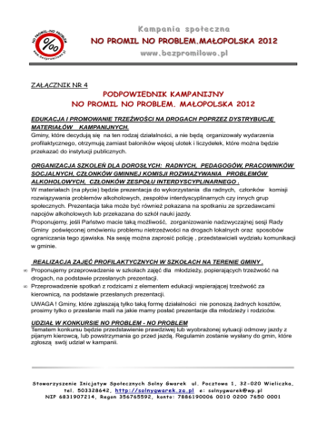 KKaam mppaanniiaa ssppoołłeecczznnaa N NO O PPR RO OM MIILL N NO O PPR RO OBBLLEEM M..M MA AŁŁO OPPO OLLS SKKA A 22001122 w ww ww w..bbeezzpprroom miilloow woo..ppll ZAŁĄCZNIK NR 4 PODPOWIEDNIK KAMPANIJNY NO PROMIL NO PROBLEM. MAŁOPOLSKA 2012 EDUKACJA I PROMOWANIE TRZEŹWOŚCI NA DROGACH POPRZEZ DYSTRYBUCJĘ MATERIAŁÓW KAMPANIJNYCH. Gminy, które decydują się na ten rodzaj działalności, a nie będą organizowały wydarzenia profilaktycznego, otrzymują zamiast baloników więcej ulotek i liczydełek, które można będzie przekazać do instytucji publicznych. ORGANIZACJA SZKOLEŃ DLA DOROSŁYCH: RADNYCH, PEDAGOGÓW, PRACOWNIKÓW SOCJALNYCH, CZŁONKÓW GMINNEJ KOMISJI ROZWIĄZYWANIA PROBLEMÓW ALKOHOLOWYCH, CZŁONKÓW ZESPOŁU INTERDYSCYPLINARNEGO . W materiałach (na płycie) będzie prezentacja do wykorzystania dla radnych, członków komisji rozwiązywania problemów alkoholowych, zespołów interdyscyplinarnych czy innych grup społecznych. Prezentacja taka może być również pokazana na spotkaniu ze sprzedawcami napojów alkoholowych lub przekazana do szkół nauki jazdy. Proponujemy, jeśli Państwo macie taką możliwość, zorganizowanie nadzwyczajnej sesji Rady Gminy poświęconej omówieniu problemu nietrzeźwości na drogach lokalnych oraz sposobów ograniczania tego zjawiska. Na sesję można zaprosić policję , przedstawicieli wydziału komunikacji w gminie. REALIZACJA ZAJĘĆ PROFILAKTYCZNYCH W SZKOŁACH NA TERENIE GMINY . • Proponujemy przeprowadzenie w szkołach zajęć dla młodzieży, popierających trzeźwość na drogach, na podstawie przesłanych prezentacji. • Przeprowadzenie spotkań z rodzicami z elementem edukacji wspierającej trzeźwość za kierownicą, na podstawie przesłanych prezentacji. UWAGA ! Gminy, które zgłaszają tylko taką formę działalności nie ponoszą żadnych kosztów, prosimy tylko o przesłanie maili na jakie mamy posłać prezentacje dla młodzieży i rodziców. UDZIAŁ W KONKURSIE NO PROBLEM - NO PROBLEM Tematem konkursu będzie przedstawienie prawdziwej lub wyobrażonej sytuacji odmowy jazdy z pijanym kierowcą, lub powstrzymania go przed jazdą. Regulamin zostanie wysłany do gmin, które zgłoszą swój udział w kampanii. Stowarzyszenie Inicjatyw Społecznych Solny Gwarek ul. Pocztowa 1, 32-020 Wieliczka, t e l . 5 0 3 3 2 8 6 4 2 , ht t p: / / so l n ygw ar e k.z a .p l e : s o l n y g w a r e k @ w p . p l NIP 6831907214, Regon 356765592, konto: 7886190006 0010 0200 7650 0001 KKaam mppaanniiaa ssppoołłeecczznnaa N NO O PPR RO OM MIILL N NO O PPR RO OBBLLEEM M..M MA AŁŁO OPPO OLLS SKKA A 22001122 w ww ww w..bbeezzpprroom miilloow woo..ppll Nadesłane prace zostaną zakwalifikowane do kategorii : szkoły podstawowe, gimnazja, ponadgimnazjalne, dorośli. Autor wybiera formę, spośród przedstawionych poniżej: 1. Literacka: np.: opowiadanie, reportaż, wywiad, wiersz, pamiętnik, list, esej, opis wydarzeń na podstawie relacji przekazanych przez bliskich, przyjaciół, znajomych itp. Prace mogą być wzbogacone ilustracjami i zdjęciami. 2. Multimedialna np.: prezentacja, film, wywiad nagranie audycji radiowej, słuchowiska, stworzenie albumu multimedialnego– technika dowolna. 3. Plastyczno - techniczna: np.: album, gazetka, projekt plakatu, komiks, instalacja przestrzenna. Technika plastyczna dowolna (farba, tusz, kredka, batik, witraż, collage, wyklejanie, techniki własne). ORGANIZACJA WYDARZENIA PROFILAKTYCZNEGO NA RZECZ POPARCIA TRZEŹWOŚCI NA DROGACH. Organizację wydarzenia profilaktycznego umiejscowiliśmy tym razem w pobliżu Dnia Pamięci Ofiar Wypadków Drogowych (trzecia niedziela listopada). Do udziału w marszu zaproszeni są wszyscy, dla których bezpieczeństwo na drodze jest ważne, i którzy poprzez takie akcje chcą przeciwdziałać nieodpowiedzialności nietrzeźwych kierowców. Uczestnicy marszu będą nieśli wykonane przez siebie transparenty z hasłami kampanii, rozdawali materiały edukacyjne. Uczniowie w szkołach przygotowują transparenty, ulotki, plakaty propagujące bezpromilową jazdę samochodem oraz/lub zachęcające pasażerów aby powstrzymywali nietrzeźwego przed wsiadaniem za kierownicę. Przygotowują też urnę do zbierania deklaracji pasażera/świadka. W dniu 16 listopada (lub w innym dniu w IV tygodniu listopada) wychodzą ze szkoły i; − − − − pikietują przed szkołą z transparentami, maszerują ustaloną wcześniej trasą i rozdają ulotki, odwiedzają różne miejsca na terenie gminy, (np. ośrodek zdrowia, przystanek, apteka) zbierając podpisy pod deklaracjami pasażera/świadka, realizują inny , własny pomysł Szkoły, które z przygotowań do marszu i samego marszu wyślą raport do biura kampanii otrzymają upominki – niespodzianki. (do raportu można dołączyć zdjęcia, filmy, nagrania skandowanych haseł, prezentację, filmik fleszowy, teledysk wykorzystany podczas marszu) PUBLIKACJA INFORMACJI O KAMPANII I JEJ PRZEKAZIE NA STRONACH INTERNETOWYCH ORAZ W LOKALNEJ PRASIE I MEDIACH . Wzory informacji prasowych, loga kampanii będą w materiałach. W redagowaniu informacji prasowych do wykorzystania wszystkie informacje zamieszczone na stronie www.bezpromilowo.pl Stowarzyszenie Inicjatyw Społecznych Solny Gwarek ul. Pocztowa 1, 32-020 Wieliczka, t e l . 5 0 3 3 2 8 6 4 2 , ht t p: / / so l n ygw ar e k.z a .p l e : s o l n y g w a r e k @ w p . p l NIP 6831907214, Regon 356765592, konto: 7886190006 0010 0200 7650 0001 KKaam mppaanniiaa ssppoołłeecczznnaa N NO O PPR RO OM MIILL N NO O PPR RO OBBLLEEM M..M MA AŁŁO OPPO OLLS SKKA A 22001122 w ww ww w..bbeezzpprroom miilloow woo..ppll AKCJA „LISTY DZIECI DO KIEROWCÓW” Proponujemy nawiązanie współpracy z komendą powiatową policji. Wojewódzki Komendant Policji skieruje do komend powiatowych pismo z prośbą o wsparcie działań lokalnych realizowanych w ramach kampanii. Tytułowe wspólne działania to kontrole trzeźwości połączone z przekazywaniem listów, które dzieci w trak