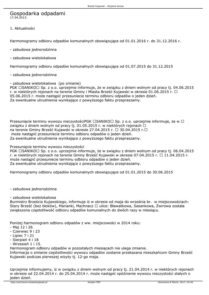Brześć Kujawski - oficjalna strona Gospodarka odpadami 17.04.2013. 1. Aktualności Harmonogramy odbioru odpadów komunalnych obowiązujące od 01.01.2016 r. do 31.12.2016 r. - zabudowa jednorodzinna - zabudowa wielolokalowa Harmonogramy odbioru odpadów komunalnych obowiązujące od 01.07.2015 do 31.12.2015 - zabudowa jednorodzinna - zabudowa wielolokalowa (po zmianie) PGK SANIKO Sp. z o.o. uprzejmie informuje, że w związku z dniem wolnym od pracy tj. 04.06.2015 r. w niektórych rejonach na terenie Gminy i Miasta Brześć Kujawski w okresie 01.06.2015 r. 05.06.2015 r. może nastąpić przesuniecie terminu odbioru odpadów o jeden dzień. Za ewentualne utrudnienia wynikające z powyższego faktu przepraszamy. Przesunięcie terminu wywozu nieczystościPGK SANIKO Sp. z o.o. uprzejmie informuje, że w związku z dniem wolnym od pracy tj. 01.05.2015 r. w niektórych rejonach na terenie Gminy Brześć Kujawski w okresie 27.04.2015 r. 30.04.2015 r. może nastąpić przesuniecie terminu odbioru odpadów o jeden dzień. Za ewentualne utrudnienia wynikające z powyższego faktu przepraszamy. Przesunięcie terminu wywozu nieczystości PGK SANIKO Sp. z o.o. uprzejmie informuje, że w związku z dniem wolnym od pracy tj. 06.04.2015 r. w niektórych rejonach na terenie Gminy Brześć Kujawski w okresie 07.04.2015 r. 11.04.2015 r. może nastąpić przesuniecie terminu odbioru odpadów o jeden dzień. Za ewentualne utrudnienia wynikające z powyższego faktu przepraszamy. Harmonogramy odbioru odpadów komunalnych obowiązujące od 01.01.2015 do 30.06.2015 - zabudowa jednorodzinna - zabudowa wielolokalowa Burmistrz Brześcia Kujawskiego, informuje iż w okresie od maja do września br. w miejscowościach: Stary Brześć (bez bloków), Marianki, Machnacz ulice: Bławatkowa, Sasankowa, Żwirowa została zwiększona częstotliwość odbioru odpadów komunalnych do dwóch razy w miesiącu. Poniżej harmonogram odbioru odpadów z ww. miejscowości w 2014 roku: - Maj 12 i 26 - Czerwiec 9 i 23 - Lipiec 7 i 21 - Sierpień 4 i 18 - Wrzesień 1 i 15. Harmonogram odbioru odpadów w pozostałych miesiącach nie ulega zmianie. Informacja o zmianie częstotliwości wywozu odpadów zostanie przekazana mieszkańcom Gminy Brześć Kujawski podczas pierwszej wizyty tj. 12-go maja. Uprzejmie informujemy, iż w związku z dniem wolnym od pracy tj. 21.04.2014 r. w niektórych rejonach w okresie od 22.04.2014 r. do 25.04.2014 r. może nastąpić opóźnienie wywozu nieczystości stałych o jeden dzień. http://archiwum.brzesckujawski.pl Kreator PDF Utworzono 8 March, 2017, 02:42 Brześć Kujawski - oficjalna strona Za powstałe utrudnienia przepraszamy. Harmonogramy odbioru odpadów komunalnych obowiązujący w 2014 roku. - Zabudowa jednorodzinna - Zabudowa wielolokalowa - Wykaz nieruchomości wielolokalowych położonych na terenie gminy Brześć Kujawski z których będzie odbierany popiół gromadzony w workach typu BIG BAG Harmonogram odbioru popiołu: - zabudowa jednorodzinna - wykaz nieruchomości wielolokalowych położonych na terenie gminy Brześć Kujawski z których będzie odbierany popiół gromadzony w workach typu BIG BAG2. Zasady nowego systemu gospodarowania odpadami komunalnymi w gminie Brześć Kujawski 3. Deklaracje 4. Opłaty 5. Punk Selektywnej Zbiórki Odpadów komunalnych (PSZOK) 6. Uchwały - Uchwała Nr XXIII/175/12 Rady Miejskiej w Brześciu Kujawskim z dnia 22 marca 2013r. w sprawie regulaminu utrzymania czystości i porządku na terenie Gminy Brześć Kujawski - Uchwała Nr XXIII/181/12 Rady Miejskiej w Brześciu Kujawskim z dnia 22 marca 2013r. w sprawie ustalenia szczegółowego sposobu i zakresu świadczenia usług w zakresie odbierania odpadów komunalnych od właścicieli nieruchomości i zagospodarowania tych odpadów, w zamian za uiszczoną przez właściciela nieruchomości opłatę za gospodarowanie odpadami komunalnymi - Uchwała Nr XXIII/178/12 Rady Miejskiej w Brześciu Kujawskim z dnia 22 marca 2013r. w sprawie wyboru metody ustalenia opłaty za gospodarowanie odpadami komunalnymi na terenie nieruchomości, na którym zamieszkują mieszkańcy oraz ustalenia stawki opłaty - Uchwała Nr XXIII/179/12 Rady Miejskiej w Brześciu Kujawskim z dnia 22 marca 2013r. w sprawie terminu, częstotliwości i trybu uiszczania opłaty za gospodarowanie odpadami komunalnymi - Uchwała Nr XXIII/180/12 Rady Miejskiej w Brześciu Kujawskim z dnia 22 marca 2013r. w sprawie wzoru deklaracji o wysokości opłaty za gospodarowanie odpadami komunalnymi składanej przez właścicieli nieruchomości zamieszkałych - Uchwała Nr XXVIII/215/13 Rady Miejskiej w Brześciu Kujawskim z dnia 8 listopada 2013r. zmieniająca uchwałę w sprawie wzoru deklaracji o wysokości opłaty za gospodarowanie odpadami komunalnymi 7. Dla przedsiębiorców - rejestr działalności regulowanej 8. Kontakt Archiwum aktualności http://archiwum.brzesckujawski.pl Kreator PDF Utworzono 8 March, 2017, 02:42 Brześć Kujawski - oficjalna strona Przesunięcia wywozu nieczystości w dniach 07.01 - 11.01.2013r. Harmonogramy odbioru odpadów komunalnych obowiązujące od sierpnia 2013r. - Zabudowa jednorodzinna - Zabudowa wielolokalowa Uprzejmie informujemy, iż w związku z dniami wolnymi od pracy tj. 25-26.12.2013 r. i 01.01.2014 r. w niektórych rejonach w okresie od 23.12.2013 r. do 27.12.2013 r. i 30.12.2013 r do 03.01.2014 r. może nastąpić przesunięcie wywozu nieczystości stałych o jeden dzień. Za powstałe utrudnienia przepraszamy. Przesunięcia terminu odbioru odpadów komunalnych Uprzejmie informujemy, iż w związku z dniem wolnym od pracy tj. 11.11.2013r. w niektórych rejonach w okresie od 11.11.2013r. do 16.11.2013r. może nastąpić przesunięcie wywozu nieczystości stałych o jeden dzień. Za powstałe utrudnienia przepraszamy. Przesunięcia terminu odbioru odpadów komunalnych Uprzejmie informujemy, iż w związku z dniem wolnym od pracy tj. 01.11.2013r. w niektórych rejonach w okresie od 28.10.2013r. do 02.11.2013