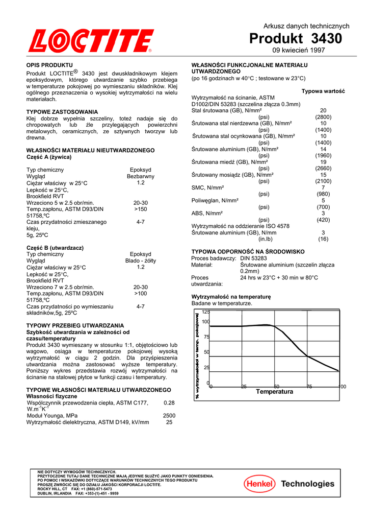Arkusz danych technicznych Produkt 3430 09 kwiecień 1997 OPIS PRODUKTU Produkt LOCTITE® 3430 jest dwuskładnikowym klejem epoksydowym, którego utwardzanie szybko przebiega w temperaturze pokojowej po wymieszaniu składników. Klej ogólnego przeznaczenia o wysokiej wytrzymałości na wielu materiałach. TYPOWE ZASTOSOWANIA Klej dobrze wypełnia szczeliny, toteż nadaje się do chropowatych lub źle przylegających powierzchni metalowych, ceramicznych, ze sztywnych tworzyw lub drewna. WŁASNOŚCI MATERIAŁU NIEUTWARDZONEGO Część A (żywica) Typ chemiczny Wygląd Ciężar właściwy w 25°C Lepkość w 25°C, Brookfield RVT Wrzeciono 5 w 2.5 obr/min. Temp.zapłonu, ASTM D93/DIN 51758,ºC Czas przydatności zmieszanego kleju, 5g, 25ºC Część B (utwardzacz) Typ chemiczny Wygląd Ciężar właściwy w 25°C Lepkość w 25°C, Brookfield RVT Wrzeciono 7 w 2.5 obr/min. Temp.zapłonu, ASTM D93/DIN 51758,ºC Czas przydatności po wymieszaniu składników,5g, 25ºC Epoksyd Bezbarwny 1.2 20-30 >150 4-7 Epoksyd Blado - żółty 1.2 20-30 >100 4-7 TYPOWY PRZEBIEG UTWARDZANIA Szybkość utwardzania w zależności od czasu/temperatury Produkt 3430 wymieszany w stosunku 1:1, objętościowo lub wagowo, osiąga w temperaturze pokojowej wysoką wytrzymałość w ciągu 2 godzin. Dla przyśpieszenia utwardzania można zastosować wyższe temperatury. Poniższy wykres przedstawia rozwój wytrzymałości na ścinanie na stalowej płytce w funkcji czasu i temperatury. TYPOWE WŁASNOŚCI MATERIAŁU UTWARDZONEGO Własności fizyczne 0.28 Wspólczynnik przewodzenia ciepła, ASTM C177, -1 -1 W.m K Moduł Younga, MPa 2500 Wytrzymałość dielektryczna, ASTM D149, kV/mm 25 WŁASNOŚCI FUNKCJONALNE MATERIAŁU UTWARDZONEGO (po 16 godzinach w 40°C ; testowane w 23°C) Typowa wartość Wytrzymałość na ścinanie, ASTM D1002/DIN 53283 (szczelina złącza 0.3mm) Stal śrutowana (GB), N/mm² (psi) Śrutowana stal nierdzewna (GB), N/mm² (psi) Śrutowana stal ocynkowana (GB), N/mm² (psi) Śrutowane aluminium (GB), N/mm² (psi) Śrutowana miedź (GB), N/mm² (psi) Śrutowany mosiądz (GB), N/mm² (psi) SMC, N/mm² (psi) Poliwęglan, N/mm² (psi) ABS, N/mm² (psi) Wytrzymałość na oddzieranie ISO 4578 Śrutowane aluminium (GB), N/mm (in.lb) 20 (2800) 10 (1400) 10 (1400) 14 (1960) 19 (2660) 15 (2100) 7 (980) 5 (700) 3 (420) 3 (16) TYPOWA ODPORNOŚĆ NA ŚRODOWISKO Proces badawczy: DIN 53283 Materiał: Śrutowane aluminium (szczelin złącza 0.2mm) Proces 24 hrs w 23°C + 30 min w 80°C utwardzania: Wytrzymałość na temperaturę Badane w temperaturze. 125 100 75 50 25 0 0 NIE DOTYCZY WYMOGÓW TECHNICZNYCH. PRZYTOCZONE TUTAJ DANE TECHNICZNE MAJĄ JEDYNIE SŁUŻYĆ JAKO PUNKTY ODNIESIENIA. PO POMOC I WSKAZÓWKI DOTYCZĄCE WARUNKÓW TECHNICZNYCH TEGO PRODUKTU PROSZĘ ZWRÓCIĆ SIĘ DO DZIAŁU JAKOŚCI KORPORACJI LOCTITE. ROCKY HILL, CT FAX: +1 (860)-571-5473 DUBLIN, IRLANDIA FAX: +353-(1)-451 - 9959 25 50 Temperatura 75 100 TDS Loctite®3430 09 kwiecień 1997 Odporność chemiczna Medium Temp . Kwas octowy 10% Octan etylu Benzyna Metanol Woda Woda Wilgot.wzgl. 92% RH 23°C 23°C 23°C 23°C 20ºC 90°C 40°C % wtrzymałości początkowej pozostały po 1000 hr 25 50 50 75 75 25 60 INFORMACJA OGÓLNA Nie poleca się stosowania tego produktu do urządzeń z czystym tlenem i/lub bogatych w tlen; nie powinien też być używany jako uszczelniacz do instalacji z chlorem i innych materiałów silnie utleniających. zastosowania, a w konsek-wencji za uzyskane przez niego rezultaty. Sprawą użytkownika jest także podjęcie odpowiednich środków ostrożności, aby uniknąć ew. ryzyka dla produkcji i osób, wiążącego się z użyt-kowaniem produktu. Korporacja Loctite nie uwzględnia żad-nych roszczeń związanych z uszkodzeniem, zniszczeniem produkcji czy utratą zysku. Stanowisko to wynika z faktu, że Kor-poracja Loctite nie ma kontroli nad sposobami korzystania z produktu przez poszczególnych użytkowników, nie możemy zatem współuczestniczyć w konsekwencjach ew. błędów czy niedopatrzeń. Opisane tutaj procesy nie muszą być wyłącznie patentami lub licencjami Korporacji Loctite. Radzimy, aby każ-dy użytkownik, przed zastosowaniem produktu, przeprowadził własną próbę posługując się przedstawionymi tu danymi jako przewodnikiem. Ten produkt może być objęty jednym lub większą liczbą patentów lub opatentowanych aplikacji. Pełna informacja dotycząca bezpiecznego obchodzenia się z tym produktem znajduje się w Arkuszu Bezpieczeństwa dotyczącym materiału (MSDS). Jeśli do czyszczenia powierzchni przed klejeniem stosuje się wodne urządzenia zmywające, należy koniecznie sprawdzić, czy roztwór wodny jest odpowiedni dla danego kleju. W pewnych przypadkach takie wodne zmywanie może mieć wpływ na utwardzanie i na własności kleju. Wskazówki dotyczące stosowania Aby uzyskać jak najlepsze wyniki, należy oczyścić i odtłuścić powierzchnie. Przed użyciem należy wymieszać żywicę z utwardzaczem na jednolitą masę. Produkt można nanosić bezpośrednio z opakowania poprzez końcówkę mieszającą (1:1) lub ręcznie, po wymiszaniu szpatułką w stosunku 1:1 (objętościowo lub wagowo). Czas przydatności zmieszanego o w małych ilościach kleju wynosi 4 min. w 25 C. Wyższa temperatura skraca ten czas. Prawidłowo wymieszany produkt ma blado-żółtą (jednolitą) barwę. Zalecana szczelina złącza wynosi 0.05 do 1.00mm. Części należy natychmiast złączyć po naniesieniu na jedną powierzchnię wymieszanego kleju. Nadmiar kleju można usunąć rozpuszczalnikiem organicznym (np. acetonem). Złącze powinno pozostawać w zacisku do czasu ustalenia się kleju. Nie należy obciążać złącza zanim nie osiągnie ono pełnej wytrzymałości. Urządzenie mieszające i dozujące należy umyć gorącą wodą mydlaną zanim klej stwardnieje. Magazynowanie (Część A Żywica i Część B Utwardzacz) O ile na etykiecie produktu nie ma innych wskazań, idealnym sposobem jego przecho