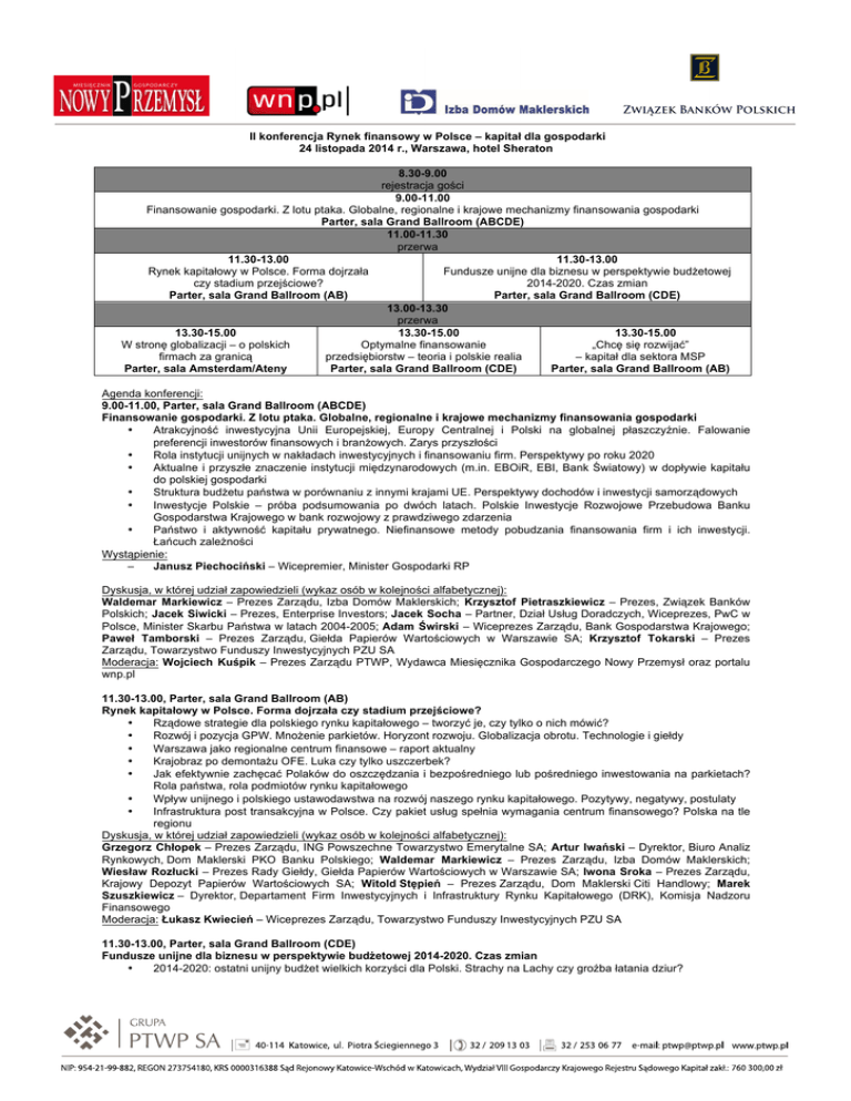 II konferencja Rynek finansowy w Polsce – kapitał dla gospodarki 24 listopada 2014 r., Warszawa, hotel Sheraton 8.30-9.00 rejestracja gości 9.00-11.00 Finansowanie gospodarki. Z lotu ptaka. Globalne, regionalne i krajowe mechanizmy finansowania gospodarki Parter, sala Grand Ballroom (ABCDE) 11.00-11.30 przerwa 11.30-13.00 11.30-13.00 Rynek kapitałowy w Polsce. Forma dojrzała Fundusze unijne dla biznesu w perspektywie budżetowej czy stadium przejściowe? 2014-2020. Czas zmian Parter, sala Grand Ballroom (AB) Parter, sala Grand Ballroom (CDE) 13.00-13.30 przerwa 13.30-15.00 13.30-15.00 13.30-15.00 W stronę globalizacji – o polskich Optymalne finansowanie „Chcę się rozwijać” firmach za granicą przedsiębiorstw – teoria i polskie realia – kapitał dla sektora MSP Parter, sala Amsterdam/Ateny Parter, sala Grand Ballroom (CDE) Parter, sala Grand Ballroom (AB) Agenda konferencji: 9.00-11.00, Parter, sala Grand Ballroom (ABCDE) Finansowanie gospodarki. Z lotu ptaka. Globalne, regionalne i krajowe mechanizmy finansowania gospodarki • Atrakcyjność inwestycyjna Unii Europejskiej, Europy Centralnej i Polski na globalnej płaszczyźnie. Falowanie preferencji inwestorów finansowych i branżowych. Zarys przyszłości • Rola instytucji unijnych w nakładach inwestycyjnych i finansowaniu firm. Perspektywy po roku 2020 • Aktualne i przyszłe znaczenie instytucji międzynarodowych (m.in. EBOiR, EBI, Bank Światowy) w dopływie kapitału do polskiej gospodarki • Struktura budżetu państwa w porównaniu z innymi krajami UE. Perspektywy dochodów i inwestycji samorządowych • Inwestycje Polskie – próba podsumowania po dwóch latach. Polskie Inwestycje Rozwojowe Przebudowa Banku Gospodarstwa Krajowego w bank rozwojowy z prawdziwego zdarzenia • Państwo i aktywność kapitału prywatnego. Niefinansowe metody pobudzania finansowania firm i ich inwestycji. Łańcuch zależności Wystąpienie: – Janusz Piechociński – Wicepremier, Minister Gospodarki RP Dyskusja, w której udział zapowiedzieli (wykaz osób w kolejności alfabetycznej): Waldemar Markiewicz – Prezes Zarządu, Izba Domów Maklerskich; Krzysztof Pietraszkiewicz – Prezes, Związek Banków Polskich; Jacek Siwicki – Prezes, Enterprise Investors; Jacek Socha – Partner, Dział Usług Doradczych, Wiceprezes, PwC w Polsce, Minister Skarbu Państwa w latach 2004-2005; Adam Świrski – Wiceprezes Zarządu, Bank Gospodarstwa Krajowego; Paweł Tamborski – Prezes Zarządu, Giełda Papierów Wartościowych w Warszawie SA; Krzysztof Tokarski – Prezes Zarządu, Towarzystwo Funduszy Inwestycyjnych PZU SA Moderacja: Wojciech Kuśpik – Prezes Zarządu PTWP, Wydawca Miesięcznika Gospodarczego Nowy Przemysł oraz portalu wnp.pl 11.30-13.00, Parter, sala Grand Ballroom (AB) Rynek kapitałowy w Polsce. Forma dojrzała czy stadium przejściowe? • Rządowe strategie dla polskiego rynku kapitałowego – tworzyć je, czy tylko o nich mówić? • Rozwój i pozycja GPW. Mnożenie parkietów. Horyzont rozwoju. Globalizacja obrotu. Technologie i giełdy • Warszawa jako regionalne centrum finansowe – raport aktualny • Krajobraz po demontażu OFE. Luka czy tylko uszczerbek? • Jak efektywnie zachęcać Polaków do oszczędzania i bezpośredniego lub pośredniego inwestowania na parkietach? Rola państwa, rola podmiotów rynku kapitałowego • Wpływ unijnego i polskiego ustawodawstwa na rozwój naszego rynku kapitałowego. Pozytywy, negatywy, postulaty • Infrastruktura post transakcyjna w Polsce. Czy pakiet usług spełnia wymagania centrum finansowego? Polska na tle regionu Dyskusja, w której udział zapowiedzieli (wykaz osób w kolejności alfabetycznej): Grzegorz Chłopek – Prezes Zarządu, ING Powszechne Towarzystwo Emerytalne SA; Artur Iwański – Dyrektor, Biuro Analiz Rynkowych, Dom Maklerski PKO Banku Polskiego; Waldemar Markiewicz – Prezes Zarządu, Izba Domów Maklerskich; Wiesław Rozłucki – Prezes Rady Giełdy, Giełda Papierów Wartościowych w Warszawie SA; Iwona Sroka – Prezes Zarządu, Krajowy Depozyt Papierów Wartościowych SA; Witold Stępień – Prezes Zarządu, Dom Maklerski Citi Handlowy; Marek Szuszkiewicz – Dyrektor, Departament Firm Inwestycyjnych i Infrastruktury Rynku Kapitałowego (DRK), Komisja Nadzoru Finansowego Moderacja: Łukasz Kwiecień – Wiceprezes Zarządu, Towarzystwo Funduszy Inwestycyjnych PZU SA 11.30-13.00, Parter, sala Grand Ballroom (CDE) Fundusze unijne dla biznesu w perspektywie budżetowej 2014-2020. Czas zmian • 2014-2020: ostatni unijny budżet wielkich korzyści dla Polski. Strachy na Lachy czy groźba łatania dziur? Polityka wędki. Rola PARP i ministerstw we właściwym wydatkowaniu środków z Unii. Nowe programy i możliwości finansowania rozwoju firm • Perspektywa budżetowa 2014-2020 w ocenie firm i administracji: redukcja grantów, skokowy wzrost dogodnych pożyczek, poręczeń i mechanizmów hybrydowych • Finansowanie fundamentów rozwoju. Odwrócenie proporcji (uczelnie – przedsiębiorstwa) w kierowaniu państwowych i unijnych pieniędzy na B+R. Inni adresaci wsparcia. Zadania NCBiR • Doświadczenia przedsiębiorców w pożytkowaniu unijnych funduszy Dyskusja, w której udział zapowiedzieli (wykaz osób w kolejności alfabetycznej): Michał Gorzelak – Szef Obszaru Instrumentów Dłużnych, Krajowy Punkt Kontaktowy ds. Instrumentów Finansowych Programów UE; Krzysztof Kurzydłowski – Dyrektor, Narodowe Centrum Badań i Rozwoju; Bożena Lublińska-Kasprzak – Prezes, Polska Agencja Rozwoju Przedsiębiorczości; Teresa Matoga – Dyrektor Biura ds. Programów Unijnych i Programów Publicznych, BNP Paribas; Anita Wesołowska – Zastępca Dyrektora, Departament Konkurencyjności i Innowacyjności, Ministerstwo Infrastruktury i Rozwoju; Patrycja Zielińska – Wiceprezes Zarządu, Agencji Rozwoju Przemysłu SA Moderacja: Jacek Ziarno – Zastępca Redaktora Naczelnego, Miesięcznik Gospodarczy Nowy Przemysł • 13.30-15