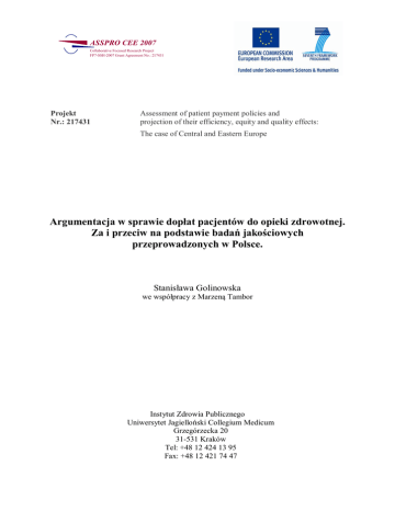ASSPRO CEE 2007 Collaborative Focused Research Project FP7-SSH-2007 Grant Agreement No.: 217431 Projekt Nr.: 217431 Assessment of patient payment policies and projection of their efficiency, equity and quality effects: The case of Central and Eastern Europe Argumentacja w sprawie dopłat pacjentów do opieki zdrowotnej. Za i przeciw na podstawie badań jakościowych przeprowadzonych w Polsce. Stanisława Golinowska we współpracy z Marzeną Tambor Instytut Zdrowia Publicznego Uniwersytet Jagielloński Collegium Medicum Grzegórzecka 20 31-531 Kraków Tel: +48 12 424 13 95 Fax: +48 12 421 74 47 Wprowadzenie Badania na temat dopłat pacjentów do świadczeń opieki zdrowotnej dotyczą opinii różnych grup respondentów, zebranych na podstawie dwóch rodzajów metod badawczych: badań fokusowych oraz pogłębionych wywiadów. Narzędzia badawcze zostały przygotowane w ramach prac metodologicznych projektu ASSPRO CEE 2007 kierowanych przez Milenę Pavlovą i współpracowników. Badania fokusowe przeprowadzone zostały w okresie czerwiec-październik 2009 r. w grupach korzystających z opieki zdrowotnej (1): studentów, osób pracujących w mieście, rodzin z dziećmi, emerytów, osób niepełnosprawnych, osób z terenów wiejskich oraz (2) w grupach świadczeniodawców (health care providers): lekarzy pierwszego kontaktu z terenów miejskich oraz z terenów wiejskich, specjalistów opieki ambulatoryjnej, lekarzy i pielęgniarek pracujących w szpitalach w dużym mieście oraz lekarzy pracujących w szpitalach w małym mieście. Pogłębione wywiady przeprowadzono z 9-cioma respondentami, dobranymi celowo ze względu na decyzyjną rolę, jaką pełnią w systemie ochrony zdrowia na jego różnych szczeblach oraz w różnych instytucjach opieki zdrowotnej. Byli to policy makers szczebla krajowego: Ministerstwa Zdrowia i Narodowego Funduszu Zdrowia (NFZ) oraz związanych z Ministerstwem Finansów, a także ze szczebla regionalnego: samorządów lokalnych oraz wojewódzkich oddziałów NFZ. W grupie respondentów znajdował się także przedstawiciel sektora prywatnych ubezpieczeń zdrowotnych. Analiza rezultatów obu rodzajów badań jakościowych pozwala wydobyć główne argumenty respondentów, zarówno tych, którzy popierają wprowadzenie dopłat, jak i im przeciwnych, a także niezdecydowanych. W przygotowanym opracowaniu przedstawiono wyartykułowane argumenty oraz ich uzasadnienie ze wskazaniem kto je podawał. Dokonano też próby interpretacji wyników tej analizy. Opracowanie nie obejmuje całości spraw (pytań) zawartych w kwestionariuszach obu badań jakościowych. Zebrany materiał nie pozwala na dalsze ustrukturyzowane interpretacje. Respondenci bowiem zbyt często nie mieli zdania co do formy ewentualnych dopłat, miejsca i sposobu ich pobierania, a nawet konkretnych wielkości. Podkreślali, że to powinno być raczej przedmiotem eksperckiej analizy a nie badania opinii. Autorzy opracowania pozwolili sobie na wyjaśniające komentarze prezentowanych wyników. Zaznaczono je inną czcionką. I. Argumenty popierające dopłaty. Opinie dotyczące dopłat pacjentów wzbogacają kafeterię celów ich ewentualnego wprowadzenia zastosowaną w kwestionariuszu (karta nr 4 – patrz niżej)1. Ponadto respondenci nie tylko reagowali na pytania kwestionariusza, lecz także zwracali uwagę na warunki i ograniczenia wprowadzenia dopłat. Szerzej przedstawiali kontekst problemu, związany z sytuacją finansową sektora zdrowotnego oraz jego problemy systemowe. 1 Respondenci najpierw wypowiadali się swobodnie, a po pewnym czasie udostępniono im kartę z kafeterią z prośbą o wskazanie celów z jakimi ewentualnie dopłaty powinny być wprowadzane . To pozwoliło na uzyskanie dodatkowych argumentów a następnie doprecyzowanie wypowiedzi. 2 Project funded by the European Commission under FP7 the Socio-economic Sciences and Humanities theme 2. 3. 4. 5. Zniechęcanie do nieuzasadnionego (nadmiernego) korzystania z usług medycznych Pozyskiwanie dodatkowych pieniędzy na opiekę zdrowotną Pozyskiwanie dodatkowych pieniędzy dla szpitali Zwiększanie wynagrodzeń lekarzy, pielęgniarek Kontrolowanie całkowitych wydatków opieki zdrowotnej © ASSPRO CEE 2007 FGD & IDI KARTA 4 1. Argument w postaci ograniczenia nieuzasadnionego (nadmiernego) popytu korzystania z usług opieki zdrowotnej podawany był najczęściej. Podawali go lekarze zarówno pracujący w miastach, jak i wsi, pielęgniarki (pod pewnymi warunkami), decydenci polityczni szczebli regionalnych oraz szczebla krajowego (chociaż niekiedy z zastrzeżeniami) oraz reprezentant sektora prywatnego. Przekonanie o istnieniu nadmiernego korzystania nie jest potwierdzone konkretnymi dowodami (np. wynikami badań, czy danymi statystycznymi), lecz raczej wynika z pojedynczych doświadczeń lekarzy i pielęgniarek, wrażenia ‘przesiadywania’ starszych osób w przychodniach, domagania się skierowań do specjalistów, czy ‘przychodzeniem’ do lekarza pierwszego kontaktu po receptę dla przewlekle chorego czy starszego członka rodziny . Nota bene pewna grupa respondentów zwracała uwagę na konkretną grupę pacjentów o nadmiernym korzystaniu (np. osoby starsze), a inna wskazywała ją jednocześnie do wyłączenia z dopłat. Przekonanie o nadmiernym korzystaniu wzbogacono dodatkowo argumentem, że opłacanie usługi jest wyrazem jej wyższego wartościowania (poszanowania). Dobra bezpłatne mogą być traktowane jako dobra gorszej wartości (jakości). Z opłatą (ceną) dobra łączy się bowiem nierzadko jego wartościowanie w kategoriach jakości. Respondent używający tego argumentu zwracał ponadto wagę na to, że dopłata nie powinna być jakąś wydumaną wielkością, lecz raczej całkowitym pokryciem konkretnej grupy kosztów, a jeśli częściowo, to z jasnym uzasadnieniem ich finansowania przez pacjentów (np. koszty hotelowe w trakcie pobytu w szpitalach) . Wydaje się, że argument o nadmiernym korzystaniu, nazwany pr