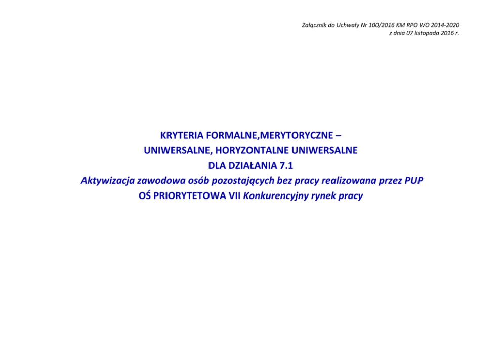 Załącznik do Uchwały Nr 100/2016 KM RPO WO 2014-2020 z dnia 07 listopada 2016 r. KRYTERIA FORMALNE,MERYTORYCZNE – UNIWERSALNE, HORYZONTALNE UNIWERSALNE DLA DZIAŁANIA 7.1 Aktywizacja zawodowa osób pozostających bez pracy realizowana przez PUP OŚ PRIORYTETOWA VII Konkurencyjny rynek pracy Załącznik do Uchwały Nr 100/2016 KM RPO WO 2014-2020 z dnia 07 listopada 2016 r. Kryteria formalne (TAK/NIE) LP Nazwa kryterium Źródło informacji Charakter kryterium W/B Definicja 1 2 3 4 5 1. Wnioskodawca uprawniony do składania wniosku. Wniosek o dofinansowanie Bezwzględny Rodzaj potencjalnych beneficjentów określony w "Szczegółowym Opisie Osi Priorytetowych RPO WO 2014-2020". 2. Typ projektu możliwy do realizacji w ramach działania. Wniosek o dofinansowanie Bezwzględny Typy dopuszczalnych projektów określone w "Szczegółowym Opisie Osi Priorytetowych RPO WO 2014-2020", piśmie wzywającym do złożenia wniosku projektowego. Wniosek o dofinansowanie Bezwzględny Zgodnie z ”Instrukcją wypełniania wniosku o dofinansowanie PUP, EFS” oraz obowiązującymi wytycznymi. Wniosek o dofinansowanie Bezwzględny Zgodnie z warunkami dla działania określonymi w "Szczegółowym Opisie Osi Priorytetowych RPO WO 2014-2020” . 3. 4. Wniosek wypełniony poprawnie, zgodnie z wymogami Instytucji Zarządzającej RPO WO 2014-2020. Wniosek spełnia warunki finansowe (m.in. wartość kwotowa, wysokość procentowa wnioskowanego dofinansowania; całkowita wartość projektu). 5. Wnioskodawca wybrał wszystkie wskaźniki horyzontalne. Wniosek o dofinansowanie Bezwzględny Wnioskodawca wybiera wszystkie wskaźniki horyzontalne. Dla wskaźników, których realizację zakłada w ramach projektu określa wartość docelową większą od zera. Dla pozostałych wpisuje zero. 6. Wnioskodawca określił wartość docelową większą od zera przynajmniej dla jednego wskaźnika w projekcie. Wniosek o dofinansowanie Bezwzględny Wnioskodawca określa wartość docelową większą od zera przynajmniej dla jednego wskaźnika w projekcie. Wnioskodawca nie podlega wykluczeniu z ubiegania się o dofinansowanie na podstawie: - art. 207 ust. 4 ustawy z dnia 27 sierpnia 2009 r. o finansach publicznych, - art. 12 ustawy z dnia 15 czerwca 2012 r. o skutkach powierzania wykonywania pracy cudzoziemcom przebywającym wbrew przepisom na terytorium Rzeczypospolitej Polskiej, - art. 9 ustawy z dnia 28 października 2002 r. o odpowiedzialności podmiotów zbiorowych za czyny zabronione pod groźbą kary. Wniosek o dofinansowanie Bezwzględny Kryterium weryfikowane na podstawie zapisów wniosku o dofinansowanie (oświadczenie), wypełnionego na podstawie instrukcji. Do dofinansowania nie może zostać wybrany projekt, który został usunięty z wykazu projektów zidentyfikowanych, stanowiącego załącznik do SZOOP. Wniosek o dofinansowanie Bezwzględny 7. 8. Zgodnie z Wytycznymi w zakresie trybów wyboru projektów na lata 2014-2020. Załącznik do Uchwały Nr 100/2016 KM RPO WO 2014-2020 z dnia 07 listopada 2016 r. Kryteria formalne (TAK/NIE) LP Nazwa kryterium Źródło informacji Charakter kryterium W/B Definicja 1 2 3 4 5 9. 10. Projekt nie został zakończony przed złożeniem formularza wniosku Wniosek o dofinansowanie Bezwzględny Na podstawie art. 65 Rozporządzenia Parlamentu Europejskiego i Rady nr 1303/2013 z 17 grudnia 2013 r. projekty nie zostaną wybrane do wsparcia z EFSI, jeśli zostały one fizycznie ukończone lub w pełni wdrożone przed złożeniem wniosku o dofinansowanie w ramach programu operacyjnego, niezależnie od tego, czy wszystkie powiązane z nim płatności zostały dokonane przez beneficjenta. Projekt wpisany na listę projektów w SZOOP Wniosek o dofinansowanie Bezwzględny Zgodnie ze "Szczegółowym Opisem Osi Priorytetowych RPO WO 2014-2020” . Załącznik do Uchwały Nr 100/2016 KM RPO WO 2014-2020 z dnia 07 listopada 2016 r. Kryteria merytoryczne – uniwersalne (TAK/NIE) LP Nazwa kryterium Źródło informacji Charakter kryterium W/B Definicja 1 2 3 4 5 Wniosek o dofinansowanie Bezwzględny Kryterium weryfikowane na podstawie zapisów wniosku o dofinansowanie, wypełnionego na podstawie instrukcji. 1. Zgodność projektu z właściwym celem szczegółowym RPO WO 2014-2020 w tym trafność doboru celu projektu. 2. Wybrane wskaźniki są adekwatne do określonego na poziomie projektu celu/ typu projektu/ grupy docelowej. Wniosek dofinansowanie Bezwzględny Sprawdza się, czy wybrane wskaźniki w sposób kompleksowy opisują zakres rzeczowy i charakter projektu, a także czy mierzą założone w nim cele/ grupy docelowe. 3. Założone wartości docelowe wskaźników większe od zera są realne do osiągnięcia Wniosek o dofinansowanie Bezwzględny Sprawdza się realność przyjętych do osiągnięcia wartości docelowych wskaźników w odniesieniu przede wszystkim do: wartości finansowej projektu, czasu i miejsca realizacji, kondycji finansowej wnioskodawcy oraz innych czynników istotnych dla realizacji przedsięwzięcia. 4. Adekwatność doboru grupy docelowej do projektu. Wniosek o dofinansowanie Bezwzględny Trafność doboru i opisu zadań przewidzianych do realizacji w ramach projektu. Wniosek o dofinansowanie Bezwzględny 5. Kryteria weryfikowane na podstawie zapisów wniosku o dofinansowanie, wypełnionego na podstawie instrukcji. Załącznik do Uchwały Nr 100/2016 KM RPO WO 2014-2020 z dnia 07 listopada 2016 r. 6. Prawidłowość sporządzenia budżetu projektu, w tym: - efektywność kosztowa m.in. w odniesieniu do kosztu przypadającego na jednego uczestnika projektu, - kwalifikowalność wydatków. Wniosek o dofinansowanie Bezwzględny KRYTERIA HORYZONTALNE UNIWERSALNE 1. Zgodność z prawodawstwem unijnym oraz właściwymi zasadami unijnymi w tym: - zasada równości kobiet i mężczyzn w oparciu o standard minimum, - zasada równości szans i niedyskryminacji w tym dostępności dla osób z niepełnosprawnościami. 2. Zgodność z prawodawstwem krajowym, w tym z przepisa