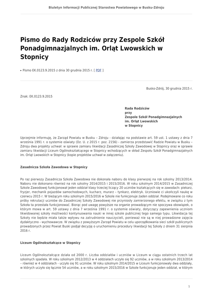 Biuletyn Informacji Publicznej Starostwa Powiatowego w Busku-Zdroju Pismo do Rady Rodziców przy Zespole Szkół Ponadgimnazjalnych im. Orląt Lwowskich w Stopnicy ● Pismo EK.0123.9.2015 z dnia 30 grudnia 2015 r. [ PDF ] Busko-Zdrój, 30 grudnia 2015 r. Znak: EK.0123.9.2015 Rada Rodziców przy Zespole Szkół Ponadgimnazjalnych im. Orląt Lwowskich w Stopnicy Uprzejmie informuję, że Zarząd Powiatu w Busku – Zdroju - działając na podstawie art. 59 ust. 1 ustawy z dnia 7 września 1991 r. o systemie oświaty (Dz. U. z 2015 r. poz. 2156) - zamierza przedstawić Radzie Powiatu w Busku – Zdroju dwa projekty uchwał: w sprawie zamiaru likwidacji Zasadniczej Szkoły Zawodowej w Stopnicy oraz w sprawie zamiaru likwidacji Liceum Ogólnokształcącego w Stopnicy wchodzących w skład Zespołu Szkół Ponadgimnazjalnych im. Orląt Lwowskich w Stopnicy (kopie projektów uchwał w załączeniu). Zasadnicza Szkoła Zawodowa w Stopnicy Po raz pierwszy Zasadnicza Szkoła Zawodowa nie dokonała naboru do klasy pierwszej na rok szkolny 2013/2014. Naboru nie dokonano również na rok szkolny 2014/2015 i 2015/2016. W roku szkolnym 2014/2015 w Zasadniczej Szkole Zawodowej funkcjonował jeden oddział klasy trzeciej liczący 20 uczniów kształcących się w zawodach: piekarz, fryzjer, mechanik pojazdów samochodowych, kucharz, murarz – tynkarz, elektryk. Uczniowie ci ukończyli naukę w czerwcu 2015 r. W bieżącym roku szkolnym 2015/2016 w Szkole nie funkcjonuje żaden oddział. Podejmowane co roku próby rekrutacji uczniów do Zasadniczej Szkoły Zawodowej nie przyniosły zamierzonego efektu, w związku z tym Szkoła ta przestała funkcjonować. Biorąc pod uwagę powyższe na organie prowadzącym nie spoczywa obowiązek, o którym mowa w art. 59 ustawy z dnia 7 września 1991 r. o systemie oświaty, dotyczący zapewnienia uczniom likwidowanej szkoły możliwości kontynuowania nauki w innej szkole publicznej tego samego typu. Likwidacja tej Szkoły nie będzie miała także wpływu na zatrudnienie nauczycieli, ponieważ nie są w niej prowadzone zajęcia dydaktyczno - wychowawcze. W związku z powyższym Zarząd Powiatu w celu uporządkowania sieci szkół publicznych prowadzonych przez Powiat Buski podjął decyzję o uruchomieniu procedury likwidacji tej Szkoły z dniem 31 sierpnia 2016 r. Liceum Ogólnokształcące w Stopnicy Liceum Ogólnokształcące działa od 2000 r. Liczba oddziałów i uczniów w Liceum w ciągu ostatnich trzech lat szkolnych spadała. W roku szkolnym 2012/2013 w 4 oddziałach uczyło się 92 uczniów, a w roku szkolnym 2013/2014 – również w 4 oddziałach - uczyło się 91 uczniów. W roku szkolnym 2014/2015 w Liceum funkcjonowały dwa oddziały, w których uczyło się łącznie 54 uczniów, a w roku szkolnym 2015/2016 w Szkole funkcjonuje jeden oddział, w którym 1 Biuletyn Informacji Publicznej Starostwa Powiatowego w Busku-Zdroju uczy się 24 uczniów. Uczniowie ci ukończą naukę w kwietniu 2016 r. Podejmowane przez dyrektora Liceum próby zwiększenia zainteresowania uczniów gimnazjów kształceniem w Liceum nie przyniosły zamierzonego efektu. Szkoła nie dokonała naboru do klasy pierwszej na rok szkolny 2014/2015 oraz 2015/2016, a wynika to m.in. z postępującego niżu demograficznego. Na przełomie roku 2014 i 2015 podjęto także próby przekazania prowadzenia Szkoły Miastu i Gminie Stopnica. Niestety wniosek ten nie został przez władze Gminy zaakceptowany. Brak woli przejęcia Szkoły przez władze Miasta i Gminy Stopnica oraz zanikające zainteresowanie uczniów kształceniem w Liceum Ogólnokształcącym w Stopnicy powoduje, że zamierza się zlikwidować szkołę z dniem 31 sierpnia 2016 r. Zatem likwidacja Szkoły nastąpi już po ukończeniu nauki przez uczniów uczęszczających do niej w roku szkolnym 2015/2016. 2
