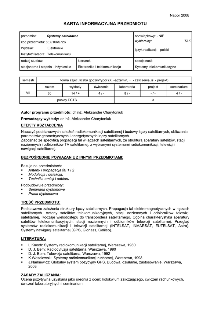 Nabór 2008 KARTA INFORMACYJNA PRZEDMIOTU kod przedmiotu: 5EG106S726 obowiązkowy: - NIE wybieralny: Wydział: język realizacji: polski przedmiot: Systemy satelitarne Elektroniki TAK Instytut/Katedra: Telekomunikacji rodzaj studiów: kierunek: specjalność: stacjonarne I stopnia - inżynieskie Elektronika i telekomunikacja Systemy telekomunikacyjne semestr forma zajęć, liczba godzin/rygor (X -egzamin, + - zaliczenia, # - projekt) razem wykłady ćwiczenia laboratoria projekt seminarium 30 14 / + 4/- 8/- -/- 4/- VII punkty ECTS 3 Autor programu przedmiotu: dr inż. Aleksander Charytoniuk Prowadzący wykłady: dr inż. Aleksander Charytoniuk EFEKTY KSZTAŁCENIA Nauczyć podstawowych założeń radiokomunikacji satelitarnej i budowy łączy satelitarnych, obliczania parametrów geometrycznych i energetycznych łączy satelitarnych. Zapoznać ze specyfiką propagacji fal w łączach satelitarnych, ze strukturą aparatury satelitów, stacji naziemnych i odbiorników TV satelitarnej, z wybranymi systemami radiokomunikacji, telewizji i nawigacji satelitarnej. BEZPOŚREDNIE POWIĄZANIE Z INNYMI PRZEDMIOTAMI: Bazuje na przedmiotach: Anteny i propagacja fal 1 i 2 Modulacja i detekcja, Technika emisji i odbioru Podbudowuje przedmioty: Seminaria dyplomowe Praca dyplomowa TREŚĆ PRZEDMIOTU: Podstawowe założenia struktury łączy satelitarnych. Propagacja fal elektromagnetycznych w łączach satelitarnych. Anteny satelitów telekomunikacyjnych, stacji naziemnych i odbiorników telewizji satelitarnej. Rodzaje wielodostępu do transpondera satelitarnego. Ogólna charakterystyka aparatury satelitów telekomunikacyjnych, stacji naziemnych i odbiorników telewizji satelitarnej. Przegląd systemów radiokomunikacji i telewizji satelitarnej (INTELSAT, INMARSAT, EUTELSAT, Astra). Systemy nawigacji satelitarnej (GPS, Glonass, Galileo). LITERATURA: L.Knoch: Systemy radiokomunikacji satelitarnej, Warszawa, 1980 D. J. Bem: Radiodyfuzja satelitarna, Warszawa, 1990 D. J. Bem: Telewizja satelitarna, Warszawa, 1992 K.Wesołowski: Systemy radiokomunikacji ruchomej, Warszawa, 1998 J.Narkiewicz: Globalny system pozycyjny GPS. Budowa, działanie, zastosowanie. Warszawa, 2003 ZASADY ZALICZANIA: Ocena pozytywna uzyskana jako średnia z ocen: kolokwium zaliczającego, ćwiczeń rachunkowych, ćwiczeń laboratoryjnych i seminarium.