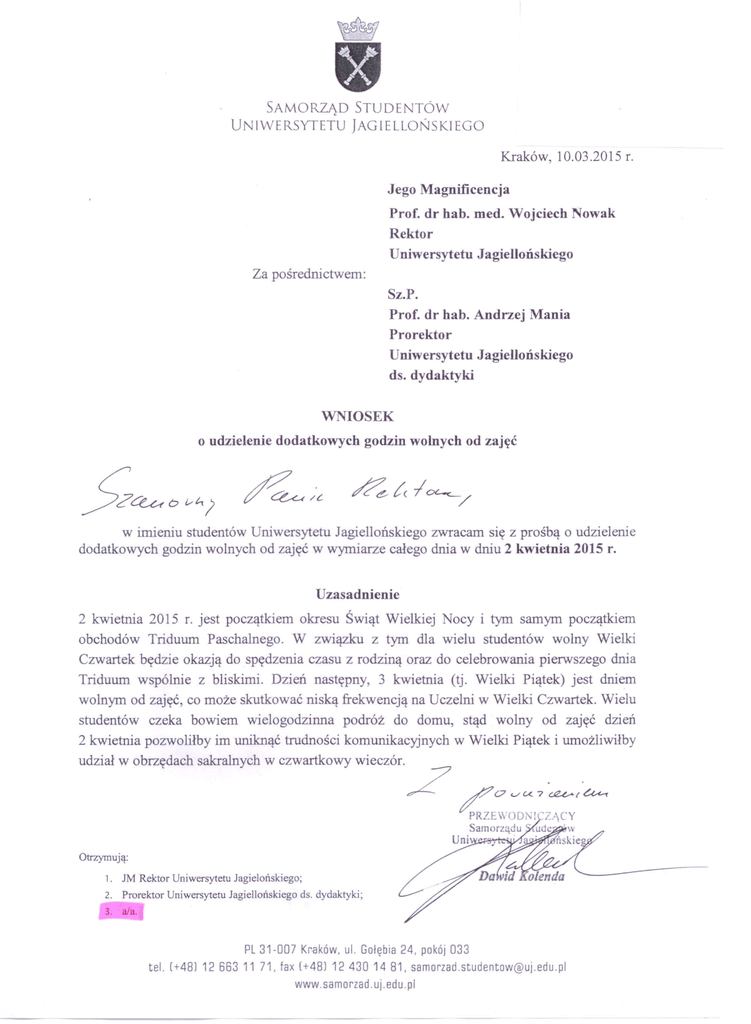 SAMORZĄD STUDENTÓW UNIWERSYTETU JAGIELLOŃSKIEGO Kraków, 10.03.2015 r. Jego Magnificencja Prof. dr hab. med. Wojciech owak Rektor Uniwersytetu Jagiellońskiego Za pośrednictwem: Sz.P. Prof. dr hab. Andrzej Mania Prorektor Uniwersytetu JagieIJońskiego ds. dydaktyki WNIOSEK o udzielenie dodatkowych godzin wolnych od zajęć w imieniu studentów Uniwersytetu Jagiellońskiego zwracam się z prośbą o udzielenie dodatkowych godzin wolnych od zajęć w wymiarze całego dnia w dniu 2 kwietnia 2015 r. Uzasadnienie 2 kwietnia 2015 r. jest początkiem okresu Świąt Wielkiej ocy i tym samym początkiem obchodów Triduum Paschalnego. W związku z tym dla wielu studentów wolny Wielki Czwartek będzie okazją do spędzenia czasu z rodziną oraz do celebrowania pierwszego dnia Triduum wspólnie z bliskimi. Dzień następny, 3 kwietnia (tj. Wielki Piątek) jest dniem wolnym od zajęć, co może skutkować niską frekwencją na Uczelni w Wielki Czwartek. Wielu studentów czeka bowiem wielogodzinna podróż do domu, stąd wolny od zajęć dzień 2 kwietnia pozwoliłby im uniknąć trudności komunikacyjnych w Wielki Piątek i umożliwiłby udział w obrzędach sakralnych w czwartkowy wieczór. 2 LOVU7~'U-<-. PRZEWOD,'! ~ZĄCY Samorządu ude . w Uni . ńskie Otrzymują: l. 1M Rektor Uniwersytetu Jagielońskiego; 2. Prorektor Uniwersytetu Jagiellońskiego ds. dydaktyki; 3. ala. PL 31-007 Kraków, ul. Gołębia 24, pokój 033 tel. (+48) 12 663 11 71, fax (+48) 12 430 14 81, samorzad [email protected] www.samorzad.uj.edu.pl