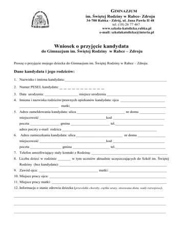GIMNAZJUM im. Świętej Rodziny w Rabce- Zdroju 34-700 Rabka - Zdrój, ul. Jana Pawła II 48 tel. (18) 26 77 467 www.szkola-katolicka.rabka.pl e-mail: [email protected] Wniosek o przyjęcie kandydata do Gimnazjum im. Świętej Rodziny w Rabce – Zdroju Proszę o przyjęcie mojego dziecka do Gimnazjum im. Świętej Rodziny w Rabce – Zdroju. Dane kandydata i jego rodziców: 1. Nazwisko i imiona kandydata: _______________________________________________________ 2. Numer PESEL kandydata: _ __________ 3. Data urodzenia: __________________ miejsce urodzenia ________________________________ 4. Imiona i nazwiska rodziców/prawnych opiekunów kandydata: ojca ________________________ _____________________ matki____________________________________________________ 5. Adres zameldowania kandydata: ulica __________________________ nr domu ______________ miejscowość ____________________________________kod ____________________________ poczta ________________ gmina _____________________ tel.__________________________ adres poczty e-mail rodzica ___________________________________________________ 6. Adres zamieszkania kandydata: ulica _________________________ nr domu _______________ miejscowość ____________________________________kod ____________________________ poczta _________________ gmina ____________________ tel.___________________________ 7. Telefon umożliwiający stały kontakt z Rodziną: _________________________________________ 8. Liczba dzieci w rodzinie _______ w tym uczniów aktualnie uczęszczających do Szkół im. Świętej Rodziny (bez kandydata): __________________________________________________________ 9. Zawód ojca: ________________________________ matki: _______________________________ 10. Miejsce pracy ojca: _______________________________________________________________ 11. Miejsce pracy matki: ______________________________________________________________ 12. Informacja o stanie zdrowia dziecka (przewlekłe choroby, ciężkie urazy, stosowana dieta, wady rozwojowe). _________________________________________________________________________________ __________________________________________________________________________________ __________________________________________________________________________________ Do wniosku dołączam następujące załączniki: Świadectwo ukończenia szkoły podstawowej Zaświadczenie o szczegółowych wynikach sprawdzianu w klasie VI Wykaz ocen z pierwszego półrocza klasy VI Opinia wychowawcy klasy i katechety Oświadczenie o wielodzietności (rodzina wychowująca troje lub więcej dzieci) rodziny kandydata Orzeczenie o potrzebie kształcenia specjalnego wydane ze względu na niepełnosprawność, orzeczenie o niepełnosprawności lub o stopniu niepełnosprawności lub orzeczenie równoważne w rozumieniu przepisów ustawy z dnia 27 sierpnia 1997 r. o rehabilitacji zawodowej i społecznej oraz zatrudnieniu osób niepełnosprawnych (Dz. U. z 2011 r. Nr 127, poz. 721, z późn. zm.) Prawomocny wyrok sądu rodzinnego orzekający rozwód lub separację lub akt zgonu oraz oświadczenie o samotnym wychowywaniu dziecka oraz niewychowywaniu żadnego dziecka wspólnie z jego rodzicem Dokument poświadczający objęcie dziecka pieczą zastępczą zgodnie z ustawą z dnia 9 czerwca 2011 r. o wspieraniu rodziny i systemie pieczy zastępczej (Dz. U. z 2013 r. poz. 135, ze zm.) Dwie podpisane na odwrocie fotografie - Oświadczam/-my, że dane przedstawione w niniejszym wniosku są zgodne ze stanem faktycznym i jestem świadomy/jesteśmy świadomi odpowiedzialności karnej za złożenie fałszywej informacji. - Wyrażam/-my zgodę na przetwarzanie danych osobowych mojego/naszego dziecka do celów rekrutacyjnych - zgodnie z Ustawą z dnia 29.08.1997 r. o Ochronie Danych Osobowych (Dz. U. Nr 133 poz. 883 ze zm.). ________________________ data i miejscowość ________________________________________________ podpisy obojga rodziców/prawnych opiekunów Przewodniczący Komisji Rekrutacyjnej może żądać dokumentów potwierdzających okoliczności – zawarte w oświadczeniach. Ankieta dla kandydata (wypełnia rodzic/prawny opiekun dziecka) …………………………………………… imię i nazwisko dziecka 1. Uczniowie Gimnazjum uczęszczają na zajęcia z dwóch języków obcych: języka angielskiego języka niemieckiego lub języka francuskiego (grupa j. francuskiego zostanie utworzona, jeżeli będzie co najmniej 10 osób chętnych). Proszę wskazać język obcy, którego Państwa dziecko chciałoby się uczyć w Gimnazjum (oprócz języka angielskiego): język niemiecki język francuski 2. Udział w zajęciach pozaszkolnych (zainteresowania pozaszkolne): __________________________ _________________________________________________________________________________ _________________________________________________________________________________ _________________________________________________________________________________ 3. Czy rodzice chcą zapisać dziecko do klasy matematyczno-przyrodniczej/językowej/ językowohumanistycznej? ___________________________________________________________________________________ 4. Udział w życiu religijnym Kościoła (ruchy religijne, grupy modlitewne, duszpasterskie, służba liturgiczna – rodziców i dziecka): _________________________________________________________________________________ _________________________________________________________________________________ _________________________________________________________________________________ _________________________________________________________________________________ 5. Jakie motywy przyświecały Państwu przy wyborze dla swojego dziecka naszego Gimnazjum? _________________________________________________________________________________ _________________________________________________________________________________ _________________________________________________________________________________ _____________________________________