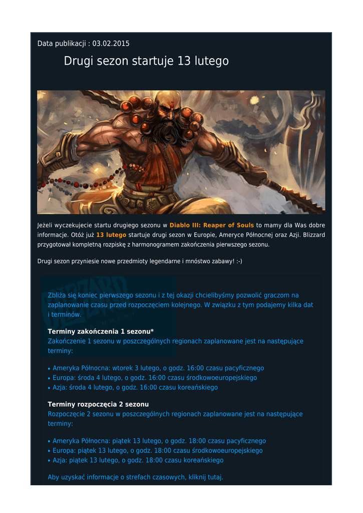 Data publikacji : 03.02.2015 Drugi sezon startuje 13 lutego Jeżeli wyczekujecie startu drugiego sezonu w Diablo III: Reaper of Souls to mamy dla Was dobre informacje. Otóż już 13 lutego startuje drugi sezon w Europie, Ameryce Północnej oraz Azji. Blizzard przygotował kompletną rozpiskę z harmonogramem zakończenia pierwszego sezonu. Drugi sezon przyniesie nowe przedmioty legendarne i mnóstwo zabawy! :-) Zbliża się koniec pierwszego sezonu i z tej okazji chcielibyśmy pozwolić graczom na zaplanowanie czasu przed rozpoczęciem kolejnego. W związku z tym podajemy kilka dat i terminów. Terminy zakończenia 1 sezonu* Zakończenie 1 sezonu w poszczególnych regionach zaplanowane jest na następujące terminy: ● ● ● Ameryka Północna: wtorek 3 lutego, o godz. 16:00 czasu pacyficznego Europa: środa 4 lutego, o godz. 16:00 czasu środkowoeuropejskiego Azja: środa 4 lutego, o godz. 16:00 czasu koreańskiego Terminy rozpoczęcia 2 sezonu Rozpoczęcie 2 sezonu w poszczególnych regionach zaplanowane jest na następujące terminy: ● ● ● Ameryka Północna: piątek 13 lutego, o godz. 18:00 czasu pacyficznego Europa: piątek 13 lutego, o godz. 18:00 czasu środkowoeuropejskiego Azja: piątek 13 lutego, o godz. 18:00 czasu koreańskiego Aby uzyskać informacje o strefach czasowych, kliknij tutaj. Do zobaczenia w 2 sezonie! *Uwaga: era I zakończy się w tym samym czasie co 1 sezon. Więcej informacji można uzyskać tutaj. Źródło: Battle.net Autor: BeLial Liczba wyświetleń strony: 3871 Data publikacji : 03.02.2015 Data modyfikacji : 03.02.2015 Tagi: sezony Komentarz (3) dodaj komentarz Dlaczego Blizzard nie wyda gry z rozmachem coś typu "Lost Ark" lub "Lineage Eternal" ? wydajac taka grę w każdym języku mają szanse na pobicie rekordów sprzedaży pod warunkiem że gra będzie nie gorsza niż załóżmy "Lost Ark" https://www.youtube.com/watch?v=dASL40bxoJQ#t=715 Blizz do dzieła ;D~MarcinYO 2015/02/11 18:46 S1 gralem crusem. Teraz nie wiem jak klase wybrac. Monk wyglada op. Kurcze, chyba wezme barba i przetestuje ten nowy set.~nabonid 2015/02/13 17:04 To smutne, ale albo mi się wydaje albo ta stronka jest martwa jak moja postać na HC... A w grze ruch jakiego nie było od dawna.~Zeniffar 2015/02/15 22:19 dodaj komentarz Pozostałe nowości DreamHack Open: Valencia 2016 - Nerchio w półfinale - live! DreamHack Valencia to jedno z największych e-sportowych wydarzeń w Europie - dlatego nie mogło zabraknąć na nim StarCrafta II! W czasie rozgrywek 96 graczy będzie konkurować o 50 000 USD oraz 5 000 punktów WCS.Data publikacji: 16.07.20161 Aktualizacja 3.4 – Duże zmiany w rankingu StarCrafta II Na oficjalnym blogu Blizzarda pojawił się nowy wpis dotyczący tym razem zmian w rankingach: Ranking StarCrafta II jest areną dla niezwykle zaciętej rywalizacji. Do walki rusza wielu uczestników, ale tylko nieliczni awansują do ścisłej czołówki.Data publikacji: 03.07.20160 Rozpoczęcie trzeciego sezonu rankingowego 2016 Trzeci sezon tegorocznych rozgrywek ligowych w StarCrafta II uważamy za otwarty! Zresetowano pulę punktów premiowych oraz rankingi i przyznano nagrody za sezon drugi roku 2016.Data publikacji: 26.06.20160 Filmowy „Warcraft” już wkrótce w księgarniach! Powieść „Warcraft”, której wydanie zbiega się z polską premierą filmu „Warcraft. Początek” w reżyserii Duncana Jonesa, do księgarń trafi już 15 czerwca. Na kartach książki czytelnicy wkroczą w nowy wymiar emocji towarzyszących bohaterom fikcyjnych światów Azeroth i Draenor. Za sprawą Christie Golden, pisarki od lat cenionej przez fanów świata Warcraft, konflikt ludzi i orków nabierze jeszcze większej intensywności.Data publikacji: 13.06.20160 Blokada obecnego sezonu i darmowa zmiana nazwy postaci Jak czytamy na oficjalnym blogu Blizzarda: Obecny sezon rankingowy zbliża się ku końcowi i wkrótce zamknięte zostaną wszystkie ligi i dywizje. Kilka dni przed rozpoczęciem nowego sezonu, darmowa zmiana nazwy postaci w StarCraft II zostanie ponownie dodana do wszystkich kont, dla których funkcja ta nie jest obecnie dostępna.Data publikacji: 12.06.20160 Wszystkie nowości