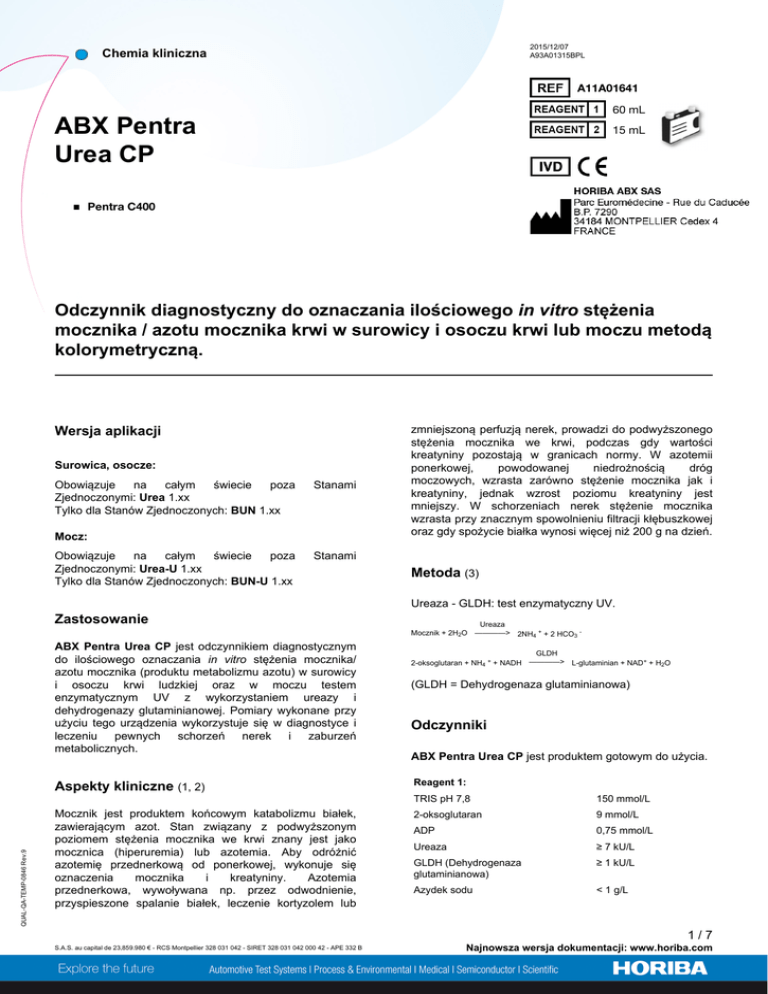 2015/12/07 A93A01315BPL Chemia kliniczna A11A01641 60 mL ABX Pentra Urea CP 15 mL ■ Pentra C400 Odczynnik diagnostyczny do oznaczania ilościowego in vitro stężenia mocznika / azotu mocznika krwi w surowicy i osoczu krwi lub moczu metodą kolorymetryczną. Wersja aplikacji Surowica, osocze: Obowiązuje na całym świecie poza Zjednoczonymi: Urea 1.xx Tylko dla Stanów Zjednoczonych: BUN 1.xx Stanami Mocz: Obowiązuje na całym świecie poza Zjednoczonymi: Urea-U 1.xx Tylko dla Stanów Zjednoczonych: BUN-U 1.xx zmniejszoną perfuzją nerek, prowadzi do podwyższonego stężenia mocznika we krwi, podczas gdy wartości kreatyniny pozostają w granicach normy. W azotemii ponerkowej, powodowanej niedrożnością dróg moczowych, wzrasta zarówno stężenie mocznika jak i kreatyniny, jednak wzrost poziomu kreatyniny jest mniejszy. W schorzeniach nerek stężenie mocznika wzrasta przy znacznym spowolnieniu filtracji kłębuszkowej oraz gdy spożycie białka wynosi więcej niż 200 g na dzień. Stanami Metoda (3) Ureaza - GLDH: test enzymatyczny UV. Zastosowanie ABX Pentra Urea CP jest odczynnikiem diagnostycznym do ilościowego oznaczania in vitro stężenia mocznika/ azotu mocznika (produktu metabolizmu azotu) w surowicy i osoczu krwi ludzkiej oraz w moczu testem enzymatycznym UV z wykorzystaniem ureazy i dehydrogenazy glutaminianowej. Pomiary wykonane przy użyciu tego urządzenia wykorzystuje się w diagnostyce i leczeniu pewnych schorzeń nerek i zaburzeń metabolicznych. QUAL-QA-TEMP-0846 Rev.9 Aspekty kliniczne (1, 2) Mocznik jest produktem końcowym katabolizmu białek, zawierającym azot. Stan związany z podwyższonym poziomem stężenia mocznika we krwi znany jest jako mocznica (hiperuremia) lub azotemia. Aby odróżnić azotemię przednerkową od ponerkowej, wykonuje się oznaczenia mocznika i kreatyniny. Azotemia przednerkowa, wywoływana np. przez odwodnienie, przyspieszone spalanie białek, leczenie kortyzolem lub Ureaza Mocznik + 2H2O ————> 2NH4 + + 2 HCO3 GLDH 2-oksoglutaran + NH4 + + NADH ————> L-glutaminian + NAD+ + H2O (GLDH = Dehydrogenaza glutaminianowa) Odczynniki ABX Pentra Urea CP jest produktem gotowym do użycia. Reagent 1: TRIS pH 7,8 150 mmol/L 2-oksoglutaran 9 mmol/L ADP 0,75 mmol/L Ureaza ≥ 7 kU/L GLDH (Dehydrogenaza glutaminianowa) ≥ 1 kU/L Azydek sodu < 1 g/L 1/7 S.A.S. au capital de 23,859.980 € - RCS Montpellier 328 031 042 - SIRET 328 031 042 000 42 - APE 332 B Najnowsza wersja dokumentacji: www.horiba.com Chemia kliniczna ABX Pentra Urea CP Reagent 2: NADH 1,3 mmol/L Azydek sodu < 1 g/L ABX Pentra Urea CP należy używać zgodnie z niniejszą ulotką. Producent nie może zagwarantować właściwego działania produktu, jeśli zostanie on użyty w sposób inny od podanego. Postępowanie z preparatem 1. Wyjmij obie zatyczki kasety. 2. Jeżeli odczynnik zawiera pianę, usuń ją za pomocą plastikowej pipety. 3. Umieść kasetę w chłodzonej komorze odczynnikowej analizatora Pentra C400. Kalibrator Wymagane wyposażenie niewchodzące w skład produktu ■ Zautomatyzowany kliniczny analizator biochemiczny: Pentra C400 ■ Kalibrator: ABX Pentra Multical, nr ref. A11A01652 ■ Kontrole: ABX Pentra N Control, nr ref. A11A01653, oraz ABX Pentra P Control, nr ref. A11A01654 ABX Pentra Urine Control L/H, nr ref. A11A01674 ■ Standardowy sprzęt laboratoryjny. Próbka ■ Surowica. ■ Osocze pobrane z heparyną litową. ■ Świeży mocz Firma HORIBA Medical nie prowadziła testów dla antykoagulantów innych niż wymienione na liście i w związku z tym nie zaleca ich używania dla potrzeb tego oznaczenia. Do celów kalibracji należy używać: ABX Pentra Multical, nr ref. A11A01652 (do oddzielnego zakupu) 10 x 3 mL (liofilizat) Stabilność surowicy/osocza (1): 2 dni w temperaturze pokojowej 1 tydzień w temperaturze 4-8°C Kontrola Stabilność w moczu (4): 4 tyg. w temperaturze -20°C, przy pH < 7,0 4 dni w temperaturze 4-8°C, jeżeli pH < 7,0 2 dni w temperaturze 20-25°C, jeżeli pH < 7,0 Do wewnętrznej kontroli jakości należy używać: ABX Pentra N Control, nr ref. A11A01653 (wymaga osobnego zakupu) 10 x 5 mL (liofilizat) ABX Pentra P Control, nr ref. A11A01654 (wymaga osobnego zakupu) 10 x 5 mL (liofilizat) ABX Pentra Urine Control L/H, nr ref. A11A01674 (wymaga osobnego zakupu) 1 x 10 mL + 1 x 10 mL Oznaczenie kontroli powinno być przeprowadzane raz dziennie i/lub po wykonaniu kalibracji. Częstość przeprowadzania kontroli oraz przedziały ufności powinny być ustalone w oparciu o wytyczne laboratoryjne oraz przepisy obowiązujące w danym kraju. Należy przestrzegać krajowych, regionalnych i lokalnych wytycznych dotyczących materiałów do kontroli jakości. Wynik kontroli musi zawierać się w zdefiniowanych przedziałach ufności. Każde laboratorium powinno wypracować sposób postępowania w przypadku, gdy wyniki wykroczą poza wyznaczone przedziały. Zakres norm Każde laboratorium powinno wypracować swoje własne zakresy odniesienia. Wartości podane w niniejszej ulotce mają wyłącznie charakter orientacyjny. Surowica, osocze (1): Mocznik BUN Dorośli: [mg/dL] [mmol/L] [mg/dL] Ogólnie 17 - 43 2,8 - 7,2 7,9 - 20,2 Kobiety < 50 lat 15 - 40 2,6 - 6,7 7,3 - 18,8 Kobiety > 50 lat 21 - 43 3,5 - 7,2 9,8 - 20,2 Mężczyźni < 50 lat 19 - 44 3,2 - 7,3 9,0 - 20,5 Mężczyźni > 50 lat 18 - 55 3,0 - 9,2 8,4 - 25,8 2/7 S.A.S. au capital de 23,859.980 € - RCS Montpellier 328 031 042 - SIRET 328 031 042 000 42 - APE 332 B Najnowsza wersja dokumentacji: www.horiba.com Chemia kliniczna ABX Pentra Urea CP Mocznik BUN Dzieci: [mg/dL] [mmol/L] [mg/dL] 1 - 3 lat: 11 - 36 1,8 - 6,0 5,1 - 16,8 4 - 13 lat: 15 - 36 2,5 - 6,0 7,0 - 16,8 14 - 19 lat: 18 - 45 2,9 - 7,5 8,1 - 21,1 Mocz (5): Mocz [mmol/24h] BUN [mg/24h] 430 - 710 1207 - 1993 Przechowywanie i stabilność Odczynniki, w nieotwieranych kasetach, zachowują stabilność do daty ważności podanej na etykiecie, o ile są przechowywane w temperaturze 2-8°C. Stabilność po ot