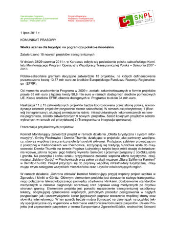 Operationelles Programm der grenzübergreifenden Zusammenarbeit Sachsen – Polen 2007-2013 Program Operacyjny Współpracy Transgranicznej Polska – Saksonia 2007-2013 1 lipca 2011 r. KOMUNIKAT PRASOWY Wielka szansa dla turystyki na pograniczu polsko-saksońskim Zatwierdzono 15 nowych projektów transgranicznych W dniach 28/29 czerwca 2011 r. w Karpaczu odbyło się posiedzenie polsko-saksońskiego Komitetu Monitorującego Program Operacyjny Współpracy Transgranicznej Polska – Saksonia 2007 2013. Polsko-saksońskie gremium decyzyjne zatwierdziło 15 projektów, na których dofinansowanie przeznaczono kwotę 13,87 mln euro ze środków Europejskiego Funduszu Rozwoju Regionalnego (EFRR). Od momentu uruchomienia Programu w 2009 r. zostało zakontraktowanych w formie projektów prawie 65 mln euro z łącznej kwoty 98,8 mln euro w ramach dostępnych środków pomocowych UE. Kwota środków EFRR obecnie dostępnych w Programie to około 34 mln euro. Realizacja 11 z 15 zatwierdzonych projektów będzie koordynowana przez stronę polską, a koordynacja czterech projektów przypadnie stronie saksońskiej. W ramach osi priorytetowej 1 (Rozwój transgraniczny), służącej zmniejszaniu różnic infrastrukturalnych i ekonomicznych na terenie pogranicza, zostało zatwierdzonych 9 nowych projektów. Sześć kolejnych projektów zostało wybranych w ramach osi priorytetowej 2 (Transgraniczna integracja społeczna). Prezentacja przykładowych projektów: Komitet Monitorujący zatwierdził projekt w ramach działania „Oferta turystyczna i system informacyjny“. Gminy Piechowice i Demitz-Thumitz, działające w projekcie jako partnerzy współpracy, stworzą wspólną transgraniczną ofertę turystyki aktywnej. Podążając szlakiem prowadzącym z położonej w Karkonoszach wsi Piechowice, szczycącej się tradycją hutnictwa szkła do miejscowości Demitz-Thumitz na terenie Pogórza Łużyckiego turyści będą mieli okazję doświadczenia wpływu, jaki na region i jego historię wywarło rzemiosło i przemysł związany z obróbką szkła i granitu. Na początku i końcu szlaku przygotowana zostanie wspólna oferta turystyczna, obejmująca „Szklany Ogród” w Piechowicach oraz pełne atrakcji muzeum „Stara Szlifiernia Kamieni” w Demitz-Thumitz. Projekt przyczyni się do poprawy wspólnej infrastruktury turystycznej, obejmując swym zasięgiem wszystkich mieszkańców oraz turystów odwiedzających region. W ramach działania „Ochrona zdrowia“ Komitet Monitorujący przyjął wspólny projekt szpitala w Zgorzelcu i kliniki w Görlitz. Głównym elementem projektu jest stworzenie stałego transgranicznego połączenia teleradiologicznego pomiędzy obydwoma klinikami, dostosowanie standardów medycznych w zakresie diagnostyki obrazowej oraz poprawa usług medycznych po obydwu stronach granicy. Elementem projektu jest ponadto rozszerzenie transgranicznej współpracy lekarzy, obejmującej opracowanie wspólnych, jednolitych procedur postępowania w nagłych przypadkach jak i przezwyciężenie barier językowych poprzez stworzenie wspólnej strony oraz słownika internetowego. W ten sposób będzie można tłumaczyć na dany język na przykład teksty specjalistyczne czy wypełnione w Internecie elektroniczne formularze pacjentów. Celem Projektu jest zapewnienie pacjentom z terenu Europamiasta Zgorzelec/Görlitz, wschodniej Saksonii Operationelles Programm der grenzübergreifenden Zusammenarbeit Sachsen – Polen 2007-2013 Program Operacyjny Współpracy Transgranicznej Polska – Saksonia 2007-2013 oraz zachodniej części województwa dolnośląskiego szybkiej pomocy medycznej na wysokim poziomie, w szczególności w dziedzinie traumatologii. Kolejnym zatwierdzonym przez Komitet projektem było przedsięwzięcie w ramach działania „Wspieranie transgranicznej dostępności dziedzictwa kulturowego”, umiejscowione również w Europamieście Zgorzelec/Görlitz. Jednym z głównych zadań projektu jest opracowanie i dyskusja na temat historii położonego na wschodnim brzegu Nysy Łużyckiej obozu jenieckiego StaLag VIIIa. Po otwarciu archiwów konieczne będzie wykonanie szerokich prac badawczych i dokumentacyjnych. Planowane miejsce pamięci oraz centrum dokumentacyjne zapewnią rodzinom ponad 120.000 byłych jeńców obozu oraz innym zwiedzającym odpowiednią informację ze szczególnym uwzględnieniem zasług francuskiego kompozytora Oliviera Messiaen (1908-1992). W czasie pobytu w StaLagu VIIIa Messiaen skomponował „Kwartet na koniec czasu”, którego prapremiera miała miejsce w 1941 roku w obecności ponad 500 jeńców obozu. Multimedialne centrum spotkań będzie stanowić w przyszłości platformę dla działalności muzycznej i multimedialnej kreatywności młodzieży, pedagogów, artystów i pracowników naukowych jak i dla towarzyszących tej działalności imprez. W ramach działania „Poprawa i rozwój infrastruktury turystycznej” Komitet Monitorujący zatwierdził wspólne przedsięwzięcie powiatów Żary i Görlitz oraz Gminy Zgorzelec pod tytułem „Przygoda z Nysą – zagospodarowanie turystyczne pogranicza polsko-niemieckiego”. W ramach projektu planuje się poprawę i rozszerzenie bazy dla turystyki kajakowej, rowerowej i pieszej. Działania obejmą stworzenie wspólnej, spójnej sieci szlaków rowerowych, pieszych, konnych i wodnych po obydwu stronach Nysy Łużyckiej. W ramach przedsięwzięcia przewidziano zarówno poprawę oznakowania i spójności istniejących szlaków jak i budowę nowych tras rowerowych i pieszych, zejść i wyjść dla kajakarzy wzdłuż Nysy, miejsc odpoczynku dla turystów oraz ustawienie tablic informacyjnych. Jednostką przyjmującą i opracowującą wnioski o dofinansowanie jest Saksoński Bank Odbudowy, Bank Wsparcia (SAB). Szczegółowe informacje na temat procedury składania wniosków i dane kontaktowe można znaleźć na stronie internetowej Programu Operacyjnego pod adresem www.sn-pl.eu. Zapytania dotyczące możliwo