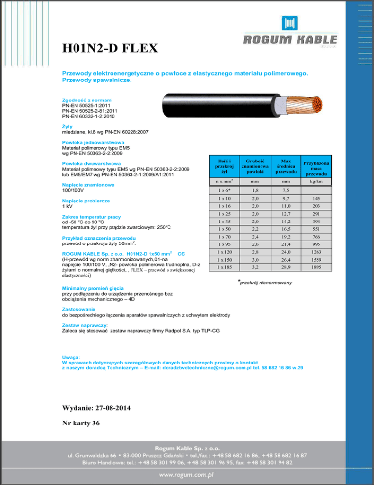H01N2-D FLEX Przewody elektroenergetyczne o powłoce z elastycznego materiału polimerowego. Przewody spawalnicze. Zgodność z normami PN-EN 50525-1:2011 PN-EN 50525-2-81:2011 PN-EN 60332-1-2:2010 Żyły miedziane, kl.6 wg PN-EN 60228:2007 Powłoka jednowarstwowa Materiał polimerowy typu EM5 wg PN-EN 50363-2-2:2009 Powłoka dwuwarstwowa Materiał polimeowy typu EM5 wg PN-EN 50363-2-2:2009 lub EM5/EM7 wg PN-EN 50363-2-1:2009/A1:2011 Napięcie znamionowe 100/100V Napięcie probiercze 1 kV Zakres temperatur pracy od -50 oC do 90 oC temperatura żył przy prądzie zwarciowym: 250oC Przykład oznaczenia przewodu przewód o przekroju żyły 50mm 2: 2 ROGUM KABLE Sp. z o.o. H01N2-D 1x50 mm CЄ (H-przewód wg norm zharmonizowanych,01-na napięcie 100/100 V, ,N2- powłoka polimerowa trudnoplna, D-z żyłami o normalnej giętkości, , FLEX – przewód o zwiększonej elastyczności) Ilość i przekroj żył Grubość znamionowa powłoki Max średnica przewodu Przybliżona masa przewodu n x mm2 mm mm kg/km 1 x 6* 1,8 7,5 1 x 10 2,0 9,7 145 1 x 16 2,0 11,0 203 1 x 25 2,0 12,7 291 1 x 35 2,0 14,2 394 1 x 50 2,2 16,5 551 1 x 70 2,4 19,2 766 1 x 95 2,6 21,4 995 1 x 120 2,8 24,0 1263 1 x 150 3,0 26,4 1559 1 x 185 3,2 28,9 1895 *przekrój nienormowany Minimalny promień gięcia przy podłączeniu do urządzenia przenośnego bez obciążenia mechanicznego – 4D Zastosowanie do bezpośredniego łączenia aparatów spawalniczych z uchwytem elektrody Zestaw naprawczy: Zaleca się stosować zestaw naprawczy firmy Radpol S.A. typ TLP-CG Uwaga: W sprawach dotyczących szczegółowych danych technicznych prosimy o kontakt z naszym doradcą Technicznym – E-mail: [email protected] tel. 58 682 16 86 w.29 Wydanie: 27-08-2014 Nr karty 36