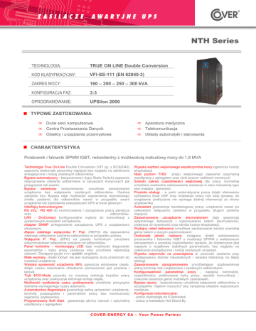 NTH Series TECHNOLOGIA: TRUE ON LINE Double Conversion KOD KLASYFIKACYJNY: VFI-SS-111 (EN 62040-3) ZAKRES MOCY: 160 – 200 – 250 – 300 kVA KONFIGURACJA FAZ: 3:3 OPROGRAMOWANIE: UPSilon 2000 TYPOWE ZASTOSOWANIA • • • Duże sieci komputerowe Centra Przetwarzania Danych Obiekty i urządzenia przemysłowe • • • Aparatura medyczna Telekomunikacja Układy automatyki i sterowania CHARAKTERYSTYKA Prostownik i falownik SPWM IGBT, redundantny z możliwością rozbudowy mocy do 1,8 MVA Technologia True On-Line Double Conversion (VFI zg. z IEC62040) zapewnia doskonałe parametry napięcia bez względu na zakłócenia energetyczne i rodzaj zasilanych odbiorników. Bypass automatyczny - bezprzerwowy (typu Static Switch) zapewnia nieprzerwane zasilanie odbiorników w sytuacjach krytycznych jak przegrzanie lub awaria. Bypass serwisowy bezprzerwowy umożliwia serwisowanie urządzenia bez wyłączania zasilanych odbiorników. Osobne zasilanie toru Bypass daje możliwość zapewnienia rezerwowego źródła zasilania dla odbiorników nawet w przypadku awarii urządzenia lub zadziałania zabezpieczeń UPS w torze głównym. Interfejsy komunikacyjne: RS 232, RS 485 do monitorowania i zarządzania pracą zasilacza oraz odbiorników, LAN - DryContact konfigurowalne wyjścia do komunikacji z systemowymi modułami zarządzania, Adapter SNMP zintegrowanie zarządzania UPS z urządzeniami sieciowymi, Złącze zdalnego wyłącznika P. Poż. (REPO) dla zapewnienia zdalnego odłączenia zasilania odbiorników w przypadku pożaru. Wyłącznik P. Poż. (EPO) na panelu kontrolnym umożliwia natychmiastowe odłączenie zasilania od odbiorników. Panel kontrolno - monitorujący LCD daje możliwość diagnostyki parametrów i trybu pracy zasilacza oraz umożliwia rejestrację zdarzeń. Dostępne języki m.in. polski, angielski. Małe wymiary, dzięki którym nie jest wymagana duża przestrzeń do instalacji urządzenia. Wysoka sprawność urządzenia 99% ogranicza emitowane ciepło, dzięki czemu ewentualne chłodzenie pomieszczeń jest prostsze i tańsze. Tryb ECO-Mode pozwala na znaczną redukcję kosztów pracy urządzenia oraz praktycznie eliminuje emisję ciepła. Możliwość wydłużenia czasu podtrzymania umożliwia precyzyjne dobranie wymaganego czasu autonomii. Automatyczna diagnostyka gwarantuje pełną sprawność urządzenia, kontrolę podzespołów i parametrów pracy bez konieczności ingerencji użytkownika. Programowany Soft Start gwarantuje płynny rozruch i optymalną współpracę z agregatem Wysoka wartość wejściowego współczynnika mocy ogranicza koszty eksploatacji Niski poziom THDi prądu wejściowego zapewnia optymalną współpracę z agregatem oraz niski poziom zakłóceń zwrotnych. Szeroki zakres częstotliwości wejściowej dla pracy normalnej umożliwia swobodne zastosowanie zasilacza w sieci mieszanej typu sieć miejska - generator. Prostota obsługi - w pełni automatyczna praca dzięki sterowaniu cyfrowemu Dual DSP oraz możliwość pracy non stop sprawia, że urządzenie praktycznie nie wymaga żadnej interwencji ze strony użytkownika. Autorestart gwarantuje bezobsługową pracę urządzenia nawet po całkowitym odłączeniu zasilania w przypadku długich zaników napięcia. Zaawansowane zarządzanie akumulatorami daje gwarancję optymalnego ładowania i wykorzystania baterii akumulatorów, zwiększa ich żywotność oraz obniża koszty eksploatacji. Wydajny układ ładowania umożliwia zastosowanie bardzo szerokiej gamy baterii o dużych pojemnościach. Doskonała jakość napięcia, osiągana dzięki zastosowaniu prostownika i falownika IGBT o modulacji SPWM z wektorowym sterowaniem o wysokiej częstotliwości sprawia, że dostarczane jest napięcie o wyjątkowo stabilnych parametrach, bez względu na zakłócenia energetyczne i rodzaj zasilanych urządzeń. Wysoka odporność na przeciążenia to pewność zasilania przy występowaniu stanów nieustalonych i wysoka tolerancja na błędy obsługi. Zaawansowane oprogramowanie umożliwiające użytkownikowi pełną kontrolę nad urządzeniem i zasilanymi odbiornikami. Konfigurowalność parametrów pracy - napięcia nominalne, częstotliwości, preferowane tryby pracy, sposób komunikacji znacznie poszerza gamę możliwych zastosowań. Bypass ręczny - bezprzerwowy umożliwia załączenie odbiorników o szczególnie "ciężkim rozruchu" bez narażania układów wyjściowych zasilacza. Konfiguracje redundancyjne: - praca równoległa do 6 jednostek - praca w kaskadzie Hot Stand By COVER-ENERGY SA – Your Pow er Partner NTH Series Model Moc Ilość faz WE : WY Wejście Napięcie zasilające Zakres napięcia Częstotliwość Zakres częstotliwości THDi Wyjście Napięcie nominalne Regulacja napięcia statyczna/dynamiczna Częstotliwość nominalna Odporność na przeciążenia NTH 160kVA 160 kVA / 128kW Cykl ładowania NT 300kVA 300 kVA / 240kW 380 / 400 / 415 VAC -20% ÷ +20 % 50/60 Hz ±10 % ≤3% 380 / 400 / 415 VAC ±1% / ±3% 50/60 ± 0,05 Hz 110% - 60 min., 130% - 10 min., 150% - 60 sek. (praca falownika) 150% - ciągłe., 200% -60 sekund. (praca Bypass) Sprawność w trybie On-Line przy 100% obc. Sprawność w trybie ECO (High Efficiency) Współczynnik szczytu Baterie Typ Czas ładowania NTH 200kVA NTH 250kVA 200 kVA / 160kW 250 kVA / 200kW 3:3 >95% 99% 3:1 Szczelne, kwasowo-ołowiowe, 12V 4 – 8 godzin do 90% pojemności (konfigurowalny) Wg DIN 41773 z automatycznym wyłącznikiem ładowania Wg kryterium prądu i napięcia ładowania z kontrolą czasu Wymiary i masa Wymiary UPS (SxWxG) [mm] 630 x 1450 x 1110 500 kg 780 x 1850 x 1260 Masa UPS bez baterii 730 kg 850 kg 870 kg Sygnalizacja i porty komunikacyjne Wskaźnik stanu pracy Wyświetlacz LCD, alarm dźwiękowy Komunikacja RS232, RS485, port Dry Contact, slot SNMP, MODBUS, REPO Warunki środowiskowe Poziom hałasu w zależności od 58 – 62 dB (A) 60 – 64 dB (A) trybu pracy Dopuszczalna temperatura pracy 0 °C ÷ 40 °C Zalecana temperatura pracy 15 °