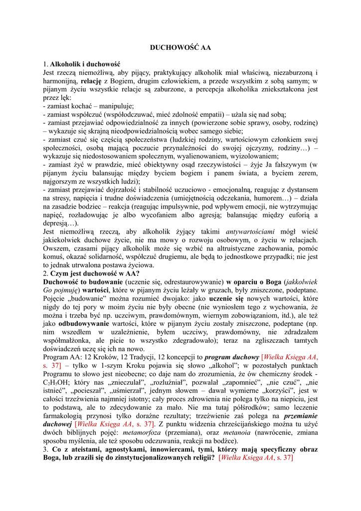 DUCHOWOŚĆ AA 1. Alkoholik i duchowość Jest rzeczą niemożliwą, aby pijący, praktykujący alkoholik miał właściwą, niezaburzoną i harmonijną, relację z Bogiem, drugim człowiekiem, a przede wszystkim z sobą samym; w pijanym życiu wszystkie relacje są zaburzone, a percepcja alkoholika zniekształcona jest przez lęk: - zamiast kochać – manipuluje; - zamiast współczuć (współodczuwać, mieć zdolność empatii) – użala się nad sobą; - zamiast przejawiać odpowiedzialność za innych (powierzone sobie sprawy, osoby, rodzinę) – wykazuje się skrajną nieodpowiedzialnością wobec samego siebie; - zamiast czuć się częścią społeczeństwa (ludzkiej rodziny, wartościowym członkiem swej społeczności, osobą mającą poczucie przynależności do swojej ojczyzny, rodziny…) – wykazuje się niedostosowaniem społecznym, wyalienowaniem, wyizolowaniem; - zamiast żyć w prawdzie, mieć obiektywny osąd rzeczywistości – żyje Ja fałszywym (w pijanym życiu balansując między byciem bogiem i panem świata, a byciem zerem, najgorszym ze wszystkich ludzi); - zamiast przejawiać dojrzałość i stabilność uczuciowo - emocjonalną, reagując z dystansem na stresy, napięcia i trudne doświadczenia (umiejętnością odczekania, humorem…) – działa na zasadzie bodziec – reakcja (reagując impulsywnie, pod wpływem emocji, nie wytrzymując napięć, rozładowując je albo wycofaniem albo agresją; balansując między euforią a depresją…). Jest niemożliwą rzeczą, aby alkoholik żyjący takimi antywartościami mógł wieść jakiekolwiek duchowe życie, nie ma mowy o rozwoju osobowym, o życiu w relacjach. Owszem, czasami pijący alkoholik może się wzbić na altruistyczne zachowania, pomóc komuś, okazać solidarność, współczuć drugiemu, ale będą to jednostkowe przypadki; nie jest to jednak utrwalona postawa życiowa. 2. Czym jest duchowość w AA? Duchowość to budowanie (uczenie się, odrestaurowywanie) w oparciu o Boga (jakkolwiek Go pojmuję) wartości, które w pijanym życiu leżały w gruzach, były zniszczone, podeptane. Pojęcie „budowanie” można rozumieć dwojako: jako uczenie się nowych wartości, które nigdy do tej pory w moim życiu nie były obecne (nie wyniosłem tego z wychowania, że można i trzeba być np. uczciwym, prawdomównym, wiernym zobowiązaniom, itd.), ale też jako odbudowywanie wartości, które w pijanym życiu zostały zniszczone, podeptane (np. nim wszedłem w uzależnienie, byłem uczciwy, prawdomówny, nie zdradzałem współmałżonka, ale picie to wszystko zdegradowało); teraz na zgliszczach tamtych doświadczeń uczę się ich na nowo. Program AA: 12 Kroków, 12 Tradycji, 12 koncepcji to program duchowy [Wielka Księga AA, s. 37] – tylko w 1-szym Kroku pojawia się słowo „alkohol”; w pozostałych punktach Programu to słowo jest nieobecne; co daje nam do zrozumienia, że ów chemiczny środek C2H5OH; który nas „znieczulał”, „rozluźniał”, pozwalał „zapomnieć”, „nie czuć”, „nie istnieć”, „pocieszał”, „uśmierzał”, jednym słowem – dawał wymierne „korzyści”, jest w całości trzeźwienia najmniej istotny; cały proces zdrowienia nie polega tylko na niepiciu, jest to podstawą, ale to zdecydowanie za mało. Nie ma tutaj półśrodków; samo leczenie farmakologią przynosi tylko doraźne rezultaty; trzeźwienie zaś polega na przemianie duchowej [Wielka Księga AA, s. 37]. Z punktu widzenia chrześcijańskiego można tu użyć dwóch biblijnych pojęć: metamorfoza (przemiana), oraz metanoia (nawrócenie, zmiana sposobu myślenia, ale też sposobu odczuwania, reakcji na bodźce). 3. Co z ateistami, agnostykami, innowiercami, tymi, którzy mają specyficzny obraz Boga, lub zrazili się do zinstytucjonalizowanych religii? [Wielka Księga AA, s. 37] Duchowość w przypadku AA nie jest tożsama z religijnością; nasz Program pokazuje, że podstawą jest duchowość, nie narzucając jak to ma się przejawiać w sferze religijności, zaangażowania w religijną społeczność, kult, liturgię. Jest to wynik kompromisu jaki zaszedł między alkoholikami wierzącymi w Boga i zadeklarowanymi religijnie, a niewierzącymi (ateistami czy agnostykami) i nie uznającymi przynależności do wspólnoty religijnej. Każdy z nas oprócz tych uniwersalnych wartości nosi w sobie obraz, fundamentalne pojęcie Boga [Wielka Księga AA, s. 46]. Są też tacy, którzy zakładają, że świat powstał ex nihilo, z niczego, i do tego nie trzeba angażować wcale Boga. Wielka Księga nazywa to absurdalną ideą. „Odrzućcie wszystkie uprzedzenia, nawet w odniesieniu do zorganizowanych religii” [Wielka Księga AA, s. 41]. Może dobrze, że masz te uprzedzenia, bo to pokazuje, że jesteś istotą myślącą, krytycznie podchodzącą do rzeczywistości i mającą swoją wrażliwość, ale na drodze trzeźwienia odłóż to na bok; hodowanie uprzedzeń nie przynosi dobrych rezultatów. Tradycja 2 mówi: „Jedynym i najwyższym autorytetem w naszej Wspólnocie jest miłujący Bóg, jakkolwiek może się On wyrażać w sumieniu każdej grupy. Nasi przewodnicy są tylko zaufanymi sługami, oni nami nie rządzą”. Tradycja ta przekazuje nam pozytywny obraz Boga, który jest po twojej stronie, sprzyja ci, Jego wolą jest, byś żył, trzeźwiał, zdrowiał, dojrzewał, rozwijał się w swym człowieczeństwie. Ten Bóg nie ma nic wspólnego ze śmiercią, On nie jest autorem twego cierpienia, uzależnienia, grzech nie ma przystępu do Niego. Ów fragment o Wspólnocie AA jest ewenementem na skalę światową; nie znam innej wspólnoty, społeczności, także religijnej, która nie ma ludzkich autorytetów, liderów, szefów, przywódców; oni mają być zaufanymi sługami; jeśli sumienie grupy stwierdzi, że któryś ze służebnych wynosi się chorą ambicją, pychą ma obowiązek na ten proceder reagować… 4. Świat wartości Jeśli rozumiemy duchowość jako budowanie