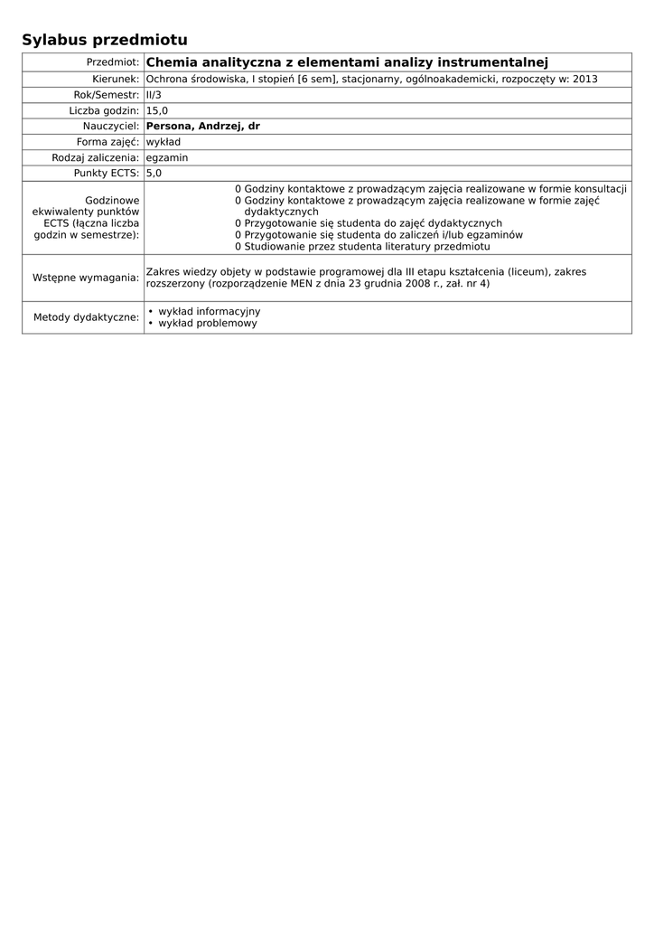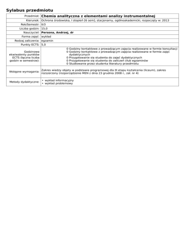 Sylabus przedmiotu Przedmiot: Chemia analityczna z elementami analizy instrumentalnej Kierunek: Ochrona środowiska, I stopień [6 sem], stacjonarny, ogólnoakademicki, rozpoczęty w: 2013 Rok/Semestr: II/3 Liczba godzin: 15,0 Nauczyciel: Persona, Andrzej, dr Forma zajęć: wykład Rodzaj zaliczenia: egzamin Punkty ECTS: 5,0 Godzinowe ekwiwalenty punktów ECTS (łączna liczba godzin w semestrze): 0 Godziny kontaktowe z prowadzącym zajęcia realizowane w formie konsultacji 0 Godziny kontaktowe z prowadzącym zajęcia realizowane w formie zajęć dydaktycznych 0 Przygotowanie się studenta do zajęć dydaktycznych 0 Przygotowanie się studenta do zaliczeń i/lub egzaminów 0 Studiowanie przez studenta literatury przedmiotu Wstępne wymagania: Zakres wiedzy objety w podstawie programowej dla III etapu kształcenia (liceum), zakres rozszerzony (rozporządzenie MEN z dnia 23 grudnia 2008 r., zał. nr 4) Metody dydaktyczne: • wykład informacyjny • wykład problemowy Tematy: 1. Cel i zadania chemii analitycznej. Podstawowe pojęcia dotyczące analityki.Proces analityczny.Podstawowe etapy procesu analitycznego. 2. Problem wiarygodności wyników analizy. Podstawy interpretacji wyników pomiarów. Niepewność pomiarowa. Podstawy statystycznej oceny danych eksperymentalnych. Metody eliminacji wyników I wątpliwych (testy).Precyzja i dokładność metod analitycznych. 3. Klasyfikacja metod klasycznej analizy ilościowej. Analiza wagowa. Podstawy teoretyczne analizywagowej słrąceniowej (iloczyn rozpuszczalności, rozpuszczalność, wpływ obcego i wspólnego jonu).Rodzaje osadów w analizie ilościowej. Rodzaj osadu a warunki wytrącania. Iloczyn Weimarna. Źródłazanieczyszczeń osadów (dobór cieczy przemywającej, straty przemywania). Obróbka termicznaosadów. Źródła błędów w analizie strąceniowej. Sposoby ich eliminacji i oszacowywania.Elektrograwimetria. 4. Analiza objętościowa - miareczkowa. Analiza miareczkowa jako przykład metody porównawczej.Pojęcie standardu pierwotnego i wtórnego. Roztwory mianowane. Wymagania dotyczące reakcji będącej zasadą pomiarową oznaczenia miareczkowego. Typy miareczkowań. Podział ze względu na technikęwykonania oznaczenia, sposób wyznaczania PK oraz typ reakcji będącej zasadą pomiarową. 5. Wskaźniki w metodach miareczkowych. Mechanizm działania wskaźników barwnych w zależności od rodzaju reakcji będącej zasadą pomiarową oznaczenia. Wskaźniki w metodach: alkacymetrycznych redoksymetrycznych, kompleksometrycznych i strąceniowych. 6. Instrumentalne metody wyznaczania PK. Zależność sygnału analitycznego od ilości dodawanegotitranta. Krzywe miareczkowania. Miareczkowanie potencjometryczne. Podstawy metody. Zestawypomiarowe. Rodzaje elektrod.Techniki rniareczkowania potencjometrycznego. Wyznaczanie PK (metody graficzne i rachunkowaHahna).Miareczkowanie konduktometryczne. Podstawy metody. Wyznaczanie PK miareczkowania. Miareczkowanie amperometryczne. Podstawy metody. Wyznaczanie PK Zakres tematów: miareczkowania.Miareczkowanie spektrofotometryczne. Podstawy metody. Wyznaczanie PK miareczkowania. 7. Wykorzystanie metod opartych o reakcję zobojętniania w analizie ilościowej (alkacymetria) Krzywe miareczkowania alkacymetrycznego. Dobór wskaźnika barwnego na podstawie krzywej miareczkowania(skok miareczkowania a zakres zmiany barwy wskaźnika). Oznaczenia z użyciem dwubarwnychwskaźników. Oznaczanie składu mieszanin związków alkacymetrycznie czynnych. Oznaczaniealkacymetrycznych parametrów kolektywnych próbki wody (kwasowość i zasadowość wody). 8. Odczynniki kompleksujące wykorzystywane w analizie chemicznej( maskowanie, oznaczenia ilościowe).Kompleksometria. Chelatujące odczynniki kompleksujące. Obliczanie wyników analizy na podstawiewyników miareczkowania kompleksometrycznego; miareczkowanie bezpośrednie, odwrotne i pośrednie.Twardość wody. 9. Miareczkowa analiza strąceniowa. Miareczkowe metody bezpośrednie i pośrednie. Metody Mohra, Volharda i Fajansa (porównanie metod ze względu na zakres zastosowań, sposób detekcji PK, iuzyskiwane wyniki). Obliczanie składu analizowanej próbki na podstawie wyników miareczkowaniastrąceniowego. 10. Redoksymetria. Przewidywanie kierunku przebi Bilansowanie reakcji redoks. Obliczenia w oparciu oschemat przebiegu wieloetapowego procesu i redoks. Reakcje konkurencyjne.Wpływ środowiska naprzebieg reakcji redoks (aspekt analityczny). 11. Krzywa miareczkowania redoks. Dobór wskaźników. Wskaźniki specyficzne i niespecyficzne redoks.Przykłady zastosowań miareczkowych metod redoksymetrycznych w analityce: manganonietria, chromianometria, bromianometria.Obliczanie składu próbki analizowanej na podstawie wynikówmiareczkowania redoksymetrycznego: bezpośredniego, pośredniego i odwrotnego. Chemicznezapotrzebowanie tlenu(ChZT,utlenialność, NZT). Biologiczne zapotrzebowanie tlenu (BZT). 12. Metody optyczne. Nefelometria. Turbidymetria.Spektrofotometria cząsteczkowa. Prawa absorpcji. Metody oznaczeń spektrofotometrycznych. Obliczanie wyników analizy. 13. Standaryzacja oznaczeń w analizie ilościowej. Normy analityczne. Forma oceniania: • egzamin pisemny 1. A. Persona, T. Gęca, A. Kusak, B. Marczewska – Chemia analityczna. Podstawy klasycznej analizy ilościowej, Medyk, Warszawa 2007 2. A. Persona,J. Reszko-Zygmunt,T. Gęca,Zbiór zadań z chemii ogólnej i analitycznej z pełnymi rozwiązaniami, Medyk, Warszawa 2011 3. L.F. Hamilton, S.G. Simpson, D.W. Ellis, Obliczenia w chemii analitycznej, WNT, Warszawa, Literatura: 1973 4. Cygański, B. Ptaszyński, J. Krystek – Obliczenia w chemii analitycznej, PWN, Warszawa 2000 5. J. Minczewski, J. Marczenko, Chemia analityczna, PWN, 1965 i wydania późniejsze 6. Z. Cygański, Chemiczne metody analizy ilościowej, WNT, 1986. 7. D.A.Skoog, D.M.West, F.J.Holler, S.R.Crouch, Podstawy chemii analitycznej, PWN SA, Warszawa 2006 8. D.Kealey, P.J. Haines, Krótkie wykłady – Chemia analityczna, PWN S