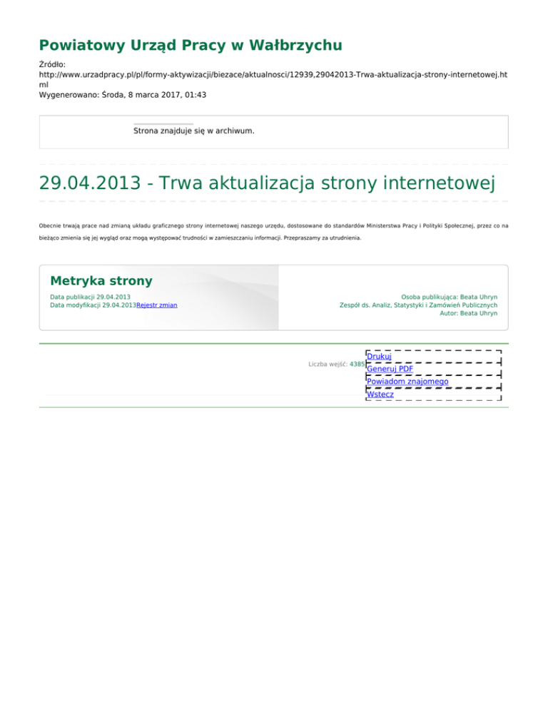 Powiatowy Urząd Pracy w Wałbrzychu Źródło: http://www.urzadpracy.pl/pl/formy-aktywizacji/biezace/aktualnosci/12939,29042013-Trwa-aktualizacja-strony-internetowej.ht ml Wygenerowano: Środa, 8 marca 2017, 01:43 Strona znajduje się w archiwum. 29.04.2013 - Trwa aktualizacja strony internetowej Obecnie trwają prace nad zmianą układu graficznego strony internetowej naszego urzędu, dostosowane do standardów Ministerstwa Pracy i Polityki Społecznej, przez co na bieżąco zmienia się jej wygląd oraz mogą występować trudności w zamieszczaniu informacji. Przepraszamy za utrudnienia. Metryka strony Data publikacji 29.04.2013 Data modyfikacji 29.04.2013Rejestr zmian Osoba publikująca: Beata Uhryn Zespół ds. Analiz, Statystyki i Zamówień Publicznych Autor: Beata Uhryn Liczba wejść: 4385 Drukuj Generuj PDF Powiadom znajomego Wstecz