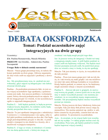 „JESTEM” STOWARZYSZENIE POMOCY DZIECIOM NIEPEŁNOSPRAWNYM I O SOBOM POTRZEBUJĄCYM WSPARCIA Październik Numer 7/AMD Temat: Podział uczestników zajęć integracyjnych na dwie grupy Uczestnicy: zwalniać i nie będą mogli przyjść tego dnia. ZA: Paulina Romanowska, Maryla Milarska Iza- Ja jeszcze wrócę do integracji. Chodzi też tutaj o integrację między nami. A jeśli będzie podział, to części osób nie będziemy widywać. Nie będzie możliwości poznania nowych osób, bo jeżeli ktoś przyjdzie we wtorek a inny w środę, to się nie spotkają. PRZECIW: Iza Grześko, Adamowska, Paulina Szczepaniak Uwaga: Role w debacie zostały narzucone! Maryla - Nasza grupa prezentuje tezę, że należy dokonać podziału na dwie grupy. Główne argumenty do zbyt wiele osób na zajęciach i problemy z dowozem. Maryla- Tak jest niestety w życiu, że wszystkich nie da rady poznać. Iza - My przedstawiamy tezę, że podział nie jest wskazany, gdyż zajęcia są integracyjne i nie należy stwarzać dwóch grup Paulina – Poza tym nasza grupa jest i tak na tyle duża, że i tak tworzą się małe grupki i nie ma możliwości mieć tak samo dobrego kontaktu ze wszystkimi. Kiedy będzie podział, to zmieni się to, bo będziemy mogli zacieśnić relacje z innymi uczestnikami. Paulina – Za podziałem przemawia fakt, że jest coraz więcej uczestników tego spotkania, a pomieszczenie jest małe. Jest jeszcze problem z wolontariuszami, którzy dowożą podopiecznych na zajęcia. Jeśli nie mogą przyjść we wtorek, to nie uczestniczą w ogóle w zajęciach integracyjnych. Paulina S.- Zawsze tak jest w grupach, że zazwyczaj tworzą się grupki, a nawet jeżeli nie to nie jesteśmy w stanie wszystkich poznać i nie możemy powiedzieć, że ze wszystkimi mamy stuprocentowy kontakt. Ale przynajmniej będzie można wszystkich poznać po imieniu. Paulina S. - Jeśli będzie podział, to będą na pewno większe koszty dojazdów, bo niektóre osoby będą chciały przyjechać dwa razy z rzędu. Maryla- Wrócę jeszcze do bazy lokalowej, która jest szczupła. Gdy jest duży tłok pewne rzeczy stają się niemożliwe. Nie można umieścić np. stołów w sali, Maryla- To jest spotkanie integracyjne z młodzieżą z które czasem by się przydały, czasem ktoś nie ma Czerniewic i z wolontariuszami i nie sądzę, żeby to gdzie siedzieć. To przemawia za podziałem. był jakiś problem rozdzielenia na dwa dni. Oni będą Asia – Ja uważam, że im więcej ludzi tym weselej, mogli prawdopodobnie przyjść w oba dni. A jeżeli tak mi się wydaje. I w takiej grupie można czuć się chodzi o transport to nie chodzi tu o koszty, ale o swobodniej. Poza tym, jak będzie podział to trzeba możliwość wynajęcia transportu. będzie kupować więcej ciastek;] Paulina S.- Z tego co wiem, to młodzież z Czerniewic ma dużą społeczność, z której nie mogą się str. 1 Podsumowanie Argumenty „ZA” - sala jest zbyt mała, co utrudnia prowadzenie zajęć i komfort uczestniczenia - są problemy z dojazdem i wynajmowaniem samochodów - w tak dużej grupie ciężko nawiązać ścisłe relacje - jeśli ktoś nie może chodzić we wtorek (np. część wolontariuszy), to nie ma możliwości uczestniczenia w zajęciach integracyjnych Argumenty „PRZECIW” - podział przeszkadza integracji, nie będzie możliwości poznania wszystkich osób - młodzież z Czerniewic nie może przychodzić w środę - wzrosłyby koszty dojazdów na zajęcia - trzeba będzie kupować więcej ciastek - im więcej osób na zajęciach tym weselsza atmosfera Przygotowanie do dyskusji Fot.: Archiwum Stowarzyszenia „Jestem” Debata w toku Fot.: Archiwum Stowarzyszenia „Jestem” Grupa oponentów Fot.: Archiwum Stowarzyszenia „Jestem” Str. 2