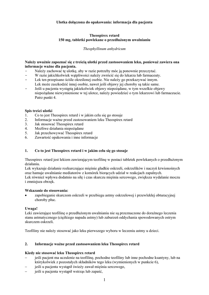 Ulotka dołączona do opakowania: informacja dla pacjenta Theospirex retard 150 mg, tabletki powlekane o przedłużonym uwalnianiu Theophyllinum anhydricum Należy uważnie zapoznać się z treścią ulotki przed zastosowaniem leku, ponieważ zawiera ona informacje ważne dla pacjenta. Należy zachować tę ulotkę, aby w razie potrzeby móc ją ponownie przeczytać. W razie jakichkolwiek wątpliwości należy zwrócić się do lekarza lub farmaceuty. Lek ten przepisano ściśle określonej osobie. Nie należy go przekazywać innym. Lek może zaszkodzić innej osobie, nawet jeśli objawy jej choroby są takie same. Jeśli u pacjenta wystąpią jakiekolwiek objawy niepożądane, w tym wszelkie objawy niepożądane niewymienione w tej ulotce, należy powiedzieć o tym lekarzowi lub farmaceucie. Patrz punkt 4. Spis treści ulotki 1. Co to jest Theospirex retard i w jakim celu się go stosuje 2. Informacje ważne przed zastosowaniem leku Theospirex retard 3. Jak stosować Theospirex retard 4. Możliwe działania niepożądane 5. Jak przechowywać Theospirex retard 6. Zawartość opakowania i inne informacje 1. Co to jest Theospirex retard i w jakim celu się go stosuje Theospirex retard jest lekiem zawierającym teofilinę w postaci tabletek powlekanych o przedłużonym działaniu. Lek wykazuje działanie rozkurczające mięśnie gładkie oskrzeli, oskrzelików i naczyń krwionośnych oraz hamuje uwalnianie mediatorów z komórek biorących udział w reakcjach zapalnych. Lek również wpływa dodatnio na siłę i czas skurczu mięśnia sercowego, zwiększa wydalanie moczu i zmniejsza obrzęk. Wskazanie do stosowania: zapobieganie skurczom oskrzeli w przebiegu astmy oskrzelowej i przewlekłej obturacyjnej choroby płuc. Uwaga! Leki zawierające teofilinę o przedłużonym uwalnianiu nie są przeznaczone do doraźnego leczenia stanu astmatycznego (ciężkiego napadu astmy) lub zaburzeń oddychania spowodowanych ostrym skurczem oskrzeli. Teofiliny nie należy stosować jako leku pierwszego wyboru w leczeniu astmy u dzieci. 2. Informacje ważne przed zastosowaniem leku Theospirex retard Kiedy nie stosować leku Theospirex retard jeśli pacjent ma uczulenie na teofilinę, pochodne teofiliny lub inne pochodne ksantyny, lub na którykolwiek z pozostałych składników tego leku (wymienionych w punkcie 6), jeśli u pacjenta wystąpił świeży zawał mięśnia sercowego, jeśli u pacjenta wystąpił wstrząs lub zapaść, 1 jeśli u pacjenta stwierdzono ostre zaburzenia rytmu serca, jeśli u pacjenta występuje ciężka choroba wątroby, jeśli u pacjenta stwierdzono obrzęk płuc, jeśli u pacjenta stwierdzono skłonność do drgawek, jeśli u pacjenta stwierdzono padaczkę, jeśli dziecko ma mniej niż 6 lat. Ostrzeżenia i środki ostrożności Przed rozpoczęciem stosowania leku Theospirex retard należy omówić to z lekarzem: jeśli u pacjenta występuje nadciśnienie tętnicze, jeśli u pacjenta występuje niestabilna dławica piersiowa, w przypadku ryzyka wystąpienia zaburzeń rytmu serca (w tym także zaburzeń rytmu serca z szybką czynnością serca), jeśli u pacjenta występuje przerostowa kardiomiopatia ze zwężeniem drogi odpływu (choroba mięśnia sercowego), jeśli u pacjenta występuje nadczynność tarczycy, jeśli u pacjenta występuje choroba wrzodowa żołądka i (lub) dwunastnicy, jeśli u pacjenta występują zaburzenia czynności nerek i (lub) wątroby, jeśli u pacjenta występuje porfiria, jeśli u pacjenta występuje niewydolność serca, jeśli u pacjenta występuje serce płucne, jeśli u pacjenta występuje jaskra, jeśli u pacjenta występuje cukrzyca, jeśli u pacjenta występuje długo utrzymująca się gorączka, jeśli u pacjenta występują zakażenia wirusowe, jeśli pacjent jednocześnie stosuje leki spowalniające metabolizm teofiliny (w tym także w okresie bezpośrednio po ich odstawieniu). Lek należy stosować ostrożnie w okresie szczepień oraz u osób w podeszłym wieku. Leku nie należy stosować w ostrym napadzie astmy oskrzelowej i stanach astmatycznych. Gorączka zmniejsza szybkość wydalania teofiliny z organizmu. W przypadku ostrej choroby przebiegającej z gorączką konieczne może być zmniejszenie dawki w celu uniknięcia zatrucia. Dzieci i młodzież Leku Theospirex retard nie należy stosować u dzieci w wieku poniżej 6 lat. Dostępne są inne postaci farmaceutyczne leku, które są bardziej odpowiednie dla dzieci w wieku poniżej 6 lat. Szczegółowe informacje dotyczące stosowania tego leku u dzieci i młodzieży przedstawione są w punkcie 3. „Jak stosować Theospirex retard”. Theospirex retard a inne leki Należy powiedzieć lekarzowi lub farmaceucie o wszystkich lekach stosowanych przez pacjenta obecnie lub ostatnio, a także o lekach, które pacjent planuje stosować. W szczególności należy poinformować o stosowaniu któregokolwiek z poniższych leków, gdyż Theospirex retard może zmieniać ich działanie oraz zwiększać ryzyko wystąpienia działań niepożądanych: Leku Theospirex retard nie należy stosować jednocześnie z innymi preparatami zawierającymi ksantyny i ich pochodne. Efedryna. Teofilina nasila działanie efedryny. Teofilina nasila działanie sympatykomimetyków (takich jak salbutamol, formoterol) stosowanych w leczeniu stanów skurczowych oskrzeli, kofeiny i podobnych substancji. Teofilina zwiększa wydalanie nerkowe soli litu (stosowanych w leczeniu manii lub depresji), zmniejsza jego wchłanianie i stężenie we krwi. 2 Glikozydy naparstnicy (leki pobudzające pracę serca). Poprzez dodatni wpływ na siłę i czas skurczu mięśnia sercowego teofilina może nasilać działanie glikozydów naparstnicy i prowadzić do zaburzeń przewodnictwa w mięśniu sercowym. Teofilina może osłabić działanie leków β-adrenolitycznych (leki stosowane m.in. w leczeniu nadciśnienia tętniczego), adenozyny (lek stosowany w zaburzeniach rytmu serca), benzodiazepin (leki o działaniu przeciwlękowym, uspokajający