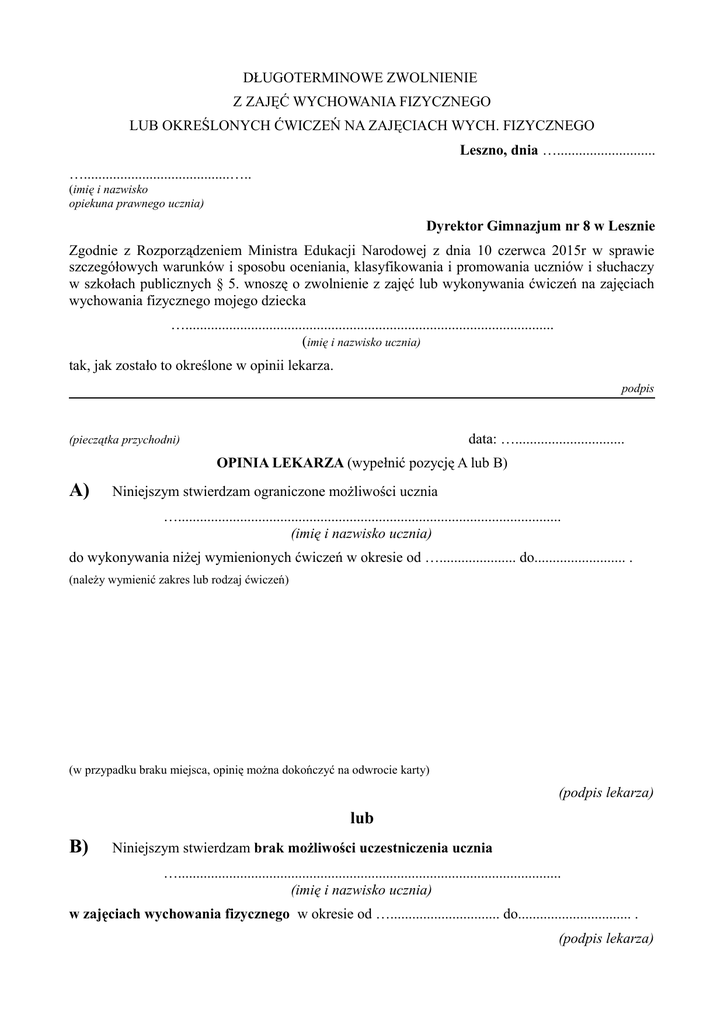 DŁUGOTERMINOWE ZWOLNIENIE Z ZAJĘĆ WYCHOWANIA FIZYCZNEGO LUB OKREŚLONYCH ĆWICZEŃ NA ZAJĘCIACH WYCH. FIZYCZNEGO Leszno, dnia …........................... …........................................….. (imię i nazwisko opiekuna prawnego ucznia) Dyrektor Gimnazjum nr 8 w Lesznie Zgodnie z Rozporządzeniem Ministra Edukacji Narodowej z dnia 10 czerwca 2015r w sprawie szczegółowych warunków i sposobu oceniania, klasyfikowania i promowania uczniów i słuchaczy w szkołach publicznych § 5. wnoszę o zwolnienie z zajęć lub wykonywania ćwiczeń na zajęciach wychowania fizycznego mojego dziecka …..................................................................................................... (imię i nazwisko ucznia) tak, jak zostało to określone w opinii lekarza. podpis data: ….............................. (pieczątka przychodni) OPINIA LEKARZA (wypełnić pozycję A lub B) A) Niniejszym stwierdzam ograniczone możliwości ucznia …......................................................................................................... (imię i nazwisko ucznia) do wykonywania niżej wymienionych ćwiczeń w okresie od …..................... do......................... . (należy wymienić zakres lub rodzaj ćwiczeń) (w przypadku braku miejsca, opinię można dokończyć na odwrocie karty) (podpis lekarza) lub B) Niniejszym stwierdzam brak możliwości uczestniczenia ucznia …......................................................................................................... (imię i nazwisko ucznia) w zajęciach wychowania fizycznego w okresie od ….............................. do............................... . (podpis lekarza)
