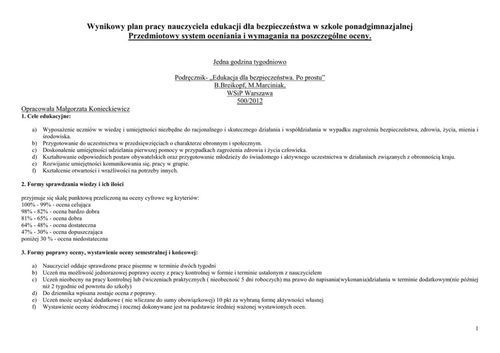 Wynikowy plan pracy nauczyciela edukacji dla bezpieczeństwa w szkole ponadgimnazjalnej Przedmiotowy system oceniania i wymagania na poszczególne oceny. Jedna godzina tygodniowo Podręcznik- „Edukacja dla bezpieczeństwa. Po prostu” B.Breikopf, M.Marciniak, WSiP Warszawa 500/2012 Opracowała Małgorzata Konieckiewicz 1. Cele edukacyjne: Wyposażenie uczniów w wiedzę i umiejętności niezbędne do racjonalnego i skutecznego działania i współdziałania w wypadku zagrożenia bezpieczeństwa, zdrowia, życia, mienia i środowiska. b) Przygotowanie do uczestnictwa w przedsięwzięciach o charakterze obronnym i społecznym. c) Doskonalenie umiejętności udzielania pierwszej pomocy w przypadkach zagrożenia zdrowia i życia człowieka. d) Kształtowanie odpowiednich postaw obywatelskich oraz przygotowanie młodzieży do świadomego i aktywnego uczestnictwa w działaniach związanych z obronnością kraju. e) Rozwijanie umiejętności komunikowania się, pracy w grupie. f) Kształcenie otwartości i wrażliwości na potrzeby innych. a) 2. Formy sprawdzania wiedzy i ich ilości przyjmuje się skalę punktową przeliczoną na oceny cyfrowe wg kryteriów: 100% - 99% - ocena celująca 98% - 82% - ocena bardzo dobra 81% - 65% - ocena dobra 64% - 48% - ocena dostateczna 47% - 30% - ocena dopuszczająca poniżej 30 % - ocena niedostateczna 3. Formy poprawy oceny, wystawienie oceny semestralnej i końcowej: a) Nauczyciel oddaje sprawdzone prace pisemne w terminie dwóch tygodni b) Uczeń ma możliwość jednorazowej poprawy oceny z pracy kontrolnej w formie i terminie ustalonym z nauczycielem c) Uczeń nieobecny na pracy kontrolnej lub ćwiczeniach praktycznych ( nieobecność 5 dni roboczych) ma prawo do napisania(wykonania)działania w terminie dodatkowym(nie później niż 2 tygodnie od powrotu do szkoły) d) Do dziennika wpisana zostaje ocena z poprawy. e) Uczeń może uzyskać dodatkowe ( nie wliczane do sumy obowiązkowej) 10 pkt za wybraną formę aktywności własnej f) Wystawienie oceny śródrocznej i rocznej dokonywane jest na podstawie średniej ważonej wystawionych ocen. 1 4. Sposoby informowania uczniów Na pierwszej godzinie lekcyjnej uczniowie są zapoznawani z Przedmiotowym Systemem Oceniania. Wymagania na poszczególne oceny są udostępniane wszystkim uczniom. Wszystkie oceny oparte o opracowane kryteria są jawne zarówno dla ucznia jak i jego rodziców. Sprawdziany są oddawane rodzicom za pośrednictwem ucznia. Moduł I Pierwsza pomoc w nagłych wypadkach Cel ogólny: przygotowanie do działania ratowniczego – uczeń zna zasady prawidłowego działania w przypadku wystąpienia zagrożenia życia i zdrowia; nabycie umiejętności udzielania pierwszej pomocy – uczeń umie udzielać pierwszej pomocy w nagłych wypadkach. Wymagania opisane w prezentowanym planie wynikowym wykraczające poza podstawę programową zaznaczono wytłuszczeniem. Lp. Temat lekcji Liczba godzin 1. 1 O czym będziemy się uczyć na lekcjach edukacji dla bezpieczeństwa – zasady bezpieczeństwa - - 2. 3. Ewakuacja poszkodowanych. Drogi i wyjścia ewakuacyjne szkoły 1 Organizacja pierwszej pomocy 1 Wymagania programowe ponadpodstawowe Uczeń: wymienia główne założenia - rozumie i wskazuje elementy programowe przedmiotu; humanitarne w programie wypowiada się na temat przedmiotu; swoich zainteresowań, - zna zasady przynależności do oczekiwań wobec organizacji SIM PCK; nauczyciela oraz - zna regulaminy interesujących go proponowanych treści i konkursów i zawodów sportowometod pracy; obronnych. prawidłowo składa meldunek do rozpoczęcia lekcji. wyjaśnia zasady - uzasadnia celowość przestrzegania postępowania związane z zasad ewakuacji poszkodowanych; wyszukiwaniem i - omawia podstawowe zasady wynoszeniem ofiar oraz osób ewakuacji poszkodowanych; zagrożonych z rejonów - zapoznaje z drogami i wyjściami porażenia. ewakuacyjnymi szkoły. omawia podstawowe zasady - wymienia prawne podstawy postępowania ratownika w udzielania pomocy; miejscu wypadku; - omawia zasady zapewnienia ocenia sytuację w miejscu bezpieczeństwa ratownikowi, Proponowane metody i formy pracy z uczniem podstawowe - - - Uwagi o realizacji (wypełnione po lekcji) - ćwiczenia integracyjne, dyskusja, instruktaż, praca z podręcznikiem, praca indywidualna i w grupach. - - dyskusja, praca z tekstem, prezentacja połączona z pokazem, praca w zespołach, przejście po szkole. dyskusja, praca z tekstem, rozwiązywanie problemów (metaplan, - - 2 - - 4. Kontrola funkcji życiowych 1 - - - 5. Utrata przytomności 1 - - wypadku; zabezpiecza miejsce wypadku i wzywa profesjonalną pomoc; wymienia środki przydatne przy udzielaniu pierwszej pomocy. ocenia sytuację w miejscu wypadku; zabezpiecza miejsce wypadku i wzywa profesjonalną pomoc; ocenia stan poszkodowanego i demonstruje sposób skontrolowania jego funkcji życiowych; omawia zasady zapewnienia bezpieczeństwa ratownikowi, poszkodowanym i świadkom zdarzenia; ocenia stopień świadomości poszkodowanego. udziela pierwszej pomocy w przypadkach utraty przytomności; ocenia sytuację w miejscu wypadku; zabezpiecza miejsce wypadku i wzywa profesjonalną pomoc. - - - - - - - - 6. 7. Resuscytacja krążeniowooddechowa 2 - ocenia sytuację w miejscu wypadku; zabezpiecza miejsce wypadku i wzywa profesjonalną pomoc; - - poszkodowanym i świadkom zdarzenia; dobiera odpowiedni do urazu rodzaj środków opatrunkowych; wyjaśnia, jakie są różnice w wyposażeniu apteczek domowej i samochodowej. uzasadnia, że prawidłowe wezwanie pomocy może mieć istotne znaczenie dla ratowania życia poszkodowanych; dowodzi konieczności udzielania pierwszej pomocy w przypadku zaburzeń czynności życiowych poszkodowanego; wyjaśnia, dlaczego oddech poszkodowanego należy badać 10 sekund. omawia zasady zapewnienia bezpieczeństwa ratownikowi, poszkodowanym i świadkom zdarzenia; wykazuje związek miedzy utratą przytomności a zagrożeniem życia; omawia zasady udzielania pomocy n
