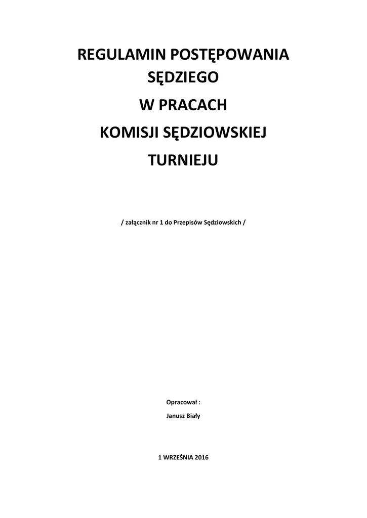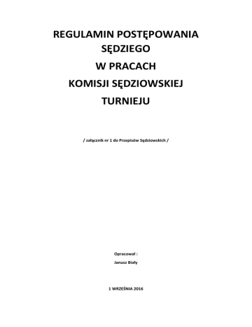 REGULAMIN POSTĘPOWANIA SĘDZIEGO W PRACACH KOMISJI SĘDZIOWSKIEJ TURNIEJU / załącznik nr 1 do Przepisów Sędziowskich / Opracował : Janusz Biały 1 WRZEŚNIA 2016 I POSTĘPOWANIE SĘDZIEGO W PRACACH KOMISJI SĘDZIOWSKIEJ TURNIEJU I Funkcje Sędzia turnieju tańca 1. 2. ocenia rywalizacje taneczną zgłasza sędziemu głównemu wszelkie niezgodności z regulaminami i przepisami rywalizacji, oraz zachowania łamiące zasady fair play 3. swoją postawą dba o wizerunek PTT II Wyznaczenie i powiadamianie sędziego 1. w zależności od rangi turnieju sędzia jest zapraszany przez organizatora lub odpowiednie komisje do tego powołane 2. potwierdzenie zaproszenia, następuje niezwłocznie po zatwierdzeniu składu sędziowskiego przez odpowiedni organ III Postępowanie sędziego 1. Przed turniejem kontaktuje się z sędzią głównym w celu zapoznania się z ustaleniami poczynionymi z organizatorem 2. W dniu turnieju a) zgłasza swoje przybycie organizatorowi sędziemu głównemu najpóźniej na 1 godzinę przed rozpoczęciem turnieju b) uczestniczy w naradzie sędziowskiej przed i po turnieju c) stosuje się do ustalonego dress code d) posiada przy sobie długopis, pióro czy tez inne środki niezbędne do wypełnienia kart sędziowskich e) w czasie sędziowania przebywa w miejscach wyznaczonych dla sędziów- opuszczenie tego miejsca nastąpić może tylko w celu lepszej oceny par f) stosuje się do zaleceń sędziego głównego g) nie przerywa pracy, w wyjątkowych przypadkach konieczność taką ustala z sędzią głównym h) po zakończeniu każdej części turnieju opuszcza swoje stanowisko po informacji od sędziego głównego o zamknięciu procedury przez komisje skrutinerską, i) podpisuje protokół j) wszelkie niezgodności z ustaleniami odnośnie wynagrodzeń, noclegów itp. zgłasza do sędziego głównego, który niezwłocznie podejmuje stosowne kroki,