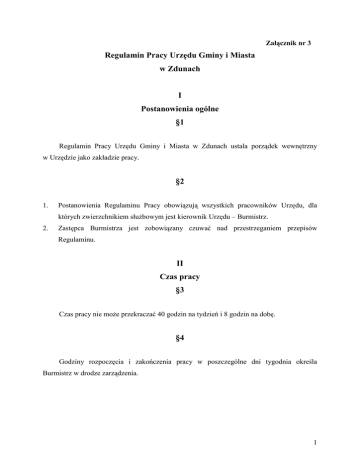 Załącznik nr 3 Regulamin Pracy Urzędu Gminy i Miasta w Zdunach I Postanowienia ogólne §1 Regulamin Pracy Urzędu Gminy i Miasta w Zdunach ustala porządek wewnętrzny w Urzędzie jako zakładzie pracy. §2 1. Postanowienia Regulaminu Pracy obowiązują wszystkich pracowników Urzędu, dla których zwierzchnikiem służbowym jest kierownik Urzędu – Burmistrz. 2. Zastępca Burmistrza jest zobowiązany czuwać nad przestrzeganiem przepisów Regulaminu. II Czas pracy §3 Czas pracy nie może przekraczać 40 godzin na tydzień i 8 godzin na dobę. §4 Godziny rozpoczęcia i zakończenia pracy w poszczególne dni tygodnia określa Burmistrz w drodze zarządzenia. 1 §5 Czas pracy należy wykorzystywać całkowicie na wykonanie zadań służbowych. §6 1. Każdy pracownik po przyjściu do pracy zobowiązany jest podpisać listę obecności. 2. Jako formy kontroli wykorzystania czasu pracy stosuje się: 3. a) listę obecności, b) ewidencję wyjść w godzinach służbowych, c) ewidencję wyjazdów (delegacji służbowych), d) ewidencję zwolnień od pracy oraz okresów nieobecności w pracy, e) ewidencję spóźnień do pracy. Brak podpisu pracownika na liście obecności lub wpisu do ewidencji wyjścia w godzinach pracy oznacza nieobecność wymagającą wyjaśnienia. 4. Listy obecności i zbiory ewidencyjne wyszczególnione w punkcie 2 prowadzi sekretariat. §7 Wyjście pracownika poza Urząd w godzinach pracy jest możliwe po uzyskaniu zgody bezpośredniego przełożonego i dokonaniu odpowiedniego wpisu w książce wyjść. §8 1. W Urzędzie zatrudnia się wyłącznie pracowników dyspozycyjnych. 2. Pracownik jeżeli wymagają tego potrzeby Urzędu, może wykonywać pracę poza normalnymi godzinami pracy na polecenie przełożonego. §9 O udzielenie urlopu, zwolnienia od pracy oraz o usprawiedliwienie nieobecności i spóźnień do pracy decyduje Burmistrz. 2 §10 W czasie pracy pracownikowi przysługuje przerwa na spożycie posiłku (ok. 15 min). Przerwa ta nie może zakłócać normalnego toku pracy (obsługi interesantów). III Obsługa interesantów §11 Interesantów przyjmuje się przez cały czas urzędowania z wyjątkiem kasy, która czynna jest w godzinach ustalonych odrębnie. §12 Posłowie na Sejm, Senatorowie oraz Radni przyjmowani są w pierwszej kolejności. §13 Interesanci zamiejscowi powinni być przyjmowani przed interesantami zamieszkałymi na terenie gminy i miasta. §14 1. Obsługa mieszkańców powinna być rzeczowa i sprawna z zachowaniem zasad uprzejmości. 2. Jeżeli sprawa wymaga uzupełnienia dodatkowych dokumentów lub wniesienia opłaty skarbowej, czynności te wykonuje pracownik. Pracownik odpowiedzialny jest również za potwierdzenie otrzymania dokumentu (podania lub wniosku) 3 IV Zabezpieczenie akt i mienia Urzędu §15 1. Akta, pieczątki, maszyny i inne przedmioty (urządzenia służbowe) powinny być zabezpieczone (zamknięte) przed dostępem osób postronnych. 2. Zabrania dokumentów oraz wyposażenia poza teren Urzędu wymaga zgody bezpośredniego przełożonego. §16 Pracownik opuszczający jako ostatni lokal biurowy obowiązany jest zamknąć ten lokal a klucz umieścić w przeznaczonej na ten cel gablocie (miejscu). §17 1. Zezwoleń na pozostawanie w biurze poza godzinami pracy, udziela Burmistrz lub jego Zastępca. 2. Pracownik, który uzyskał zezwolenie pozostania w biurze poza godzinami służbowymi, obowiązany jest zgłosić sprzątaczce, że po skończonej pracy opuszcza biuro. §18 Pracownicy są informowani o osobach posiadających klucze do budynku Urzędu. Informacje te stanowią tajemnice służbową. V Obowiązki i uprawnienia §19 Pracownicy są odpowiedzialni przed Burmistrzem za wykonanie zadań określonych dla poszczególnych stanowisk, a w szczególności za: 4 – zgodność z prawem opracowanych projektów decyzji, – przygotowanie projektów zarządzeń, uchwał pod obrady Rady Miejskiej – właściwe przyjmowanie i załatwianie interesantów, – terminowe załatwianie spraw, – dokładną znajomość przepisów prawnych w zakresie obowiązującym na danym stanowisku pracy. Zasady i tryb postępowania ze sprawami wniesionymi do Urzędu reguluje kodeks postępowania administracyjnego, instrukcja kancelaryjna oraz przepisy szczególnie dotyczące prowadzenia określonych spraw. Do podstawowych obowiązków pracowników należy: 1) realizacja zadań wspólnych wynikających z regulaminu organizacyjnego, 2) sumienne, rzetelne i bezstronne wykonywanie powierzonych zadań, 3) przestrzeganie ustalonego w zakładzie pracy czasu pracy i porządku, 4) zachowanie tajemnicy w każdym przypadku gdy dobro tego wymaga, 5) zachowanie uprzejmości i życzliwości w kontaktach ze zwierzchnikiem, podwładnym i współpracownikami, 6) zachowanie szczególnej grzeczności w kontaktach z mieszkańcami, 7) zachowanie się z godnością w pracy i poza nią, 8) staranny i estetyczny ubiór. §20 Ustawowe obowiązki pracowników określa ustawa z dnia 22 marca 1990r. o pracownikach samorządowych (Dz. U. Nr 21 poz.124 z późniejszymi zmianami). §21 Obowiązki pracodawcy: 1) należyta organizacja pracy, 2) umożliwienie pracownikom podnoszenia kwalifikacji i szkolenia ich, 3) prezentacja nowo przyjętego pracownika, 4) terminowe wypłacanie wynagrodzenia oraz innych świadczeń, 5) stosowanie kar dyscyplinarnych w każdym przypadku zaniedbania obowiązków, 5 5a) zaznajomienie pracowników z obowiązkami dotyczącymi bezpieczeństwa i higieny pracy oraz ochrony przeciwpożarowej, 6. organizowanie spotkań z pracownikami w celu omówienia spraw dotyczących Urzędu, §22 Pracownik uprawniony jest do: 1) otrzymania urlopu zgodnie z planem urlopu zatwierdzonym najpóźniej do 15 stycznia na dany rok kalendarzowy, 2) do awansu, jeżeli praca wykonywana jest nienagannie i co zostało stwierdzone coroczną oceną, 3) do urlopu okolicznościowego w przypadkach określonych Rozporządzeniem Rady Ministrów w sprawach regulaminów pracy z 20 grudni