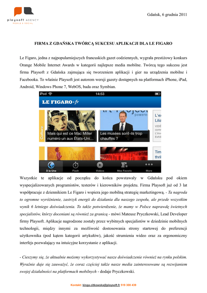 Gdańsk, 6 grudnia 2011 FIRMA Z GDAŃSKA TWÓRCĄ SUKCESU APLIKACJI DLA LE FIGARO Le Figaro, jedna z najpopularniejszych francuskich gazet codziennych, wygrała prestiżowy konkurs Orange Mobile Internet Awards w kategorii najlepsze media mobilne. Twórcą tego sukcesu jest firma Playsoft z Gdańska zajmująca się tworzeniem aplikacji i gier na urządzenia mobilne i Facebooka. To właśnie Playsoft jest autorem wersji gazety dostępnych na platformach iPhone, iPad, Android, Windows Phone 7, WebOS, bada oraz Symbian. Wszystkie te aplikacje od początku do końca powstawały w Gdańsku pod okiem wyspecjalizowanych programistów, testerów i kierowników projektu. Firma Playsoft już od 3 lat współpracuje z dziennikiem Le Figaro i wspiera jego mobilną strategię marketingową. - Ta nagroda to ogromne wyróżnienie, zastrzyk energii do działania dla naszego zespołu, ale przede wszystkim wynik 6 letniego doświadczenia. To także potwierdzenie, że mamy w Polsce naprawdę świetnych specjalistów, którzy doceniani są również za granicą - mówi Mateusz Pryczkowski, Lead Developer firmy Playsoft. Aplikacje nagrodzone zostały przez wybitnych specjalistów w dziedzinie mobilnych technologii, między innymi za możliwość dostosowania strony startowej do preferencji użytkownika (pod kątem kategorii artykułów), jakość strumienia wideo oraz za ergonomiczny interfejs pozwalający na intuicyjne korzystanie z aplikacji. - Cieszymy się, że aktualnie możemy wykorzystywać nasze doświadczenie również na rynku polskim. Wyraźnie daje się zauważyć, że coraz częściej także nasze media zainteresowane są rozwijaniem swojej działalności na platformach mobilnych - dodaje Pryczkowski. Kontakt: [email protected] 519 300 439