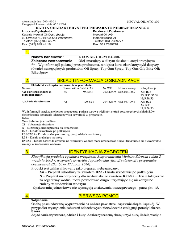 Aktualizacja dnia: 2004-05-31 Zastępuje dokument z dnia: 05.05.2004 NEOVAL OIL MTO-200 KARTA CHARAKTERYSTYKI PREPARATU NIEBEZPIECZNEGO Importer/Dystrybutor: Katanja Neoval Oil Dystrybucja ul. Łowicka 19/14; 02-584 Warszawa Telefon: (022) 845 45 71 Fax: (022) 845 44 16 Producent/Dostawca: Neoval Oil AG Homelstrasse 21 Telefon: 061 7359777 Fax: 061 7359778 1. Nazwa handlowa** NEOVAL OIL MTO-200. Olej smarujący o silnym działaniu antykorozyjnym Zalecane zastosowanie ** - Wg informacji podanej przez producenta, niniejsza karta charakterystyki dotyczy również następujących produktów: Oil Spray; Top Gun Spray; Top Gun Oil; Bike Oil; Bike Spray 2. SKŁAD I INFORMACJA O SKŁADNIKACH Składniki niebezpieczne zawarte w produkcie: Zawartość w % Nr CAS 1,2-dichlorobenzen; o<5 95-50-1 Nazwa Klasyfikacja Xn; R22 dichlorobenzen Xi; R36/37/38 N; R50/53 1,2,4-trichlorobenzen <2 120-82-1 204-428-0 602-087-00-6 Xn; R22 Xi; R38 N; R50/53 Wg informacji przekazanej przez producenta, podane typowe wielkości stężeń poszczególnych składników niekoniecznie oznaczają ich rzeczywistą zawartość w preparacie. Gdzie: Xn – Substancja szkodliwa Xi – Substancja drażniąca N – Substancja niebezpieczna dla środowiska R22 – Działa szkodliwie po połknięciu R36/37/38 – Działa drażniąco na oczy, drogi oddechowe i skórę R38 – Działa drażniąco na skórę R50/53 – Działa bardzo toksycznie na organizmy wodne; może powodować długo utrzymujące się niekorzystne zmiany w środowisku wodnym 3. Nr WE Nr indeksowy 202-425-9 602-034-00-7 IDENTYFIKACJA ZAGROŻEŃ Klasyfikacja produktu zgodnie z przepisami Rozporządzenia Ministra Zdrowia z dnia 2 września 2003 r. w sprawie kryteriów i sposobu klasyfikacji substancji i preparatów chemicznych (Dz. U. nr 171, poz. 1666): Produkt jest zaklasyfikowany jako preparat niebezpieczny: Xn – Preparat szkodliwy ze zwrotem R22 - Działa szkodliwie po połknięciu N – Preparat niebezpieczny dla środowiska ze zwrotem R51/53 – Działa toksycznie na organizmy wodne; może powodować długo utrzymujące się niekorzystne zmiany w środowisku wodnym Opakowania jednostkowe nie wymagają znakowania ostrzegawczego - patrz pkt. 15. 4. PIERWSZA POMOC Wdychanie Osobę poszkodowaną wyprowadzić na świeże powietrze, zapewnić ciepło i spokój. W przypadku wystąpienia zaburzeń oddechowych niezwłocznie zasięgnąć porady lekarza. Skóra Zdjąć zanieczyszczoną odzież i buty. Zanieczyszczoną skórę umyć dużą ilością wody z NEOVAL OIL MTO-200 Strona 1 z 9 4. PIERWSZA POMOC mydłem. Nie stosować rozpuszczalników ani rozcieńczalników. Zasięgnąć porady lekarza w razie potrzeby. Zabrudzoną odzież i buty oczyścić przed ponownym użyciem. Oczy Wyjąć szkła kontaktowe. Niezwłocznie płukać oczy delikatnym strumieniem wody przy podwiniętych powiekach przez co najmniej 15 minut. Zasięgnąć porady lekarza okulisty w przypadku utrzymywania się dolegliwości. Połknięcie Wypłukać usta wodą. Nie wywoływać wymiotów bez zaleceń lekarza. Osobom nieprzytomnym nigdy nie podawać żadnych środków doustnie. Zasięgnąć niezwłocznie porady lekarza. Pokaż opakowanie lub etykietę produktu. Osobę nieprzytomną ułożyć i transportować w pozycji bocznej ustalonej. 5. POSTĘPOWANIE W PRZYPADKU POŻARU Zalecane środki gaśnicze: Pożary zwalczać pianą, dwutlenkiem węgla. Zagrożone pożarem zbiorniki usunąć, jeśli to możliwe i nie wiąże się z nadmiernym ryzykiem lub chłodzić rozpyloną wodą z bezpiecznej odległości. Nieodpowiednie środki gaśnicze: Nie stosować zwartych strumieni wody. Szczególne zagrożenie ze strony produktów spalania i wydzielających się gazów: Podczas pożaru mogą wytwarzać się produkty spalania i rozkładu termicznego preparatu zawierające tlenek węgla, dwutlenek węgla, chlorowodór. Nie wdychać dymów i oparów wytwarzających się podczas pożaru. Nie dopuszczać do spływania zużytych środków gaśniczych do kanalizacji i wód powierzchniowych. Specjalne wyposażenie ochronne strażaków: W razie potrzeby nosić izolacyjne aparaty oddechowe z niezależnym źródłem powietrza i kombinezony ochronne. 6. POSTĘPOWANIE W PRZYPADKU NIEZAMIERZONEGO UWOLNIENIA DO ŚRODOWISKA Indywidualne środki ostrożności: Zapewnić odpowiednią wentylację. Unikać zanieczyszczenia skóry. Usunąć osoby postronne i nieupoważnione. Patrz także punkt 7 i 8. Środki ostrożności w zakresie ochrony środowiska: Nie dopuszczać do przedostawania się produktu do kanalizacji, wód powierzchniowych i wód gruntowych. Metody oczyszczania/usuwania: Zatrzymać wyciek produktu, jeśli nie wiąże się to z nadmiernym ryzykiem. Wycieki zasypać materiałem pochłaniającym ciecze, piasek, ziemia, ziemia okrzemkowa i zebrać mechanicznie do oznakowanych pojemników na odpady. Następnie usuwać zgodnie z zaleceniami przedstawionymi w punkcie 13. 7. POSTĘPOWANIE Z PREPARATEM I JEGO MAGAZYNOWANIE Postępowanie z preparatem Unikać zanieczyszczenia oczu, skóry i odzieży. Nosić odpowiednie środki ochrony indywidualnej. Nie wdychać par i oparów. Zapewnić odpowiednią wentylację. Magazynowanie Przechowywać w oryginalnych zamkniętych pojemnikach. Chronić przed mrozem i bezpośrednim światłem słonecznym. Przechowywać z dala od źródeł zapłonu, otwartego ognia, iskier – nie palić tytoniu. Nie przechowywać razem z żywnością, napojami lub NEOVAL OIL MTO-200 Strona 2 z 9 7. POSTĘPOWANIE Z PREPARATEM I JEGO MAGAZYNOWANIE paszą. 8. KONTROLA NARAŻENIA I ŚRODKI OCHRONY INDYWIDUALNEJ Dodatkowe zalecenia w zakresie środków inżynieryjnych: Zapewnić odpowiednią wentylację pomieszczeń roboczych. Parametry kontroli narażenia: Rozporządzenie Ministra Pracy i Polityki Społecznej z dnia 29 listopada 2002 roku w sprawie najwyższych dopuszczalnych stężeń i natężeń czynników szkodliwych dla zdrowia w środowisku pracy (Dz. U. nr 217 2002 r., poz. 1833): 1,2-Dichlorobenzen (CAS 95-50