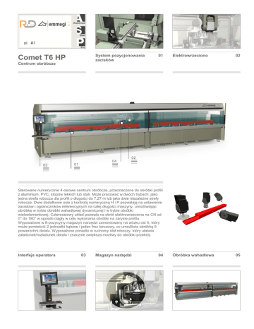 pl #1 System pozycjonowania zacisków Comet T6 HP Centrum obróbcze 01 Elektrowrzeciono 02 Obróbka wahadłowa 05 02 03 04 01 Sterowane numerycznie 4-osiowe centrum obróbcze, przeznaczone do obróbki profili z aluminium, PVC, stopów lekkich lub stali. Może pracować w dwóch trybach: jako jedna strefa robocza dla profili o długości do 7,27 m lub jako dwie niezależne strefy robocze. Dwie dodatkowe osie z kontrolą numeryczną H i P pozwalają na ustawienie zacisków i ograniczników referencyjnych na całej długości maszyny, umożliwiając obróbkę w trybie obróbki wahadłowej dynamicznej i w trybie obróbki wieloelementowej. Czteroosiowy układ pozwala na obrót elektrowrzeciona na CN od 0° do 180° w sposób ciągły w celu wykonania obróbki na zarysie profilu. Wyposażone w 8-pozycyjny magazyn narzędzi zamontowany na wózku osi X, który może pomieścić 2 jednostki kątowe i jeden frez tarczowy, co umożliwia obróbkę 5 powierzchni detalu. Wyposażone ponadto w ruchomy stół roboczy, który ułatwia załadunek/rozładunek detalu i znacznie zwiększa możliwy do obróbki przekrój. Interfejs operatora 03 Magazyn narzędzi 04 Comet T6 HP Centrum obróbcze 01 02 03 04 05 System pozycjonowania zacisków Elektrowrzeciono Interfejs operatora Magazyn narzędzi Obróbka wahadłowa Pozycjonowanie zespołów zaciskowych odbywa się za pomocą dwóch osi H oraz P sterowanych numerycznie i jest niezależne od osi X Na osiach H i P umieszczone są zderzaki referencyjne. Takie rozwiązanie pozwala na ustawienie ograniczników wzdłuż całej długości maszyny do pracy w trybie obróbki wieloelementowej z jednym elementem na jedną parę zacisków. Poza tym, ustawienie zacisków następuje niezależnie od warunków roboczych osi X, pozwalając na obróbkę wahadłową dynamiczną z ustawieniem osi w czasie ukrytym. Elektrowrzeciono o mocy 8 kW S1 i o wysokim momencie obrotowym umożliwia prowadzenie także ciężkiej obróbki, w produkcji przemysłowej. Obrót elektrowrzeciona wzdłuż osi A pozwala na wykonanie obrotów od 0° do 180° umożliwiając, w ten sposób, obróbki na 3 płaszczyznach profilu, bez konieczności zmiany jego pozycji. Centrum może być używane zarówno do obróbki profili stalowych, jak i profili aluminiowych, dzięki zastosowaniu ustawianej programowo instalacji smarującej, której podwójny zbiornik umożliwia podawanie oleju z minimalną dyfuzją i emulsji olejowej w postaci mikromgły. Interfejs posiada 15 calowy dotykowy ekran zawieszony na regulowanym totemie umożliwiając dopasowanie go w zależności od potrzeb operatora. Przyjazne dla użytkownika oprogramowanie sprawia, że interfejs jest prosty i intuicyjny. Pulpit jest zintegrowany z myszką, klawiaturą i portem USB ze względu na ich położenie z przodu gwarantują łatwy dostęp. Magazyn narzędziowy zintegrowany z osią X, umieszczony w pozycji cofniętej względem elektrowrzeciona, umożliwia zdecydowane skrócenie czasu operacji wymiany narzędzi. Jest to szczególnie użyteczne przy obróbce długich elementów, gdyż pozwala uniknąć ruchu powrotnego do magazynu, który przemieszcza się wraz z wrzecionem do kolejnych pozycji. Magazyn może pomieścić do ośmiu uchwytów narzędziowych wraz z narzędziami, których konfiguracja zależy od operatora. Każda pozycja uchwytu narzędziowego zabezpieczona jest czujnikiem, który kontroluje prawidłowe ustawienie stożka. Innowacyjny system pracy, który umożliwia ograniczenie do minimum czasu postojów maszyny w fazach załadunku i rozładunku obrabianych elementów. System ten pozwala na prowadzenie zarówno załadunku jak i późniejszej obróbki elementów o różnych długościach, kodach i obróbkach, jednocześnie w dwóch niezależnych strefach roboczych. Podczas, gdy maszyna obrabia detal w jednej strefie operator zakłada element w drugiej. Pozwala to w znaczący sposób skrócić czas produkcyjny. Obróbka Wieloelementowa Obróbka Jednoelementowa Obróbka Wahadłowa POSUW OSI OŚ X (wzdłużna) (mm) OŚ Y (poprzeczna) (mm) OŚ Z (pionowa) (mm) OŚ A (obrót wrzeciona) 7.700 470 420 0° 180° OŚ H (system pozycjonowania zacisków strefy pr) (mm) 3.800 OŚ P (system pozycjonowania zacisków strefy lw) (mm) 3.800 ELEKTROWRZECIONO Moc maksymalna S1 (kW) Maksymalna prędkość obrotowa (obr/min) Stożek zaciskowy 8 24.000 HSK - 63F Automatyczny zaczep uchwytu narzędziowego ● Chłodzenie powietrzem za pomocą wentylatora elektrycznego ● AUTOMATYCZNY MAGAZYN NARZĘDZI ZAMONTOWANY NA WÓZKU Maksymalna liczba narzędzi w magazynie Maksymalna liczba głowic kątowych, jaką można umieścić w magazynie Maksymalna średnica tarczy, jaką można umieścić w magazynie (mm) 8 2 Ø = 180 FUNKCJE Tryb obróbki wieloelementowej ● Tryb obróbki wahadłowej dynamicznej ● OBRABIANE POWIERZCHNIE Narzędziem mocowanym bezpośrednio (powierzchnia górna, powierzchnie boczne) Głowicą kątową (powierzchnie boczne, czołowe) Tarczą tnącą (powierzchnia górna, powierzchnie boczne i czołowe) 3 2+2 1+2+2 GWINTOWANIE Z kompensacją M8 Gwintowanie sztywne (opcjonalnie) M10 BLOKADA DETALU Standardowa liczba zacisków 8 Maksymalna liczba zacisków 12 Automatyczne pozycjonowanie zacisków za pomocą osi H i P ● Maksymalna liczba zacisków w strefie 6 2009/10/05 www.randdtech.pl