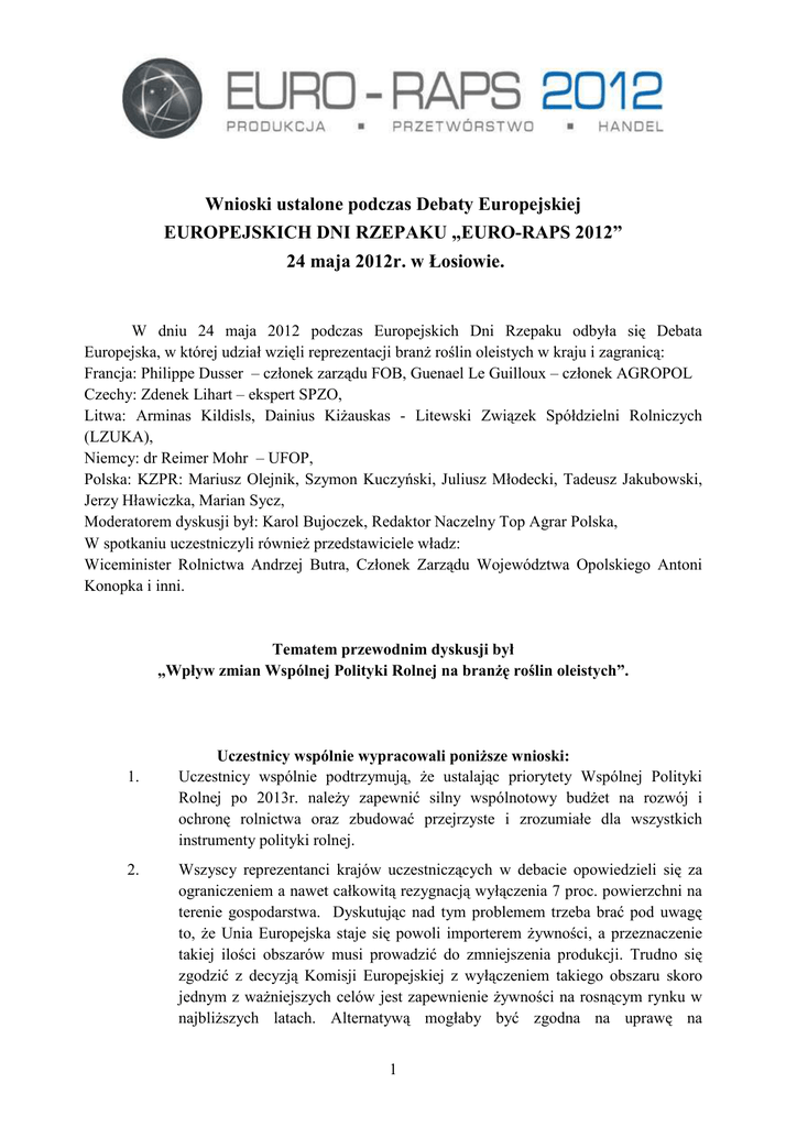 Wnioski ustalone podczas Debaty Europejskiej EUROPEJSKICH DNI RZEPAKU „EURO-RAPS 2012” 24 maja 2012r. w Łosiowie. W dniu 24 maja 2012 podczas Europejskich Dni Rzepaku odbyła się Debata Europejska, w której udział wzięli reprezentacji branż roślin oleistych w kraju i zagranicą: Francja: Philippe Dusser – członek zarządu FOB, Guenael Le Guilloux – członek AGROPOL Czechy: Zdenek Lihart – ekspert SPZO, Litwa: Arminas Kildisls, Dainius Kiżauskas - Litewski Związek Spółdzielni Rolniczych (LZUKA), Niemcy: dr Reimer Mohr – UFOP, Polska: KZPR: Mariusz Olejnik, Szymon Kuczyński, Juliusz Młodecki, Tadeusz Jakubowski, Jerzy Hławiczka, Marian Sycz, Moderatorem dyskusji był: Karol Bujoczek, Redaktor Naczelny Top Agrar Polska, W spotkaniu uczestniczyli również przedstawiciele władz: Wiceminister Rolnictwa Andrzej Butra, Członek Zarządu Województwa Opolskiego Antoni Konopka i inni. Tematem przewodnim dyskusji był „Wpływ zmian Wspólnej Polityki Rolnej na branżę roślin oleistych”. 1. 2. Uczestnicy wspólnie wypracowali poniższe wnioski: Uczestnicy wspólnie podtrzymują, że ustalając priorytety Wspólnej Polityki Rolnej po 2013r. należy zapewnić silny wspólnotowy budżet na rozwój i ochronę rolnictwa oraz zbudować przejrzyste i zrozumiałe dla wszystkich instrumenty polityki rolnej. Wszyscy reprezentanci krajów uczestniczących w debacie opowiedzieli się za ograniczeniem a nawet całkowitą rezygnacją wyłączenia 7 proc. powierzchni na terenie gospodarstwa. Dyskutując nad tym problemem trzeba brać pod uwagę to, że Unia Europejska staje się powoli importerem żywności, a przeznaczenie takiej ilości obszarów musi prowadzić do zmniejszenia produkcji. Trudno się zgodzić z decyzją Komisji Europejskiej z wyłączeniem takiego obszaru skoro jednym z ważniejszych celów jest zapewnienie żywności na rosnącym rynku w najbliższych latach. Alternatywą mogłaby być zgodna na uprawę na 1 wyłączonych obszarach roślin strączkowych z wyeliminowaniem stosowania azotu mineralnego. 3. Kraje Europy Środkowej i Wschodniej poparły kwestie odejścia od obecnego systemu płatności bezpośrednich oraz wprowadzenia daleko idącego uproszczenia i ujednolicenia tego systemu we wszystkich państwach członkowskich. Przedstawiciele z Niemiec i Francji nie mają nic przeciwko temu, pod warunkiem, że będzie to możliwe w zaplanowanym budżecie dotyczącym I i II filaru. Zdaniem KZPR wyrównanie to powinno nastąpić od 2014 roku. Zrównanie dopłat bezpośrednich stworzy warunki równej konkurencji pomiędzy krajami członkowskimi. 4. W sytuacji kiedy aż 2/3 oleju rzepakowego przeznaczone jest na produkcję biodiesla dla utrzymania opłacalności tej uprawy niezbędne jest zapewnienie instrumentów wspierających wzrost zapotrzebowania na biodiesel, a ziemię należy traktować wręcz jak pola roponośne. 5. W dyskusji pojawił się nowy wątek bilansu emisji gazów cieplarnianych i ich wyliczenia w rolnictwie. Problem nie dotyczy kwestii regulacji a samego modelu wyliczania emisji szkodliwych gazów, który obecnie jest wadliwy. Można produkować biopaliwa w sposób zrównoważony, nie ponosząc odpowiedzialności za pośrednią zmianę użytkowania gruntów w krajach trzecich. Wprowadzenie proponowanych regulacji spowoduję zamknięcie się rynków oraz może być przyczyną spadku cen rzepaku. 6. Nadal należy wspierać działania promujące produkcję rzepaku na cele spożywcze poprzez propagowanie oleju rzepakowego, jako produktu o właściwościach zdrowotnych. Według badań tylko olej rzepakowy, cechuje się idealnym z punktu widzenia potrzeb żywieniowych stosunkiem kwasów omega6 do omega-3, tj. 2:1. 7. Uczestnicy podtrzymali wniosek, że nadal należy tworzyć instrumenty stabilizujące dochody rolników w wyjątkowych, trudnych sytuacjach na rynkach. Nowe regulacje powinny być nakierowane na ograniczenie zagrożeń wynikających ze zmienności produkcji i dochodów. 8. Producenci rolni podtrzymują dalszą potrzebę tworzenia i wsparcia grup producentów rolnych oraz systemu spółdzielczego. 9. Istnieje silna potrzeba dalszego organizowania wspólnych, międzynarodowych spotkań, debat takich jak Europejskich Dni Rzepaku Euro Raps 2012, w celu wypracowania wspólnego stanowiska. KZPR UFOP SPZO FOB LZUKA AGROPOL 2