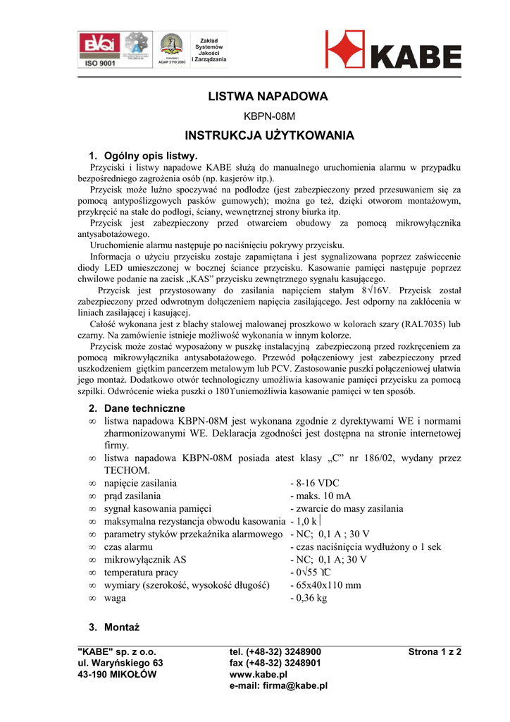 LISTWA NAPADOWA KBPN-08M INSTRUKCJA UŻYTKOWANIA 1. Ogólny opis listwy. Przyciski i listwy napadowe KABE służą do manualnego uruchomienia alarmu w przypadku bezpośredniego zagrożenia osób (np. kasjerów itp.). Przycisk może luźno spoczywać na podłodze (jest zabezpieczony przed przesuwaniem się za pomocą antypoślizgowych pasków gumowych); można go też, dzięki otworom montażowym, przykręcić na stałe do podłogi, ściany, wewnętrznej strony biurka itp. Przycisk jest zabezpieczony przed otwarciem obudowy za pomocą mikrowyłącznika antysabotażowego. Uruchomienie alarmu następuje po naciśnięciu pokrywy przycisku. Informacja o użyciu przycisku zostaje zapamiętana i jest sygnalizowana poprzez zaświecenie diody LED umieszczonej w bocznej ściance przycisku. Kasowanie pamięci następuje poprzez chwilowe podanie na zacisk „KAS” przycisku zewnętrznego sygnału kasującego. Przycisk jest przystosowany do zasilania napięciem stałym 8÷16V. Przycisk został zabezpieczony przed odwrotnym dołączeniem napięcia zasilającego. Jest odporny na zakłócenia w liniach zasilającej i kasującej. Całość wykonana jest z blachy stalowej malowanej proszkowo w kolorach szary (RAL7035) lub czarny. Na zamówienie istnieje możliwość wykonania w innym kolorze. Przycisk może zostać wyposażony w puszkę instalacyjną zabezpieczoną przed rozkręceniem za pomocą mikrowyłącznika antysabotażowego. Przewód połączeniowy jest zabezpieczony przed uszkodzeniem giętkim pancerzem metalowym lub PCV. Zastosowanie puszki połączeniowej ułatwia jego montaż. Dodatkowo otwór technologiczny umożliwia kasowanie pamięci przycisku za pomocą szpilki. Odwrócenie wieka puszki o 180° uniemożliwia kasowanie pamięci w ten sposób. 2. Dane techniczne • listwa napadowa KBPN-08M jest wykonana zgodnie z dyrektywami WE i normami zharmonizowanymi WE. Deklaracja zgodności jest dostępna na stronie internetowej firmy. • listwa napadowa KBPN-08M posiada atest klasy „C” nr 186/02, wydany przez TECHOM. • napięcie zasilania - 8-16 VDC • prąd zasilania - maks. 10 mA • sygnał kasowania pamięci - zwarcie do masy zasilania • maksymalna rezystancja obwodu kasowania - 1,0 kΩ • parametry styków przekaźnika alarmowego - NC; 0,1 A ; 30 V • czas alarmu - czas naciśnięcia wydłużony o 1 sek • mikrowyłącznik AS - NC; 0,1 A; 30 V • temperatura pracy - 0÷55 °C • wymiary (szerokość, wysokość długość) - 65x40x110 mm • waga - 0,36 kg 3. Montaż "KABE" sp. z o.o. ul. Waryńskiego 63 43-190 MIKOŁÓW tel. (+48-32) 3248900 fax (+48-32) 3248901 www.kabe.pl e-mail: [email protected] Strona 1 z 2 Listwa napadowa KBPN-08M Instrukcja użytkowania Wykonanie podstawowe: • zwolnić zaczep pokrywy i zdjąć wieko przycisku. • położyć lub przykręcić przycisk w miejscu pracy. wykonać połączenia elektryczne wg. opisu zacisków połączeniowych. założyć wieko przycisku sprawdzić działanie przycisku – sprawność obwodu AS transmisję przyciśnięcia do centrali alarmowej, zadziałanie oraz kasowanie pamięci. • • • Wykonanie z puszką instalacyjną: • • • • • położyć lub przykręcić przycisk w miejscu pracy. przykręcić puszkę instalacyjną do ściany wykonać połączenia elektryczne wg. opisu zacisków połączeniowych. zamknąć puszkę połączeniową. Odwrócenie pokrywy o 180° uniemożliwi dostęp do przycisku kasowania pamięci. sprawdzić działanie przycisku – transmisję przyciśnięcia do centrali alarmowej, zadziałanie oraz kasowanie pamięci. UWAGI: 1. Pozostawienie potencjału masy na wejściu kasującym wyłączy opcję pamięci nie zmieniając parametrów toru sygnałowego. 2. Pozostawienie potencjału masy na wejściu kasującym zwiększy pobór prądu o 1 mA. 4. Opis zacisków wyprowadzeń: obwód PCB +12V GND LINE LINE AS AS KAS puszka instalacyjna +U -U LINE LINE AS C AS N RESET Ekran kolor przewodu czerwony czarny (szary) niebieski żółty biały (fioletowy) zielony pomarańczowy (różowy) oplot przewodu opis +12 V masa wyjście sygnału NC wyjście sygnału NC antysabotaż NC antysabotaż NC, NO kasowanie pamięci Ekran 5. Obsługa i konserwacja. W trakcie eksploatacji przycisku należy: • • • • • zapewnić swobodny dostęp do przycisku nie odkładać w pobliżu przycisku przedmiotów, które mogłyby spowodować jego zadziałanie (np. przewrócenie położonej obok torby) chronić przycisk przed zalaniem wodą (np. podczas mycia podłogi) przycisk można przetrzeć wilgotną szmatką, pamiętając że przyciśnięcie wywoła alarm. konserwację przycisku zaleca się powierzyć instalatorowi ESA; powinna obejmować wywołanie alarmu, wywołanie alarmu sabotażowego, kontrolę sprawności pamięci oraz kasowanie pamięci, wyczyszczenie powłok lakierniczych. Mikołów, wrzesień 2004 opracował: Dariusz Koczar sprawdził: Krzysztof Cyganek Strona 2 z 2 LISTWA NAPADOWA KBPN-08M INSTRUKCJA UŻYTKOWANIA 6. Ogólny opis listwy. Przyciski i listwy napadowe KABE służą do manualnego uruchomienia alarmu w przypadku bezpośredniego zagrożenia osób (np. kasjerów itp.). Przycisk może luźno spoczywać na podłodze (jest zabezpieczony przed przesuwaniem się za pomocą antypoślizgowych pasków gumowych); można go też, dzięki otworom montażowym, przykręcić na stałe do podłogi, ściany, wewnętrznej strony biurka itp. Przycisk jest zabezpieczony przed otwarciem obudowy za pomocą mikrowyłącznika antysabotażowego. Uruchomienie alarmu następuje po naciśnięciu pokrywy przycisku. Informacja o użyciu przycisku zostaje zapamiętana i jest sygnalizowana poprzez zaświecenie diody LED umieszczonej w bocznej ściance przycisku. Kasowanie pamięci następuje poprzez chwilowe podanie na zacisk „KAS” przycisku zewnętrznego sygnału kasującego. Przycisk jest przystosowany do zasilania napięciem stałym 8÷16V. Przycisk został zabezpieczony przed odwrotnym dołączeniem napięcia zasilającego